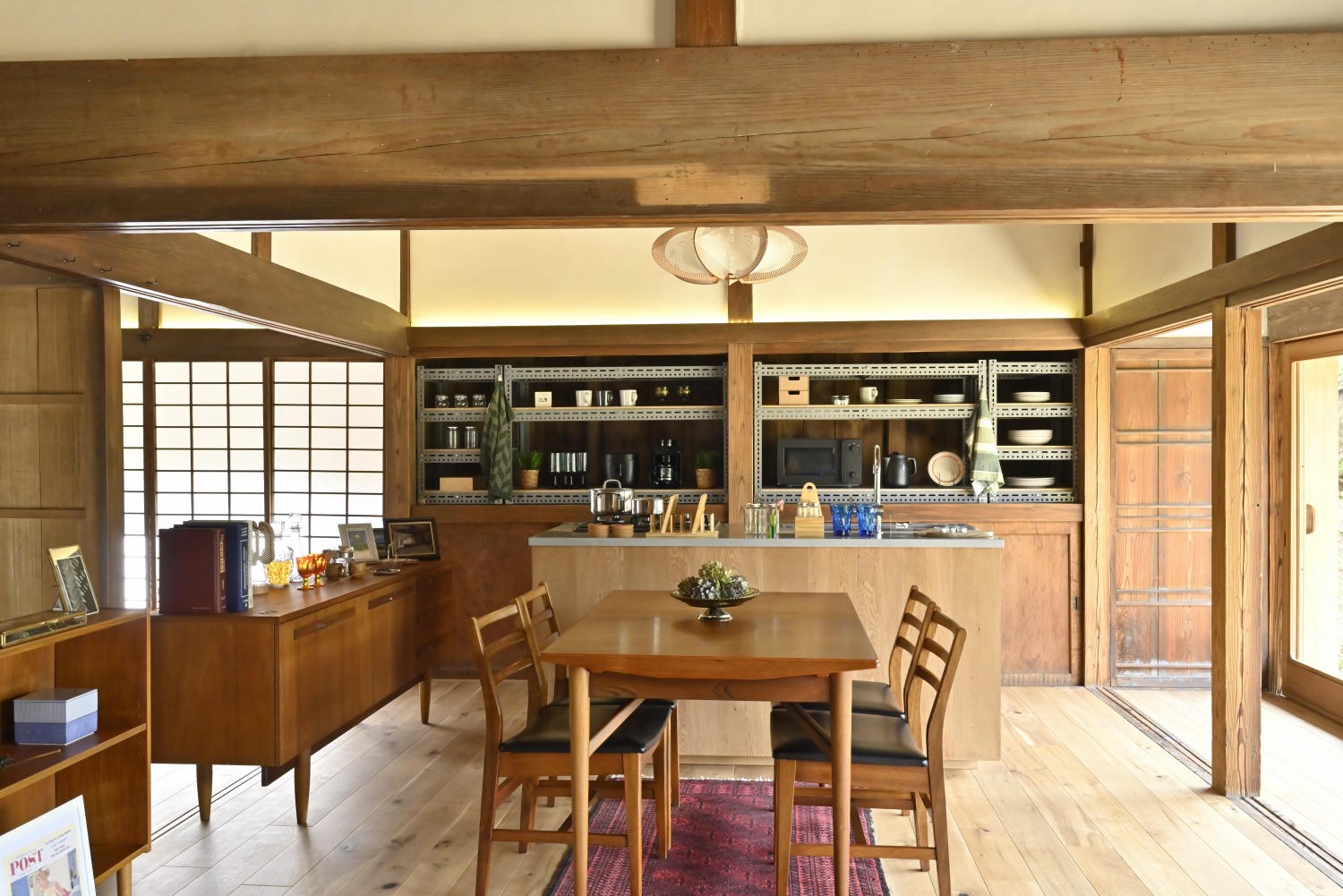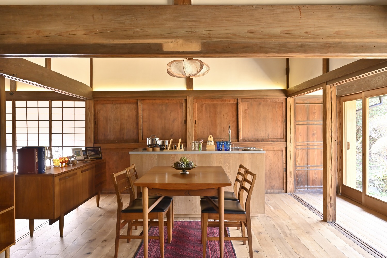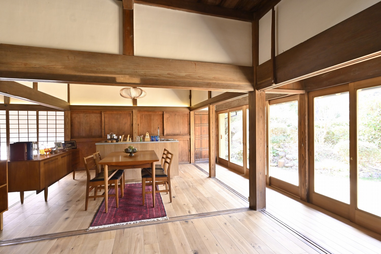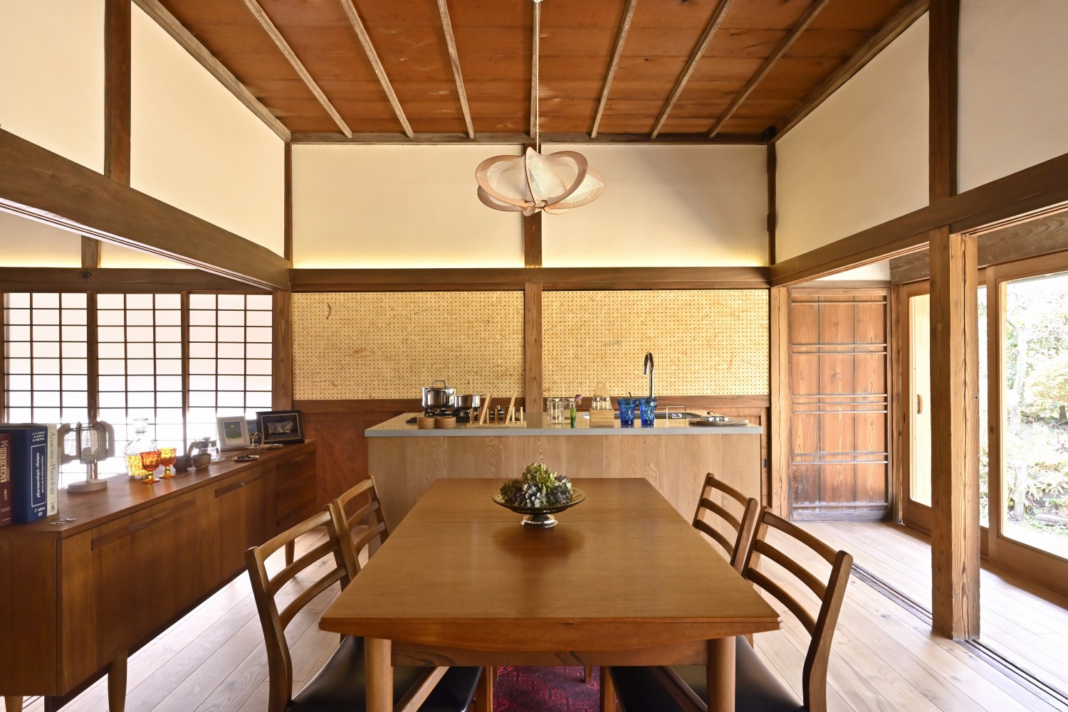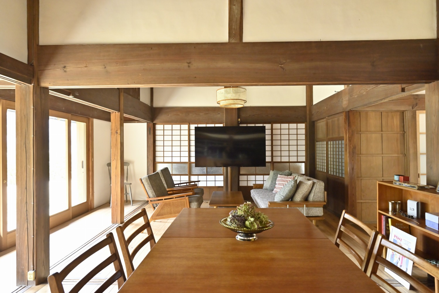 梁や柱はそのまま残し、畳をフローリングに張り替えるなど、伝統の趣を活かしつつ現代的な撮影空間として丁寧にリノベーションされています。縁側には木製建具を再利用し、古材ならではの質感が柔らかな光と調和。家具や照明はミッドセンチュリーを基調に統一され、和と洋が自然に溶け合う空間に仕上がっています。