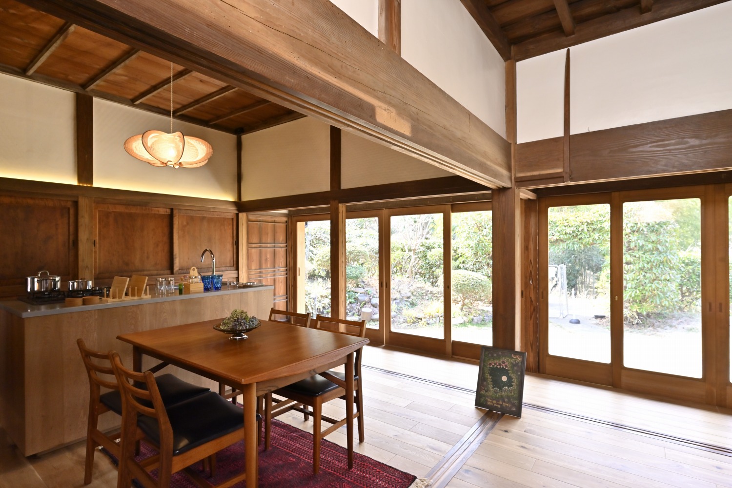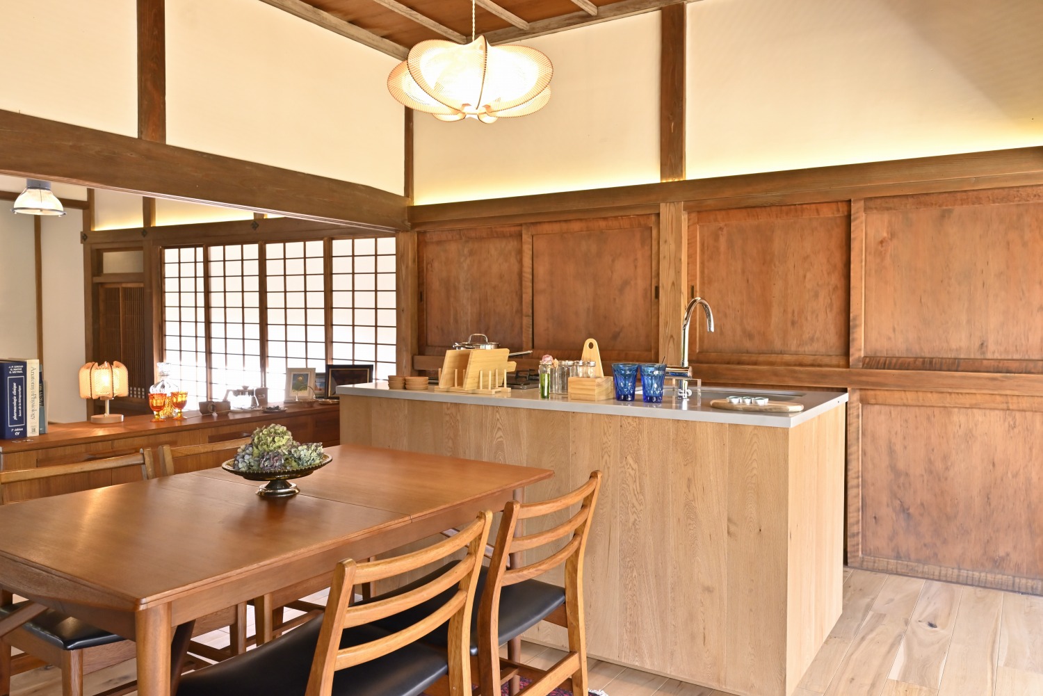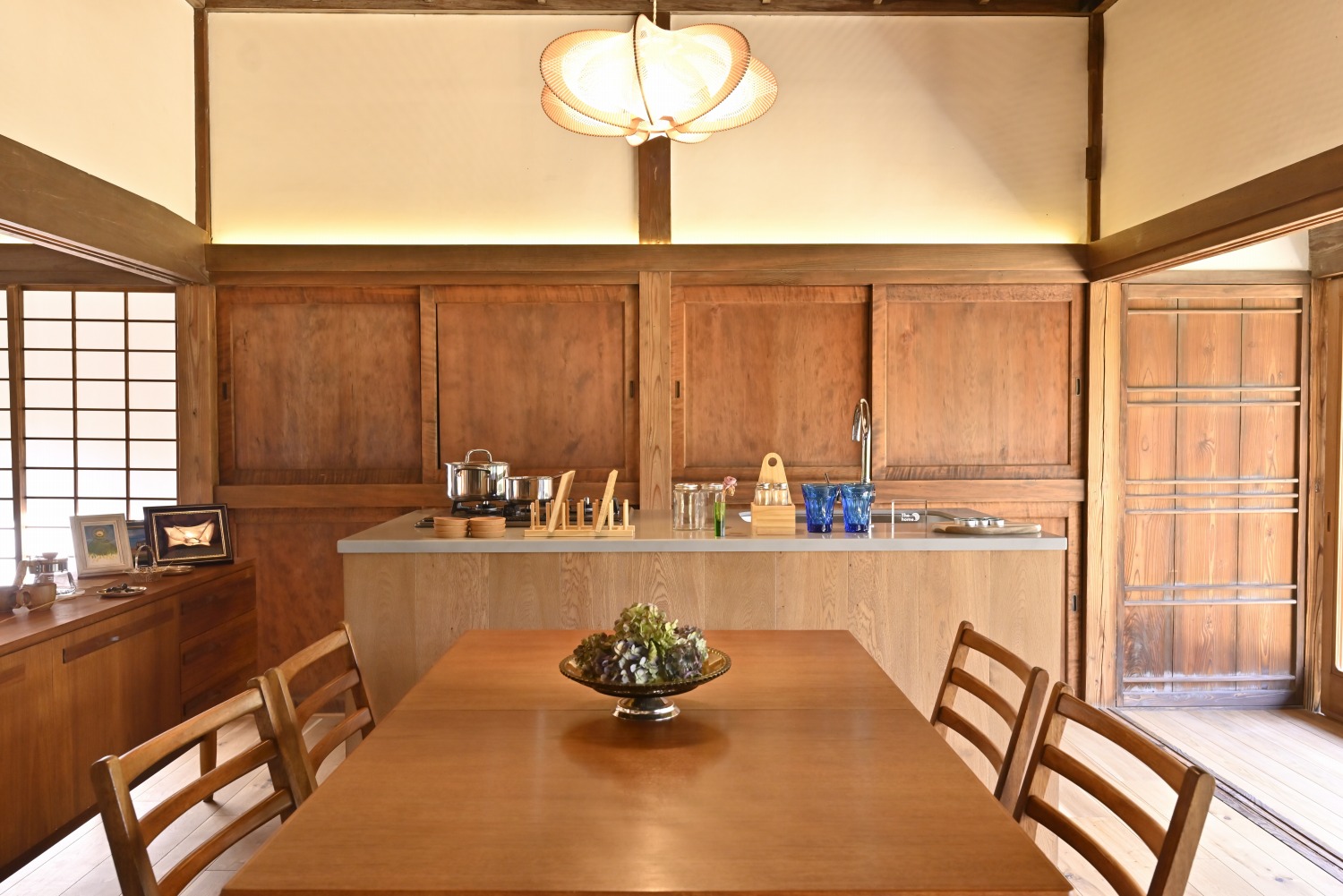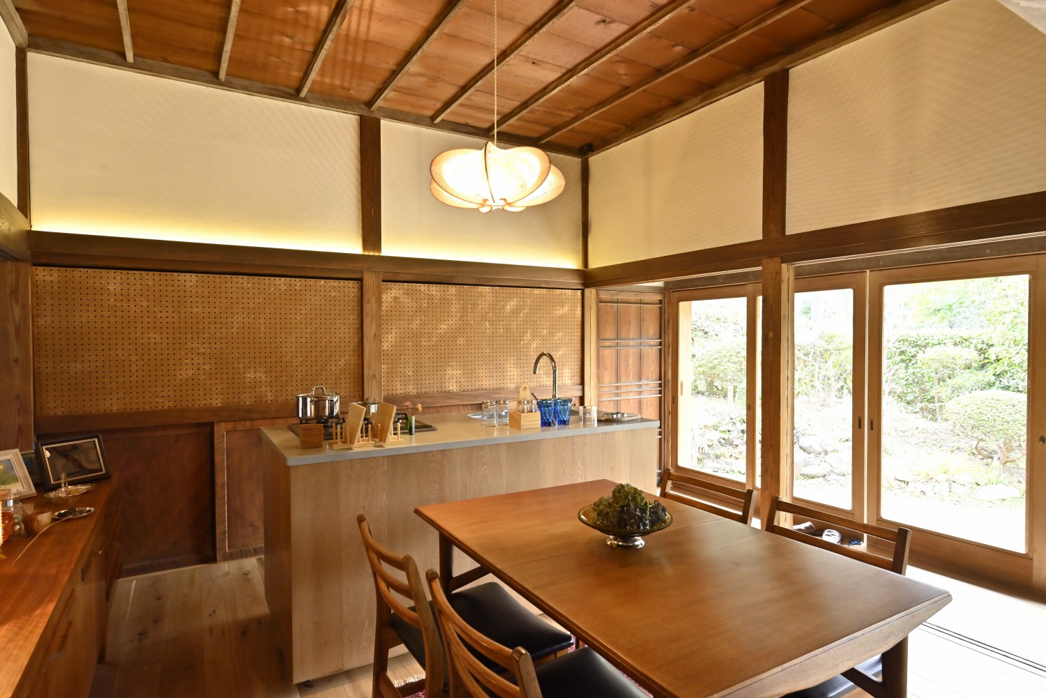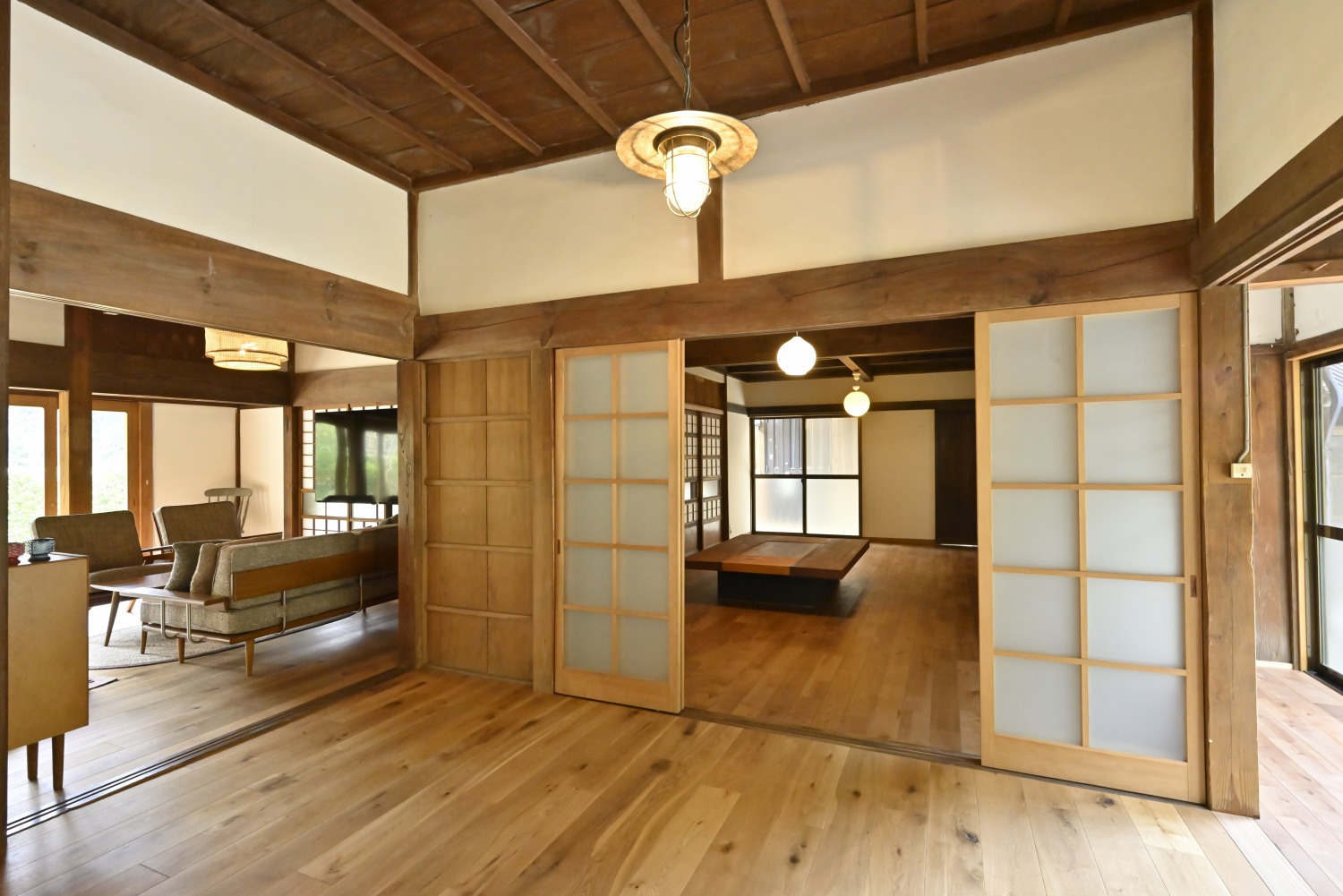 梁や柱はそのまま残し、畳をフローリングに張り替えるなど、伝統の趣を活かしつつ現代的な撮影空間として丁寧にリノベーションされています。縁側には木製建具を再利用し、古材ならではの質感が柔らかな光と調和。家具や照明はミッドセンチュリーを基調に統一され、和と洋が自然に溶け合う空間に仕上がっています。