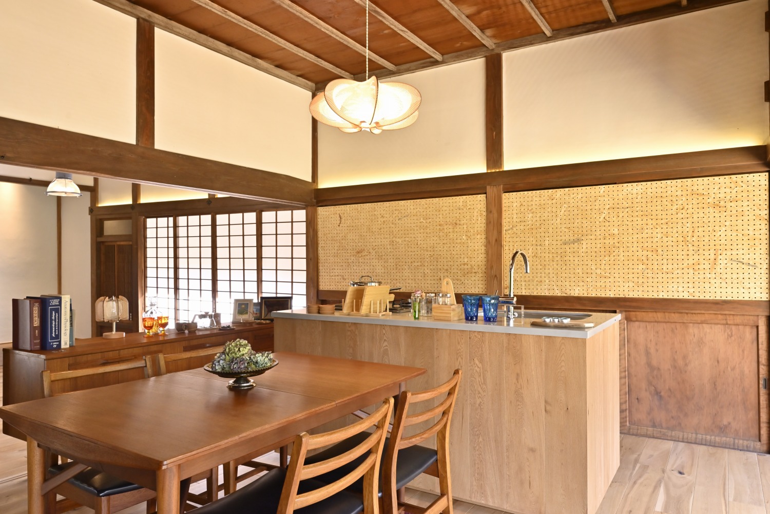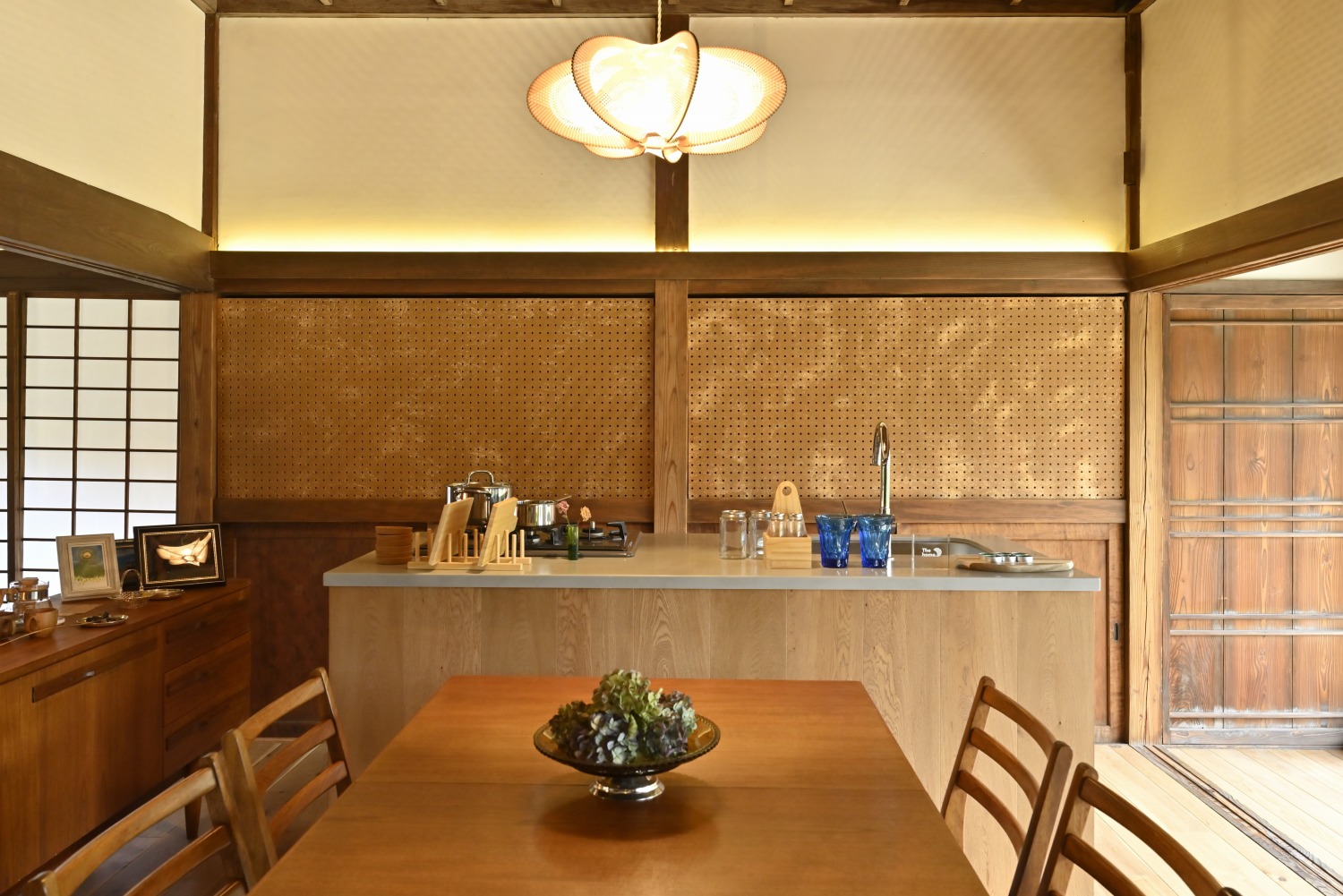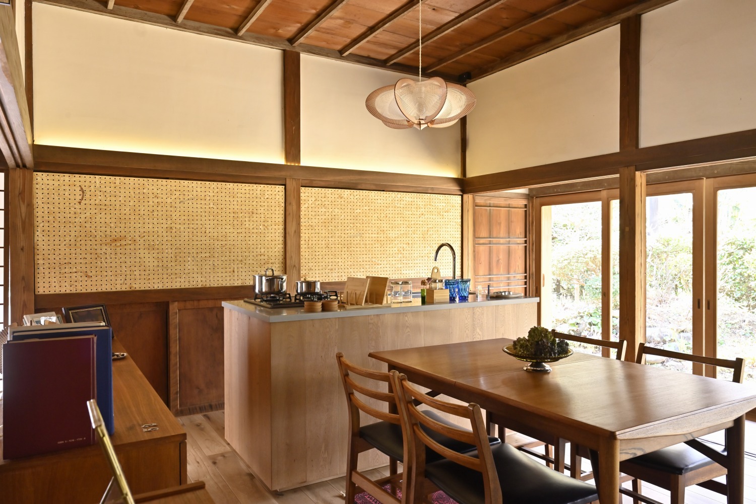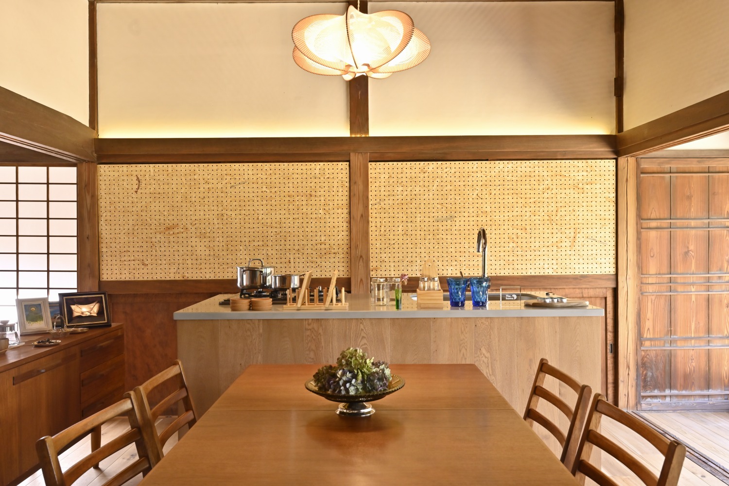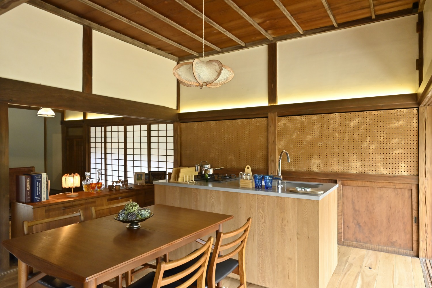 梁や柱はそのまま残し、畳をフローリングに張り替えるなど、伝統の趣を活かしつつ現代的な撮影空間として丁寧にリノベーションされています。縁側には木製建具を再利用し、古材ならではの質感が柔らかな光と調和。家具や照明はミッドセンチュリーを基調に統一され、和と洋が自然に溶け合う空間に仕上がっています。