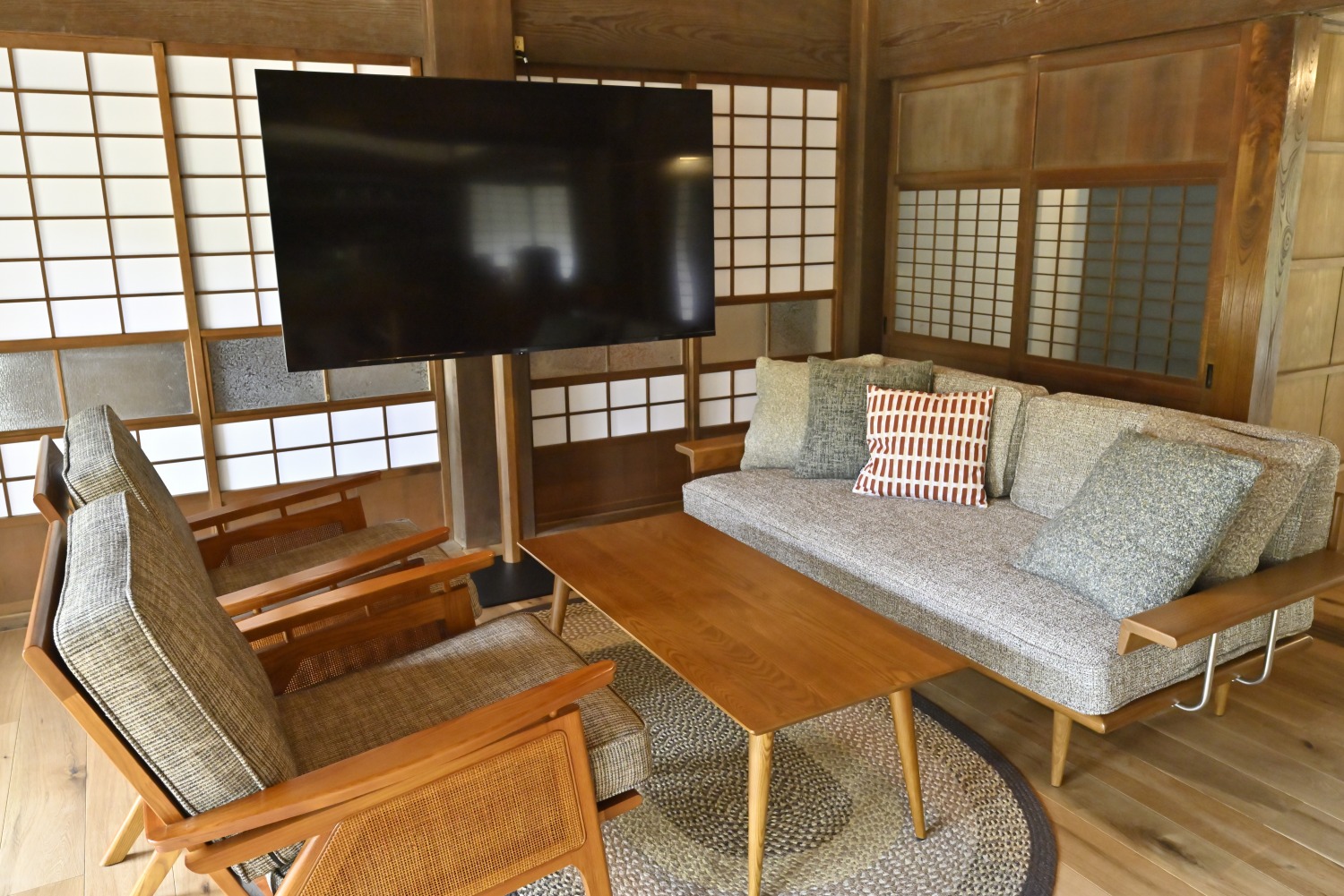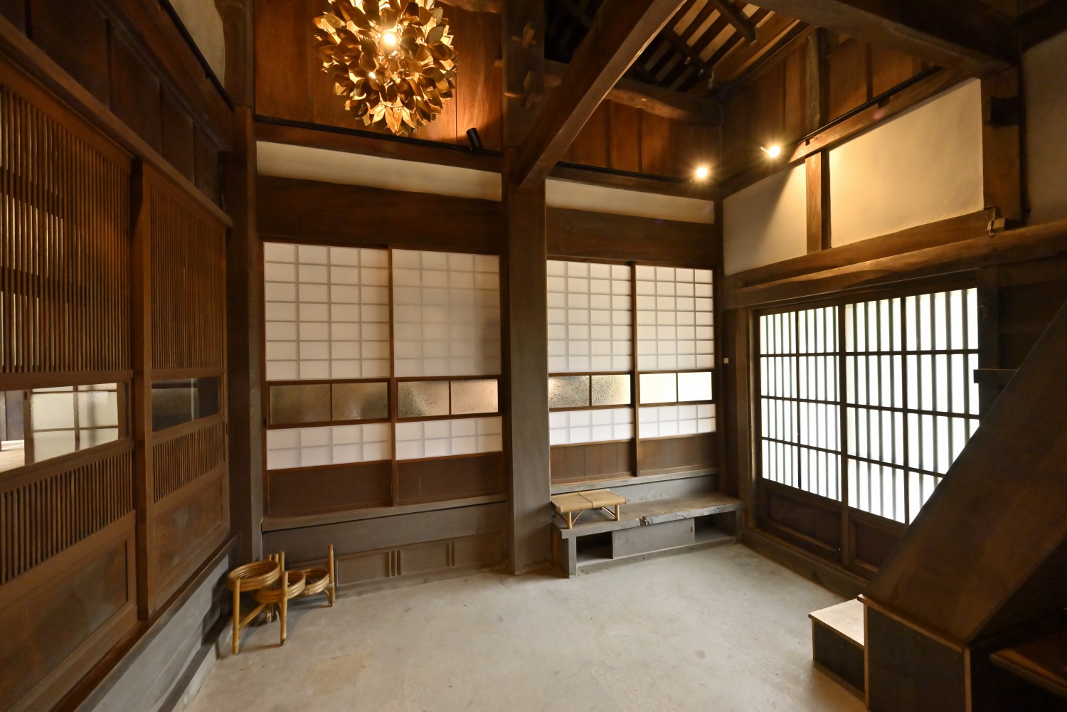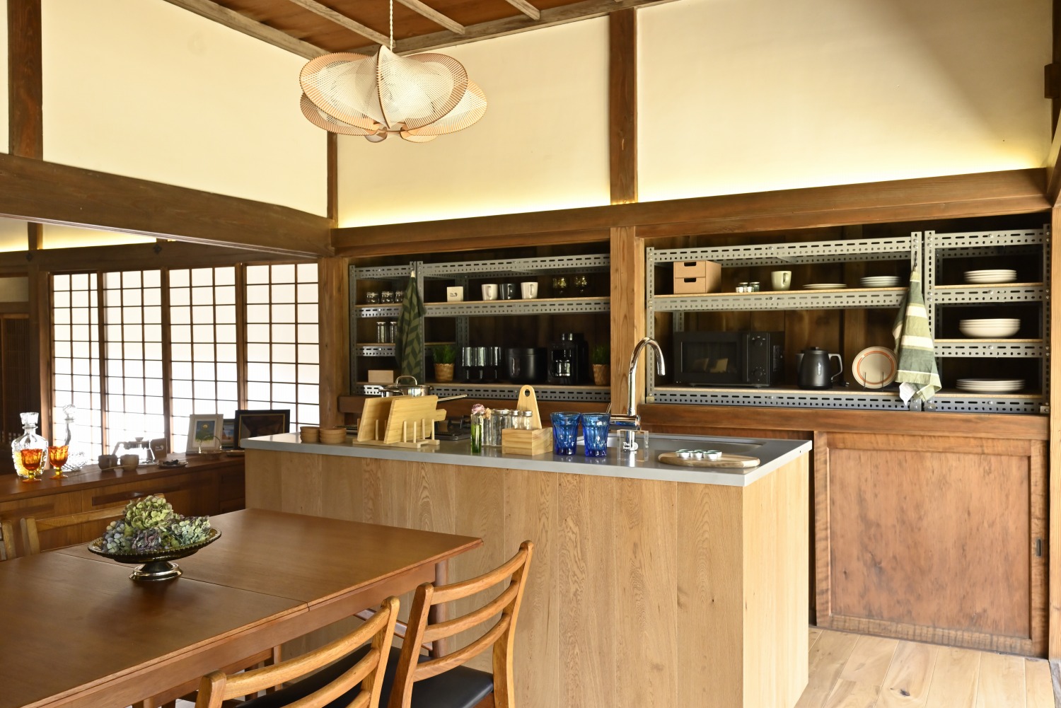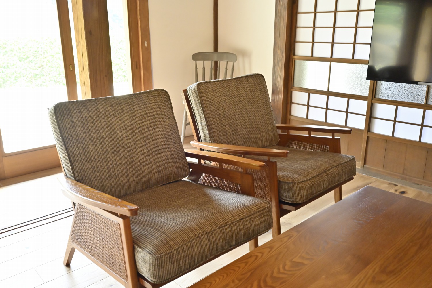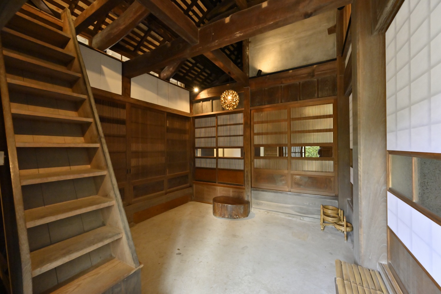 梁や柱はそのまま残し、畳をフローリングに張り替えるなど、伝統の趣を活かしつつ現代的な撮影空間として丁寧にリノベーションされています。縁側には木製建具を再利用し、古材ならではの質感が柔らかな光と調和。家具や照明はミッドセンチュリーを基調に統一され、和と洋が自然に溶け合う空間に仕上がっています。