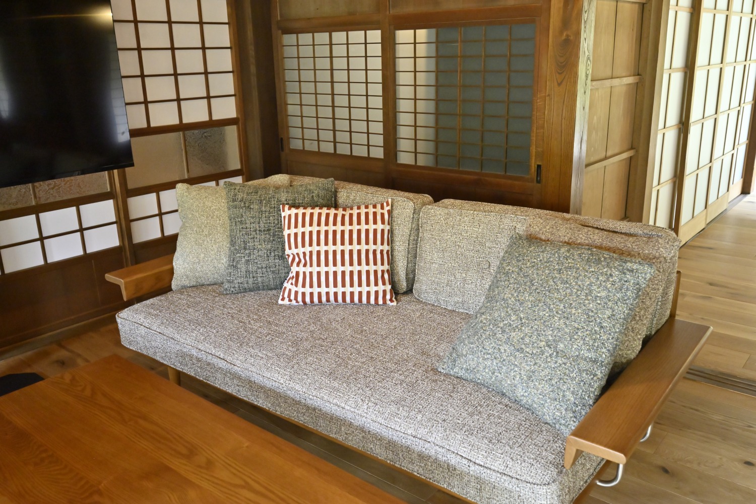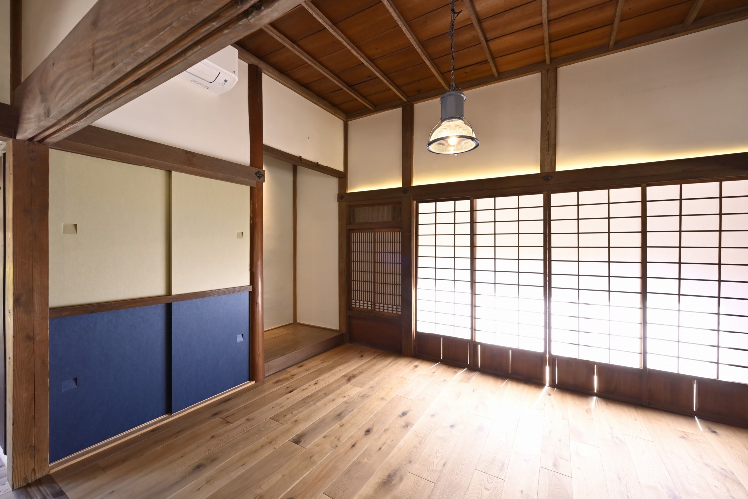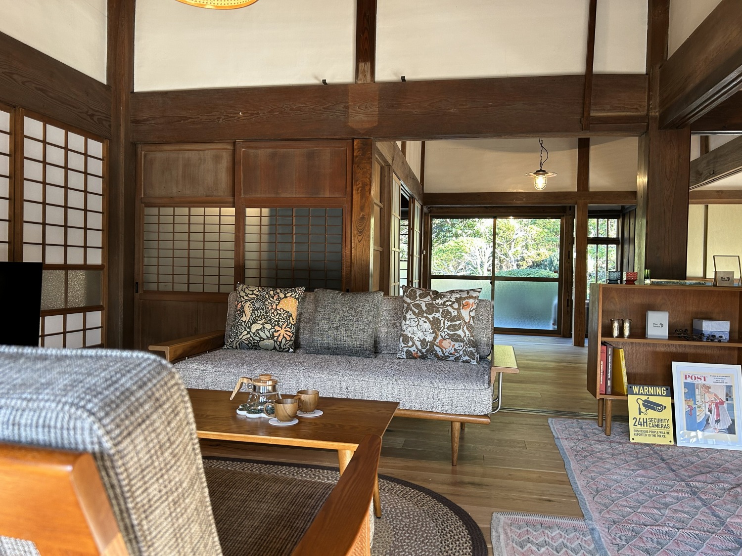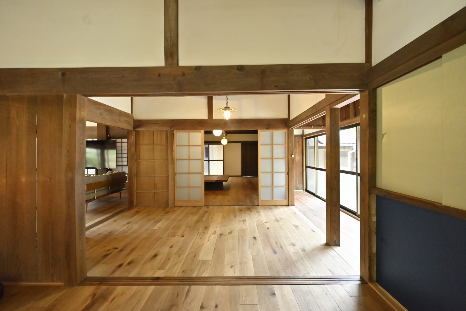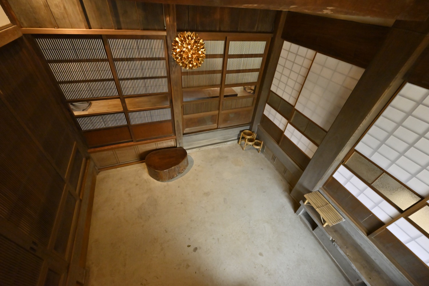 梁や柱はそのまま残し、畳をフローリングに張り替えるなど、伝統の趣を活かしつつ現代的な撮影空間として丁寧にリノベーションされています。縁側には木製建具を再利用し、古材ならではの質感が柔らかな光と調和。家具や照明はミッドセンチュリーを基調に統一され、和と洋が自然に溶け合う空間に仕上がっています。