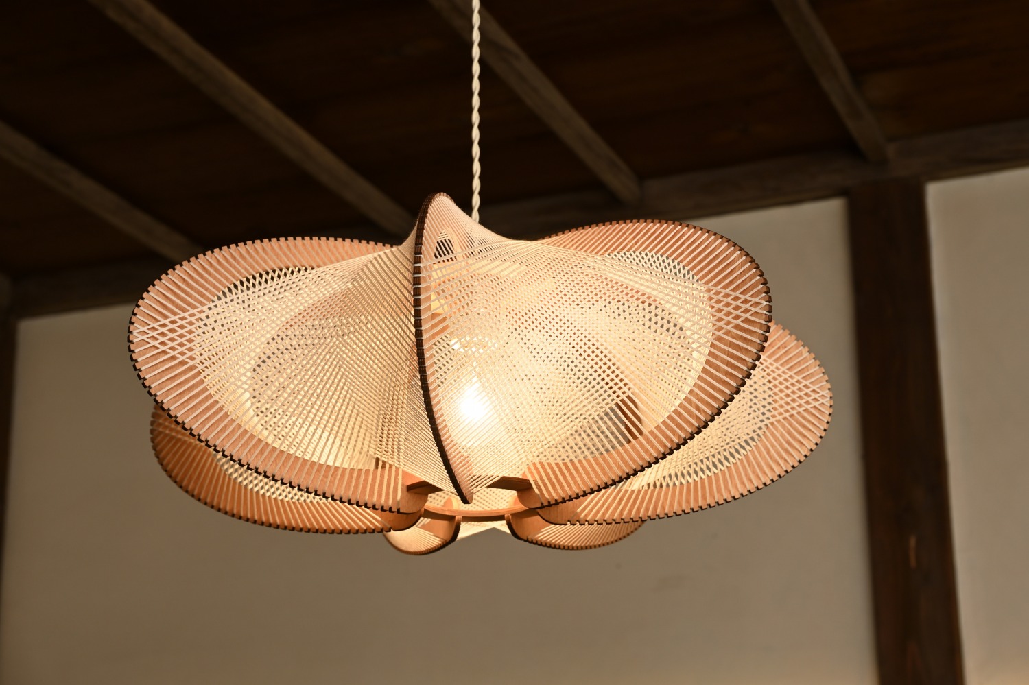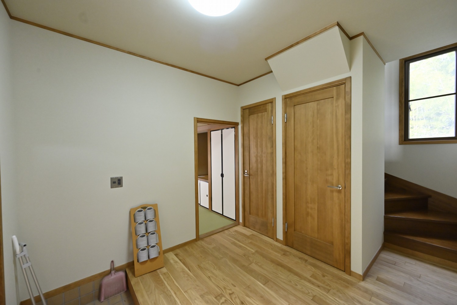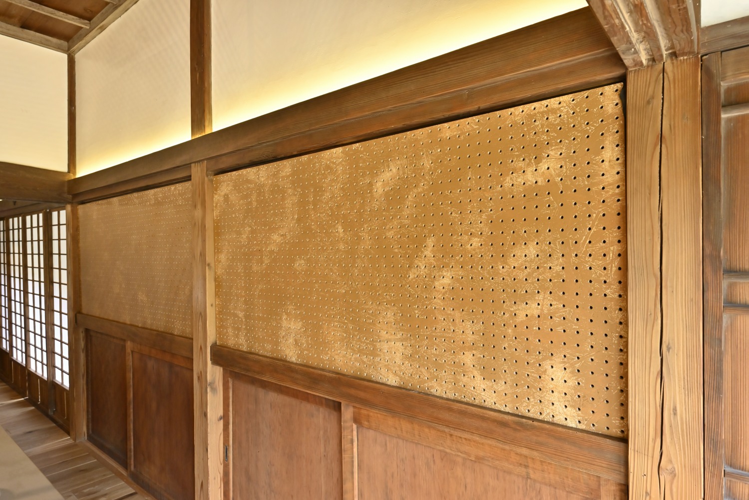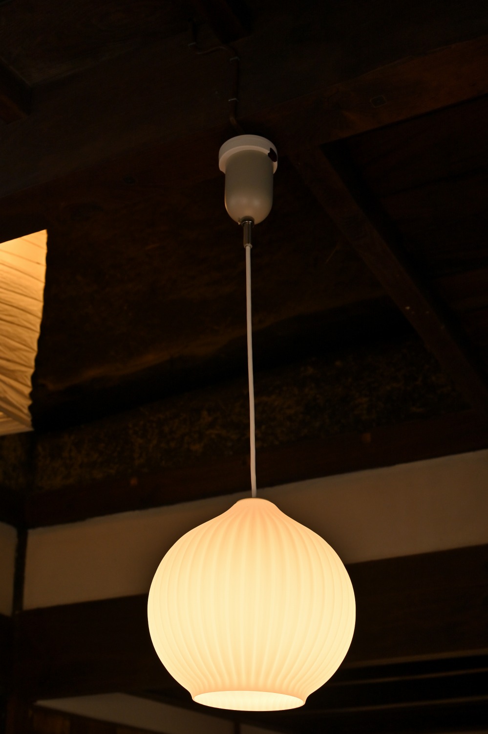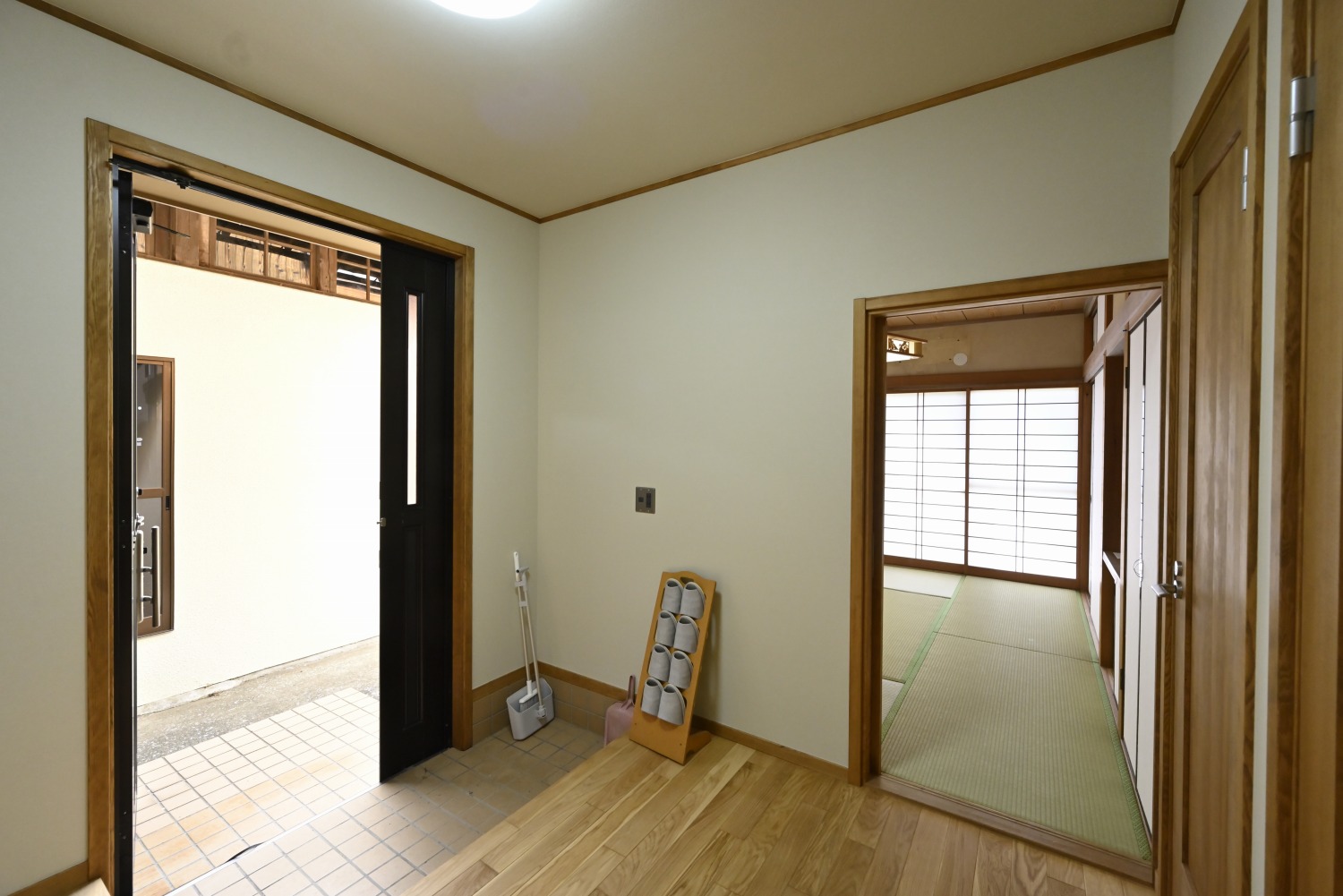梁や柱はそのまま残し、畳をフローリングに張り替えるなど、伝統の趣を活かしつつ現代的な撮影空間として丁寧にリノベーションされています。縁側には木製建具を再利用し、古材ならではの質感が柔らかな光と調和。家具や照明はミッドセンチュリーを基調に統一され、和と洋が自然に溶け合う空間に仕上がっています。