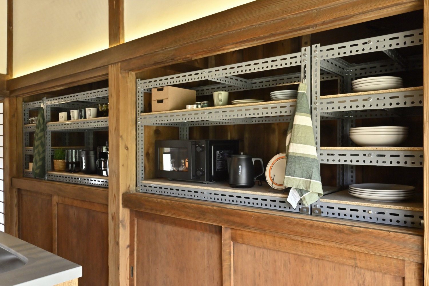 仕切りをほぼ無くした室内は、4部屋を合わせると40畳を超える開放的な構成。縁側に近い2部屋は、襖や障子を戻すことで和の雰囲気を演出することも可能です。1,800幅のシンプルなキッチンは、この内装に合わせて制作しました。キャスター付きなので移動がスムースなのと、給排水のタンクと小さなガスボンベを搭載しているのでより現場のニーズに対応。掲載画像の中に数枚ありますが、キッチン後ろの木製扉を外すことが可能なので現場で棚をつくったり、後ろに照明を入れて奥行きをみせることが出来ます。