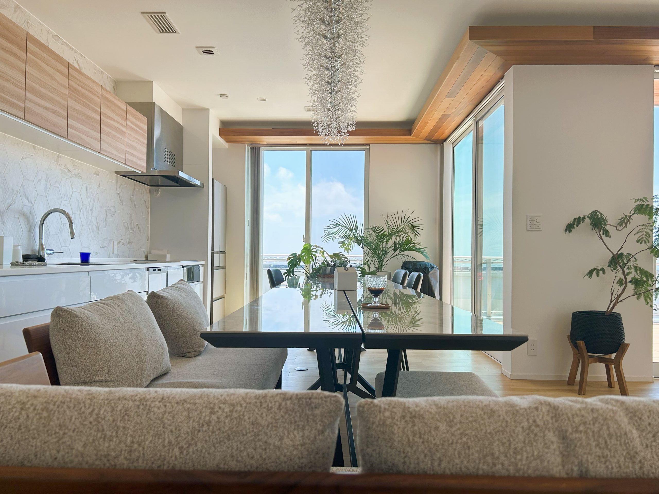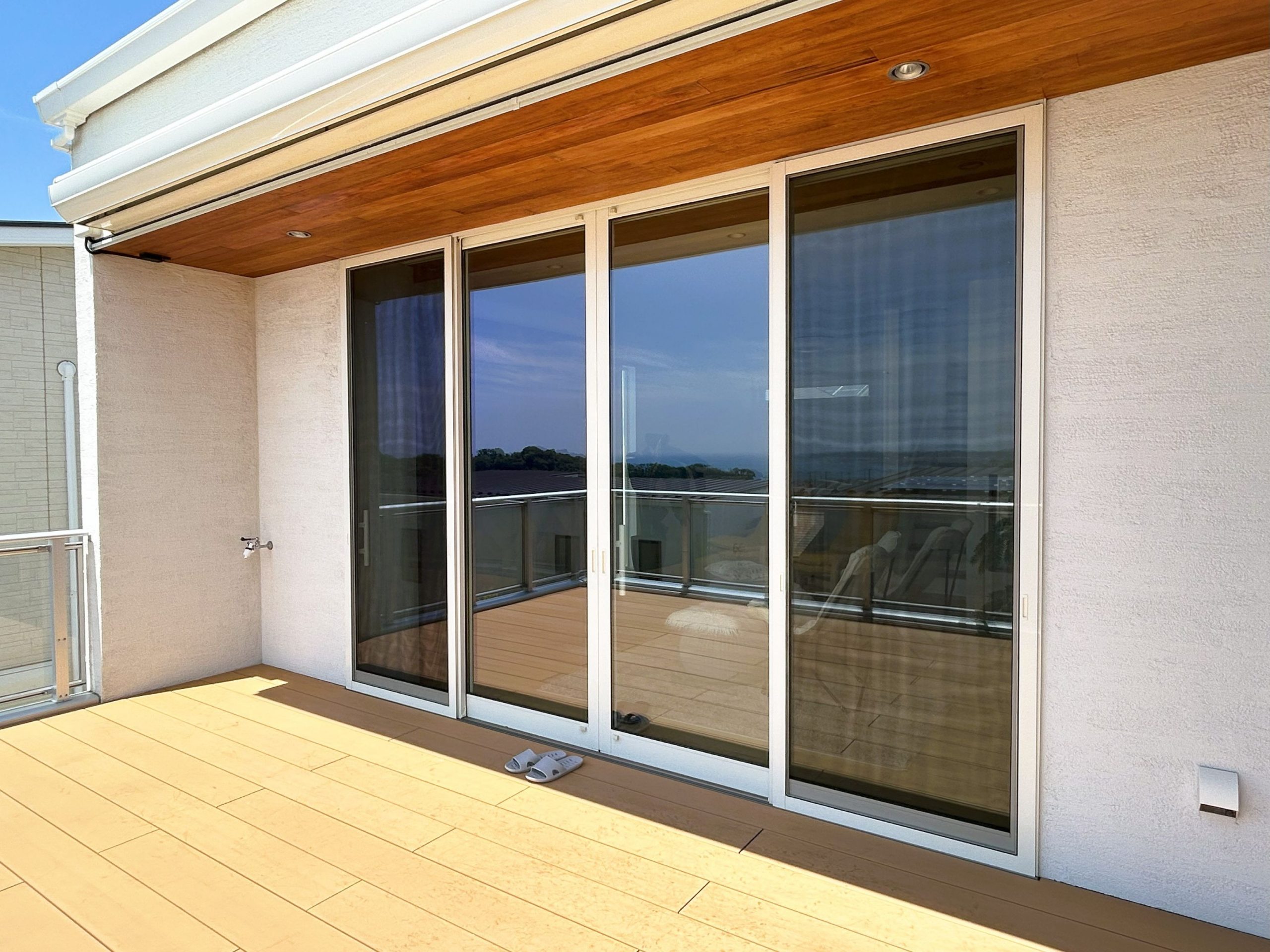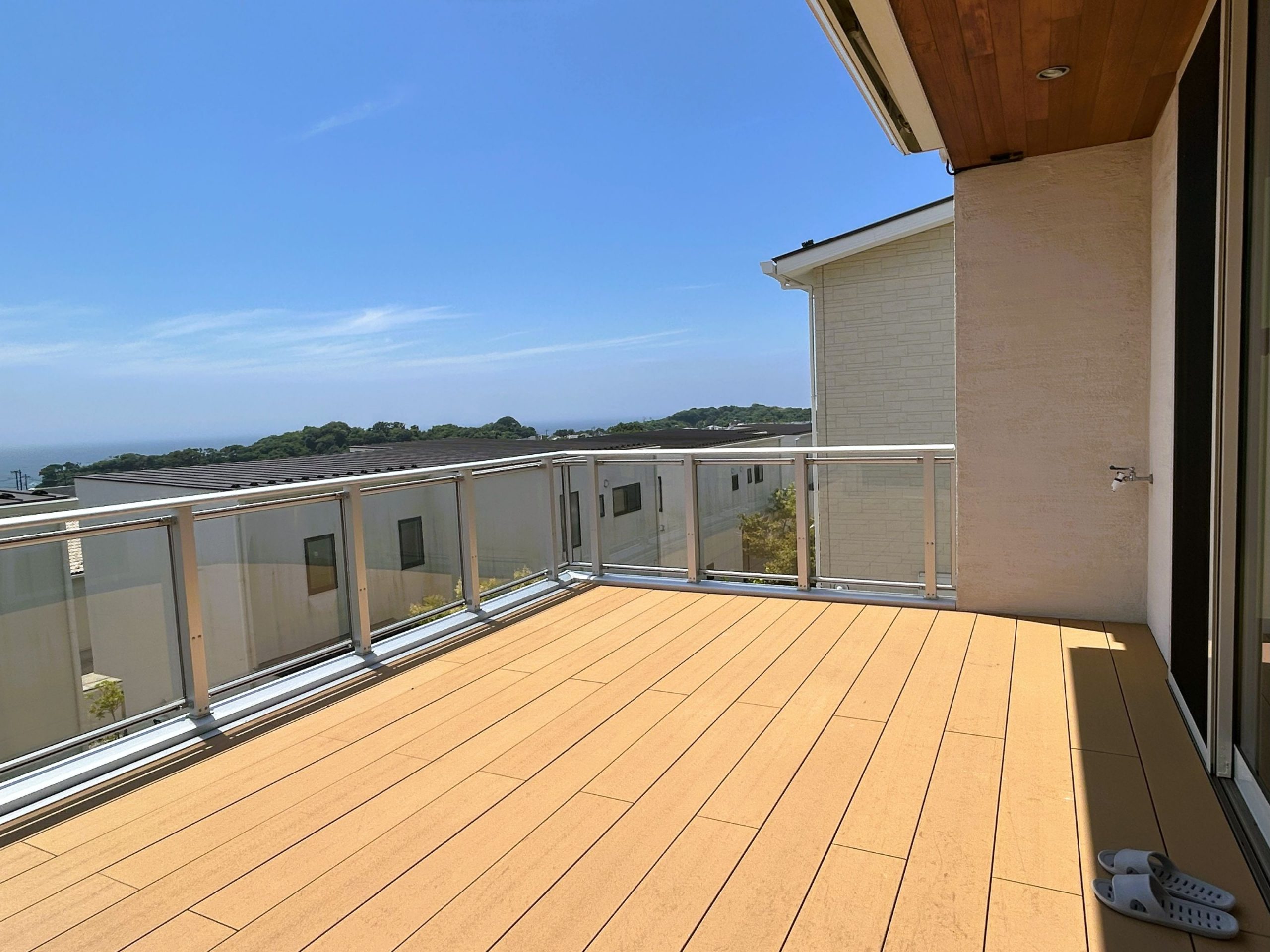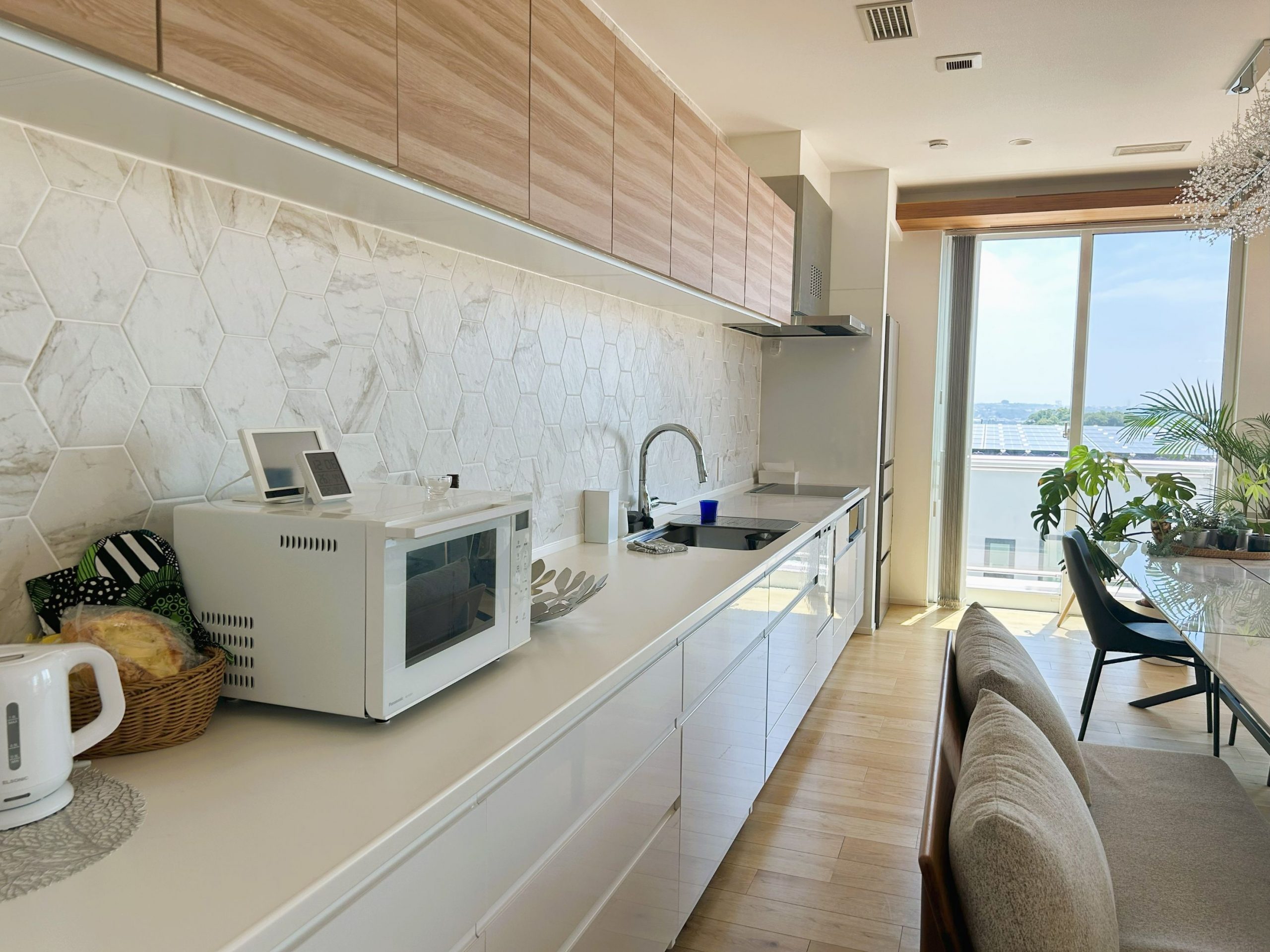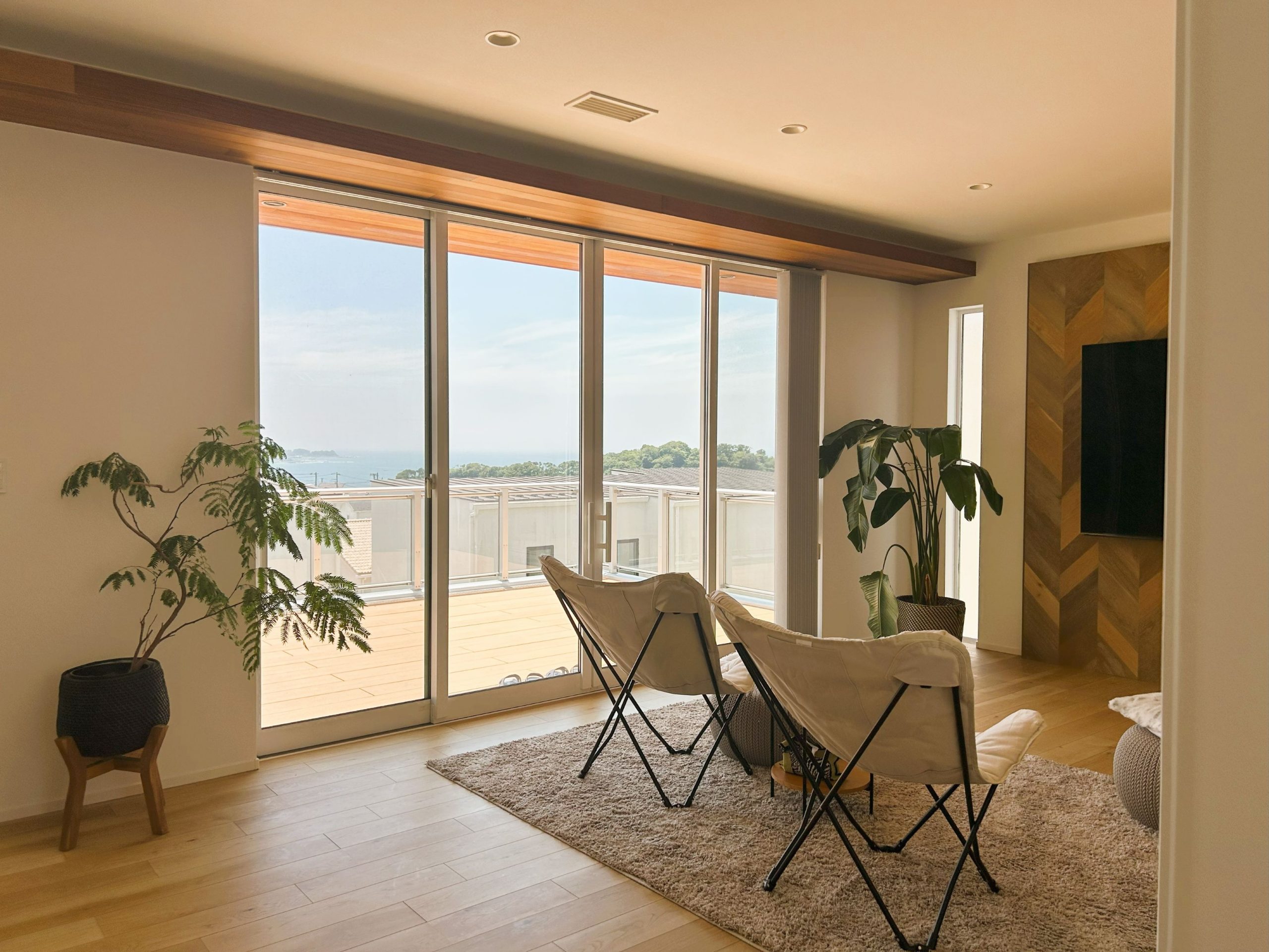 外観撮影はもちろん、広めの駐車スペースではガレージドアからの出入りや、縦列に停めた車両の撮影にも対応可能です。両開きの玄関ドアが醸し出す重厚感と、ゆとりあるエントランスホールは、豪邸らしさを演出するシーンに最適。LDKは2階に設けられ、相模湾を望む抜群の眺望が広がります。大きな窓からたっぷりと自然光が入り採光は十分で、バルコニーから部屋側に照明が打てます。白を基調としたオープンキッチン、木製のウォールキャビネット、白い大理石模様のダイニングテーブル。いずれもリゾートホテルのような上質感があり、程よい生活感と上質な空間を演出できます。家具は必要最低限にとどめられているため、アングルの自由度が高く、セットの持ち込みや美術演出にも柔軟に対応します。ワイドなバルコニーからは相模湾を一望。視界を遮るものが一切なく、気持ちの良い抜けとなります。洗面所はキッチン同様に横幅があり、演者を左右から捉えることが出来ます。浴室はドアを開けると正面に浴槽があり、頭上の窓からは自然光も入る希少な構造です。1階には広めの寝室と洋室があり、撮影セットとしての使用はもちろん、控室やメイク部屋としても機能します。