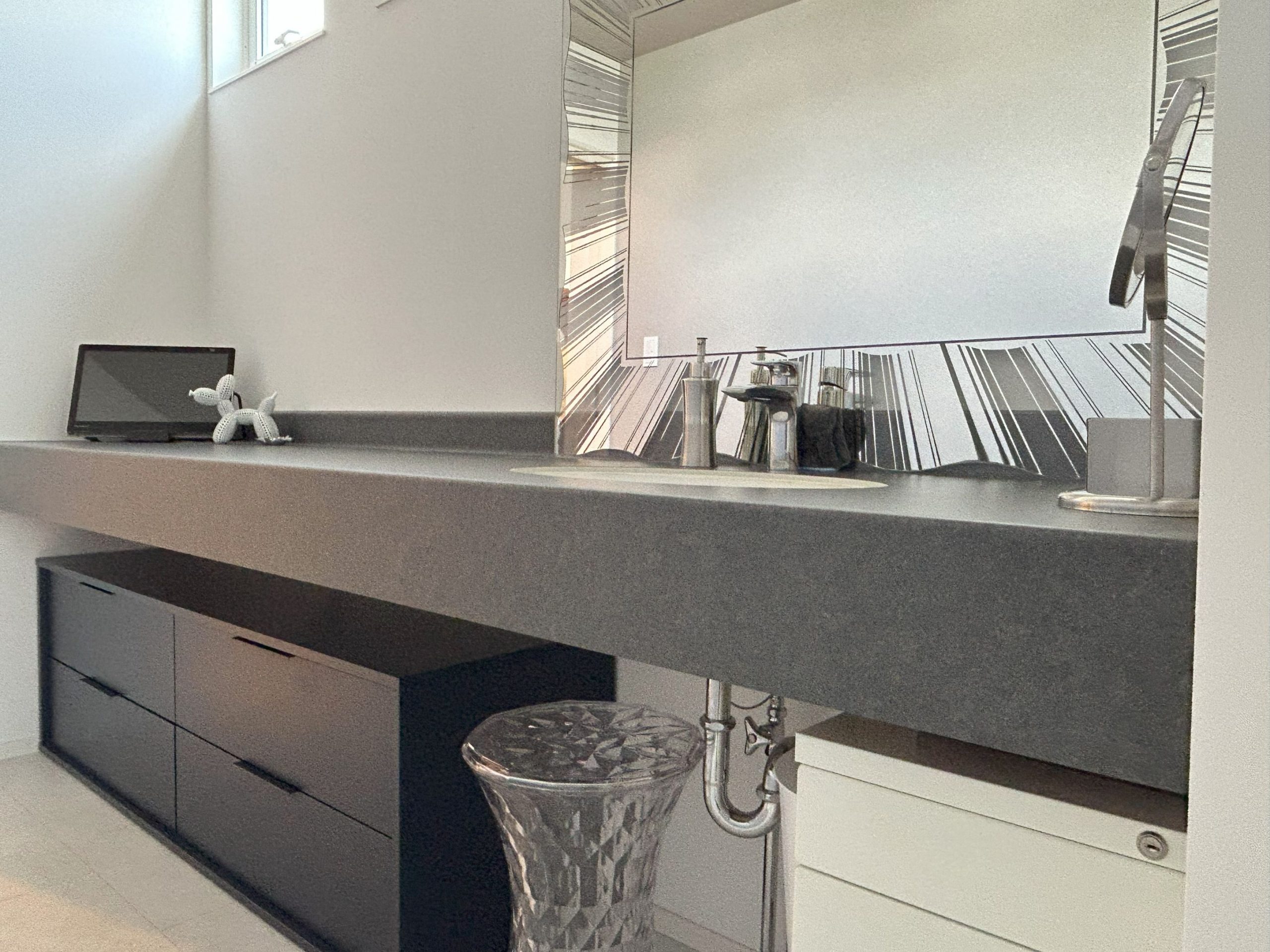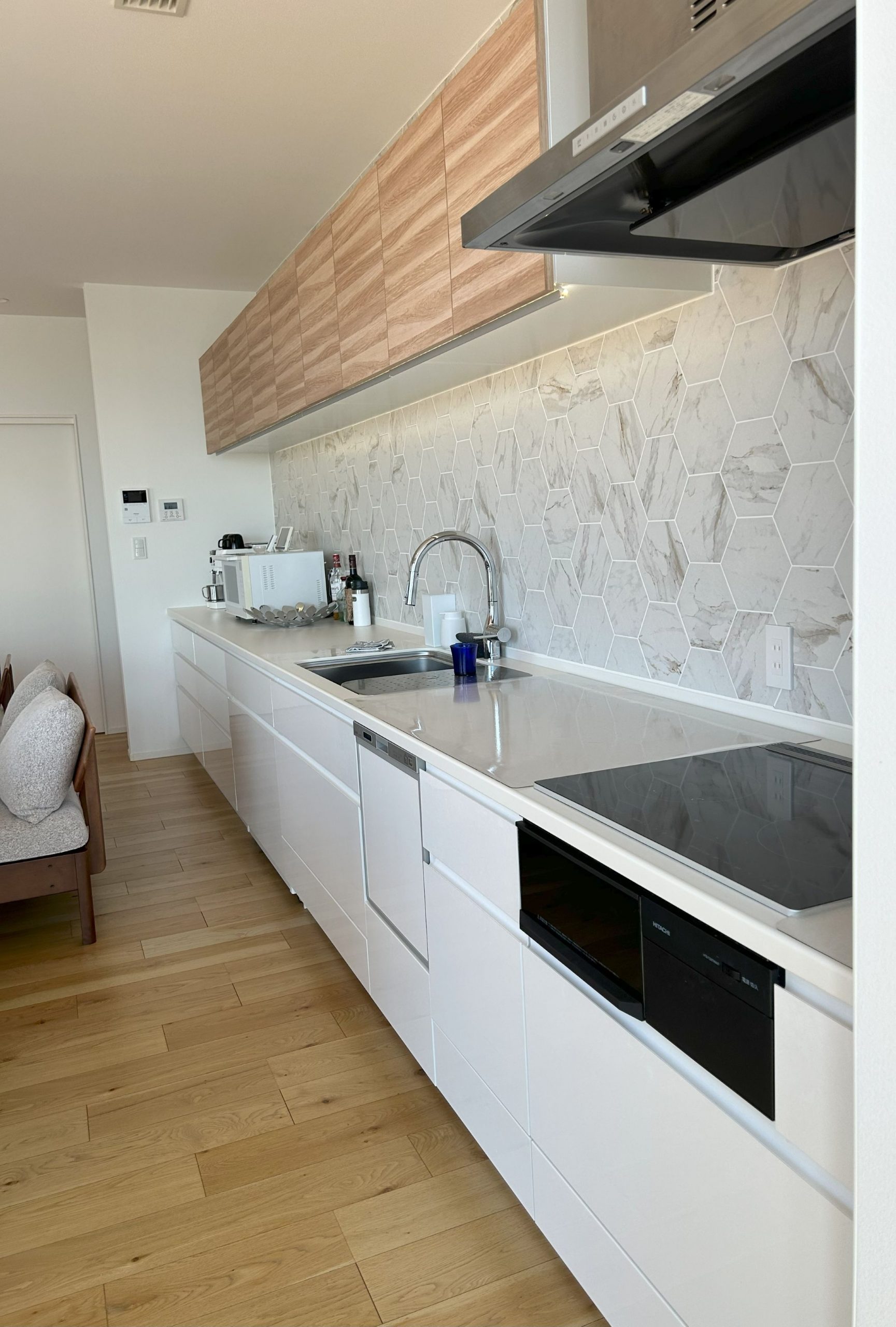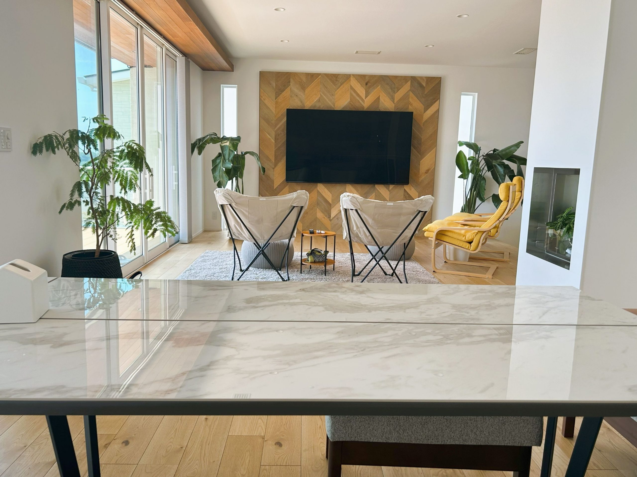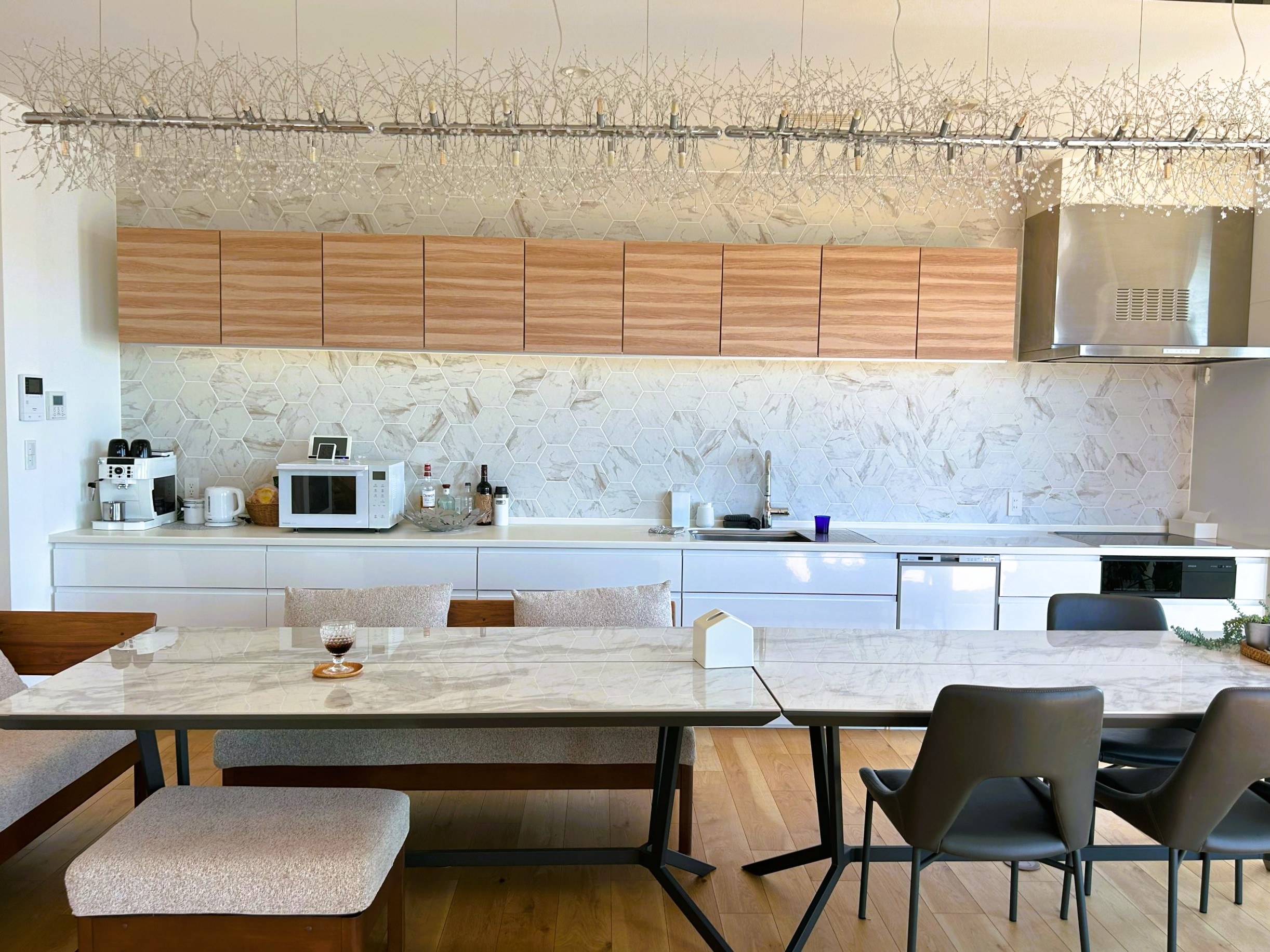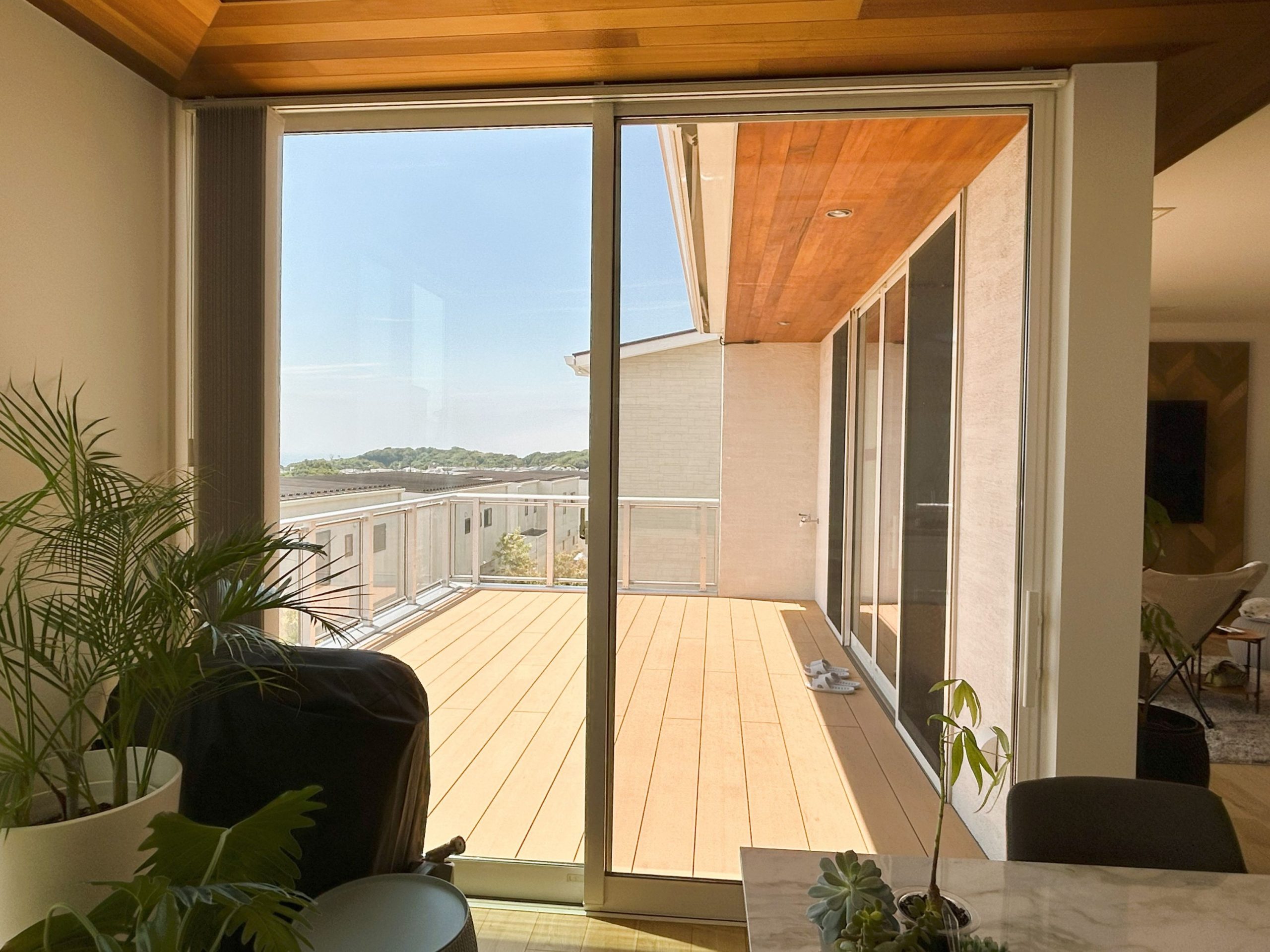 外観撮影はもちろん、広めの駐車スペースではガレージドアからの出入りや、縦列に停めた車両の撮影にも対応可能です。両開きの玄関ドアが醸し出す重厚感と、ゆとりあるエントランスホールは、豪邸らしさを演出するシーンに最適。LDKは2階に設けられ、相模湾を望む抜群の眺望が広がります。大きな窓からたっぷりと自然光が入り採光は十分で、バルコニーから部屋側に照明が打てます。白を基調としたオープンキッチン、木製のウォールキャビネット、白い大理石模様のダイニングテーブル。いずれもリゾートホテルのような上質感があり、程よい生活感と上質な空間を演出できます。家具は必要最低限にとどめられているため、アングルの自由度が高く、セットの持ち込みや美術演出にも柔軟に対応します。ワイドなバルコニーからは相模湾を一望。視界を遮るものが一切なく、気持ちの良い抜けとなります。洗面所はキッチン同様に横幅があり、演者を左右から捉えることが出来ます。浴室はドアを開けると正面に浴槽があり、頭上の窓からは自然光も入る希少な構造です。1階には広めの寝室と洋室があり、撮影セットとしての使用はもちろん、控室やメイク部屋としても機能します。