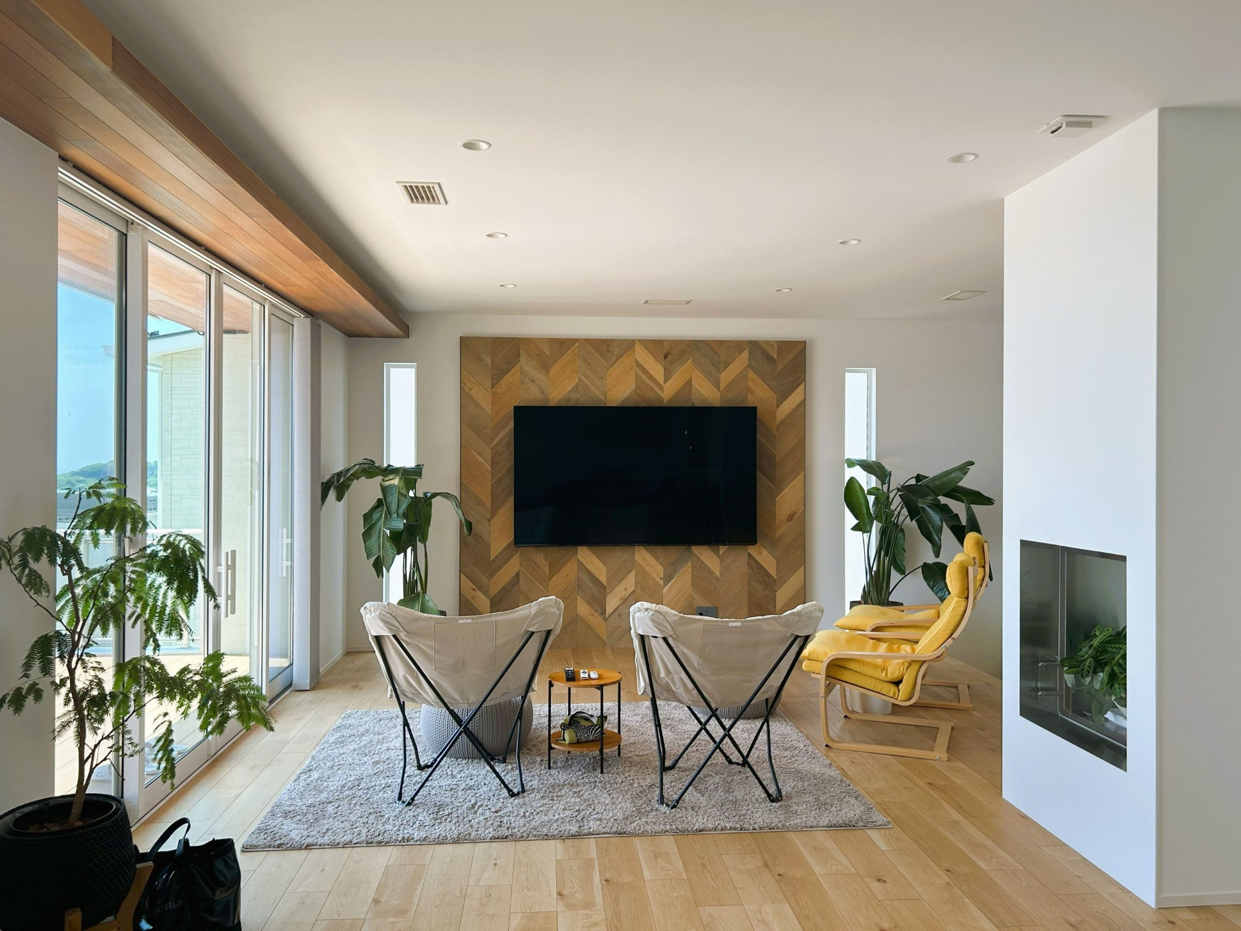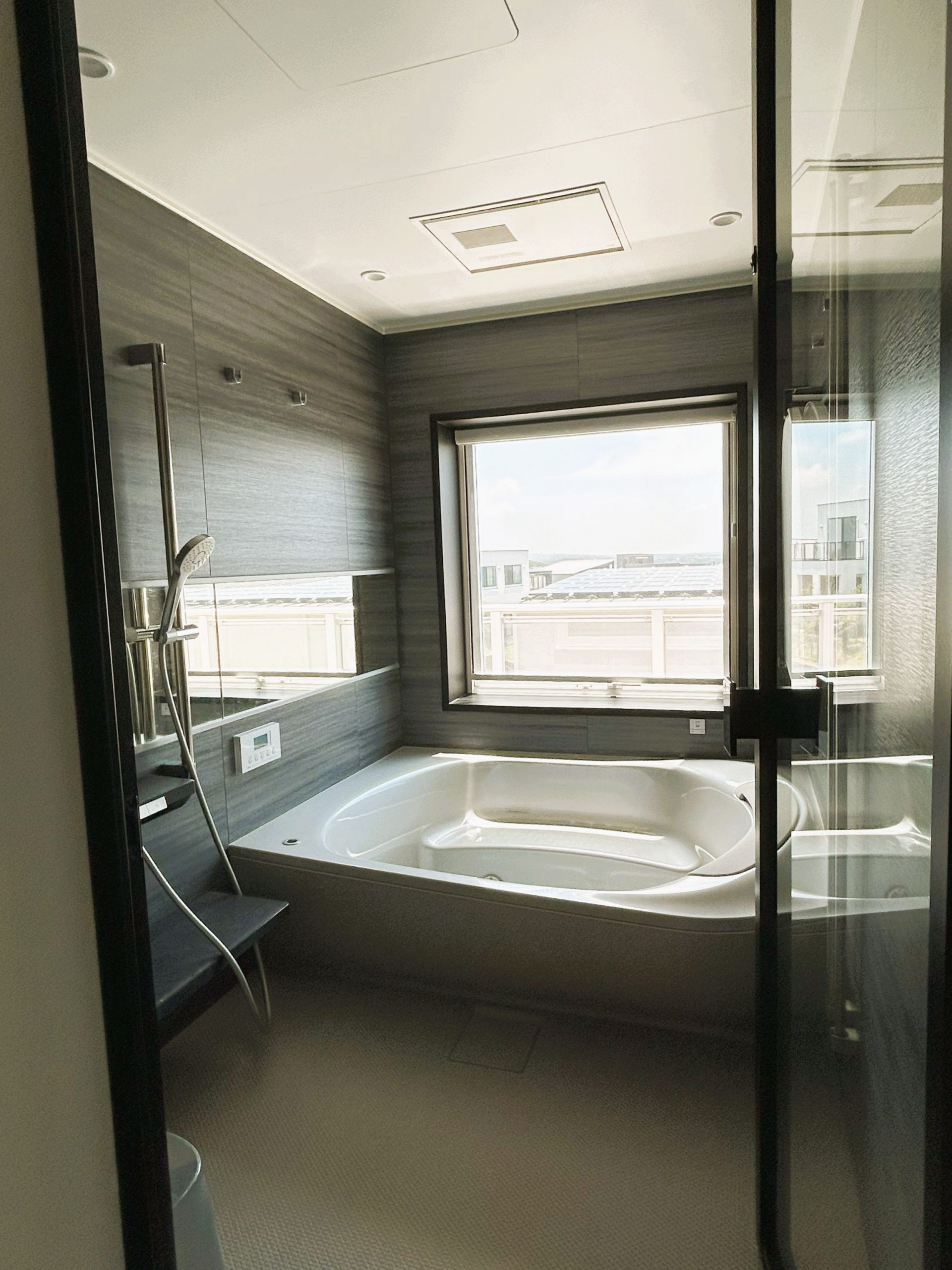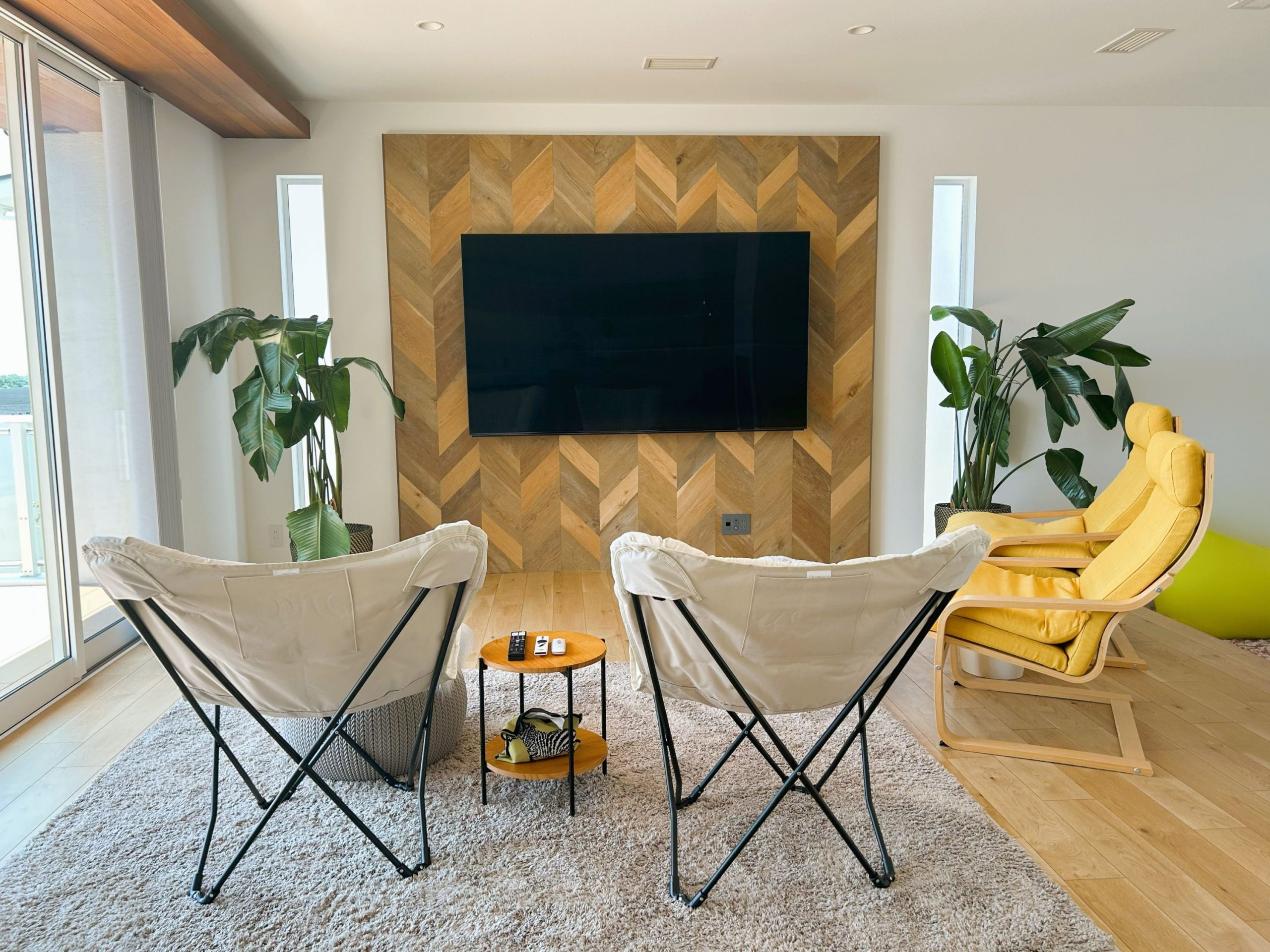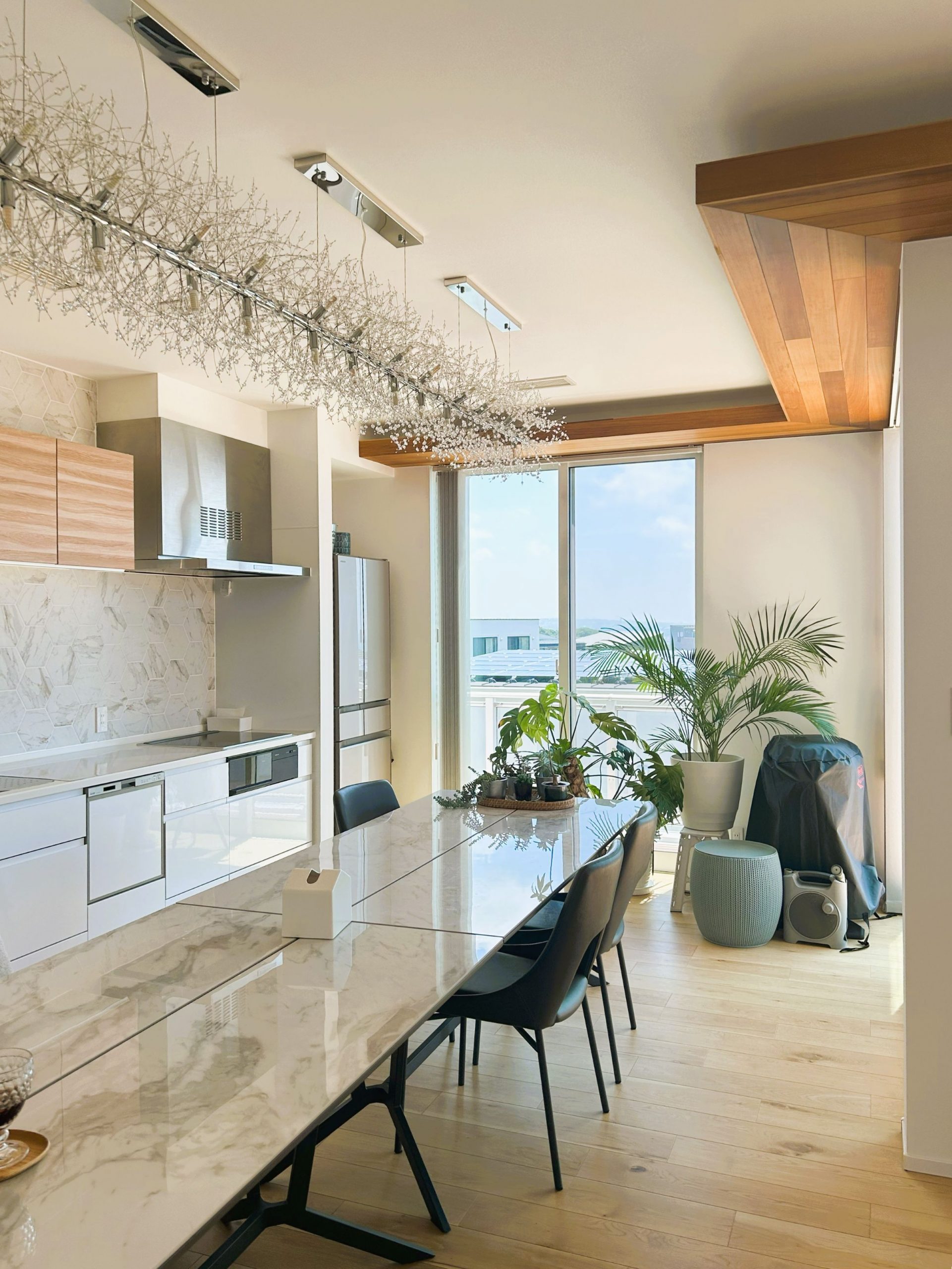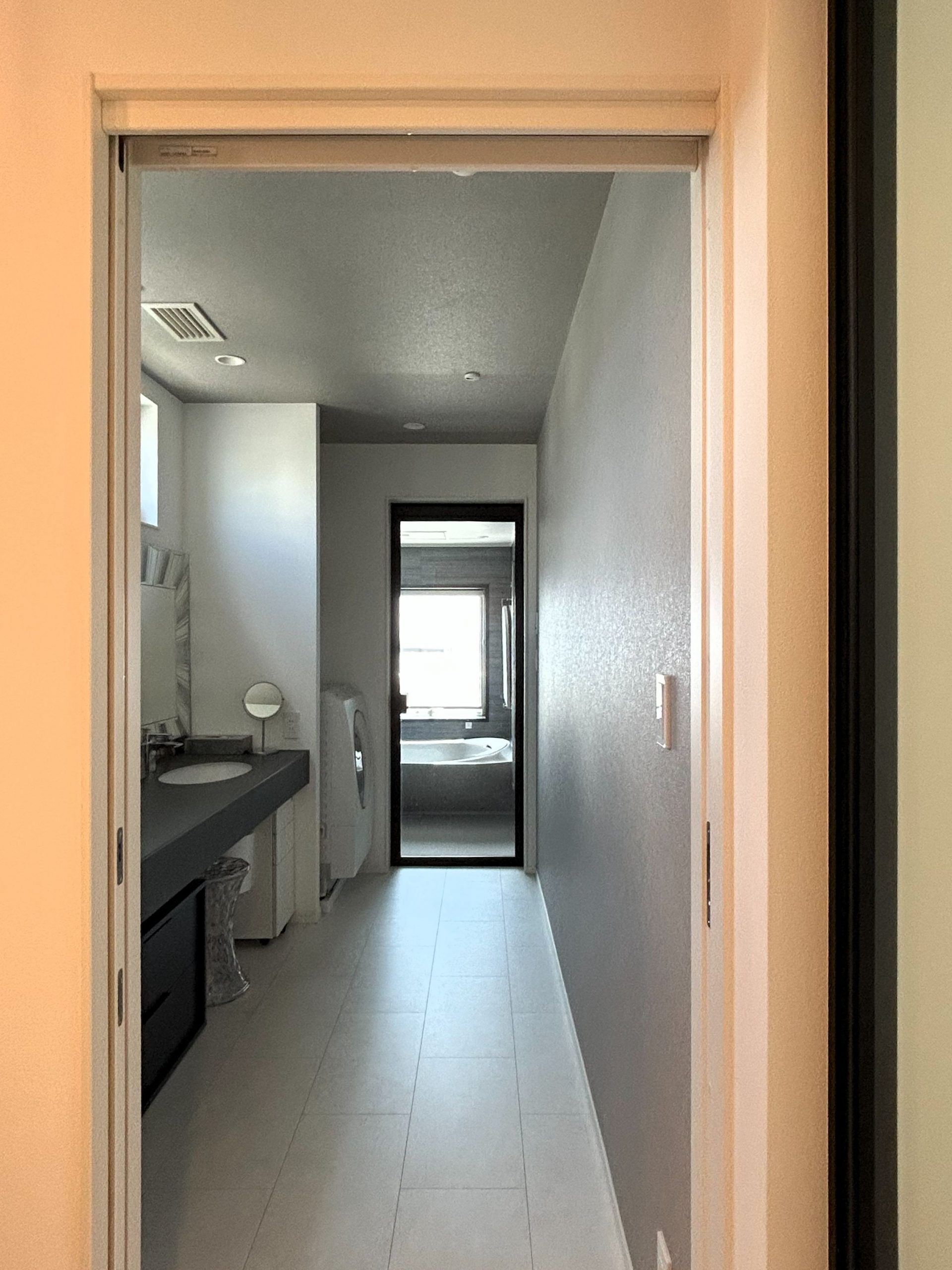 外観撮影はもちろん、広めの駐車スペースではガレージドアからの出入りや、縦列に停めた車両の撮影にも対応可能です。両開きの玄関ドアが醸し出す重厚感と、ゆとりあるエントランスホールは、豪邸らしさを演出するシーンに最適。LDKは2階に設けられ、相模湾を望む抜群の眺望が広がります。大きな窓からたっぷりと自然光が入り採光は十分で、バルコニーから部屋側に照明が打てます。白を基調としたオープンキッチン、木製のウォールキャビネット、白い大理石模様のダイニングテーブル。いずれもリゾートホテルのような上質感があり、程よい生活感と上質な空間を演出できます。家具は必要最低限にとどめられているため、アングルの自由度が高く、セットの持ち込みや美術演出にも柔軟に対応します。ワイドなバルコニーからは相模湾を一望。視界を遮るものが一切なく、気持ちの良い抜けとなります。洗面所はキッチン同様に横幅があり、演者を左右から捉えることが出来ます。浴室はドアを開けると正面に浴槽があり、頭上の窓からは自然光も入る希少な構造です。1階には広めの寝室と洋室があり、撮影セットとしての使用はもちろん、控室やメイク部屋としても機能します。