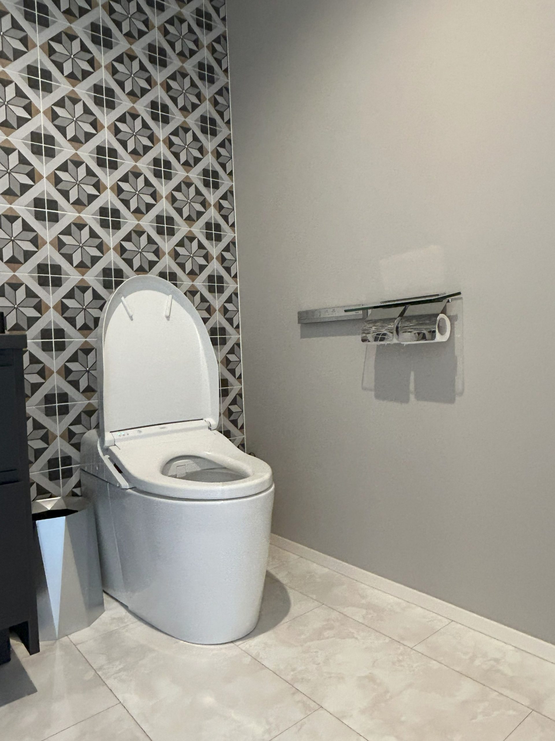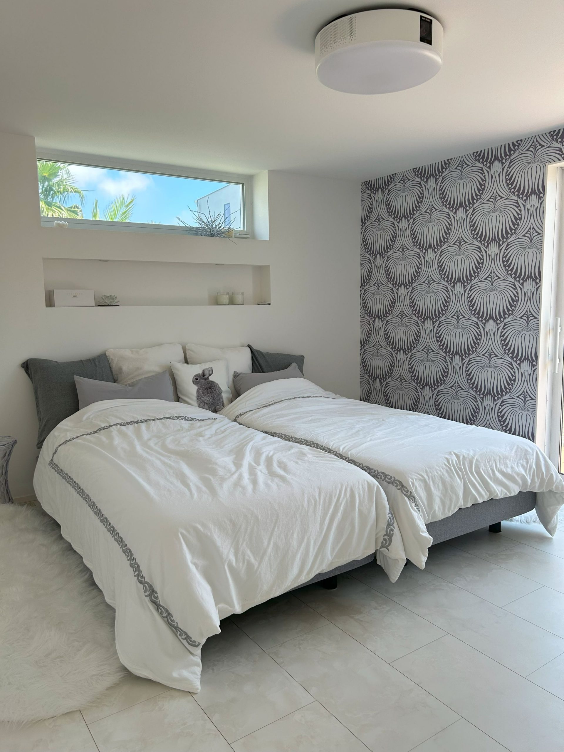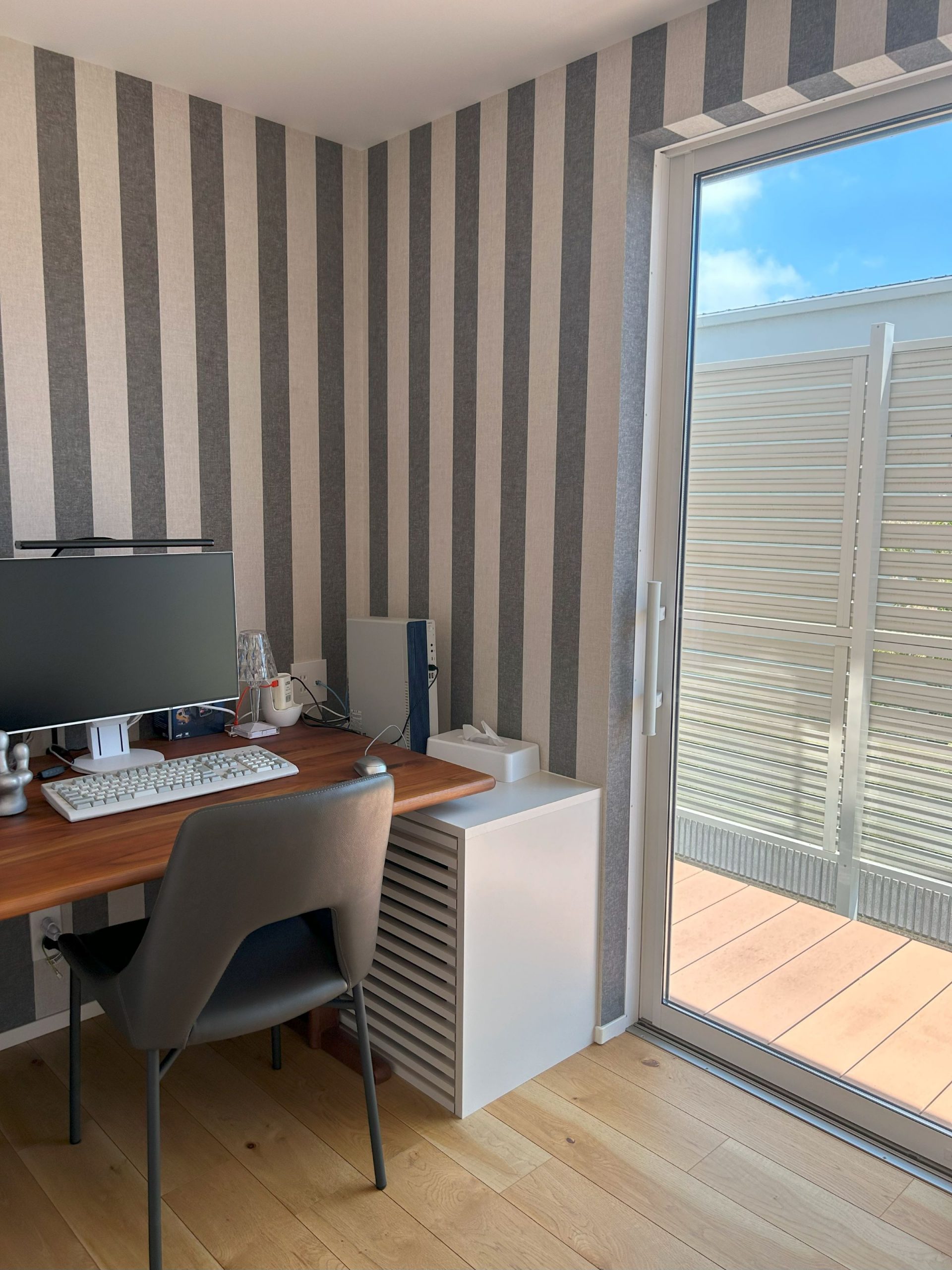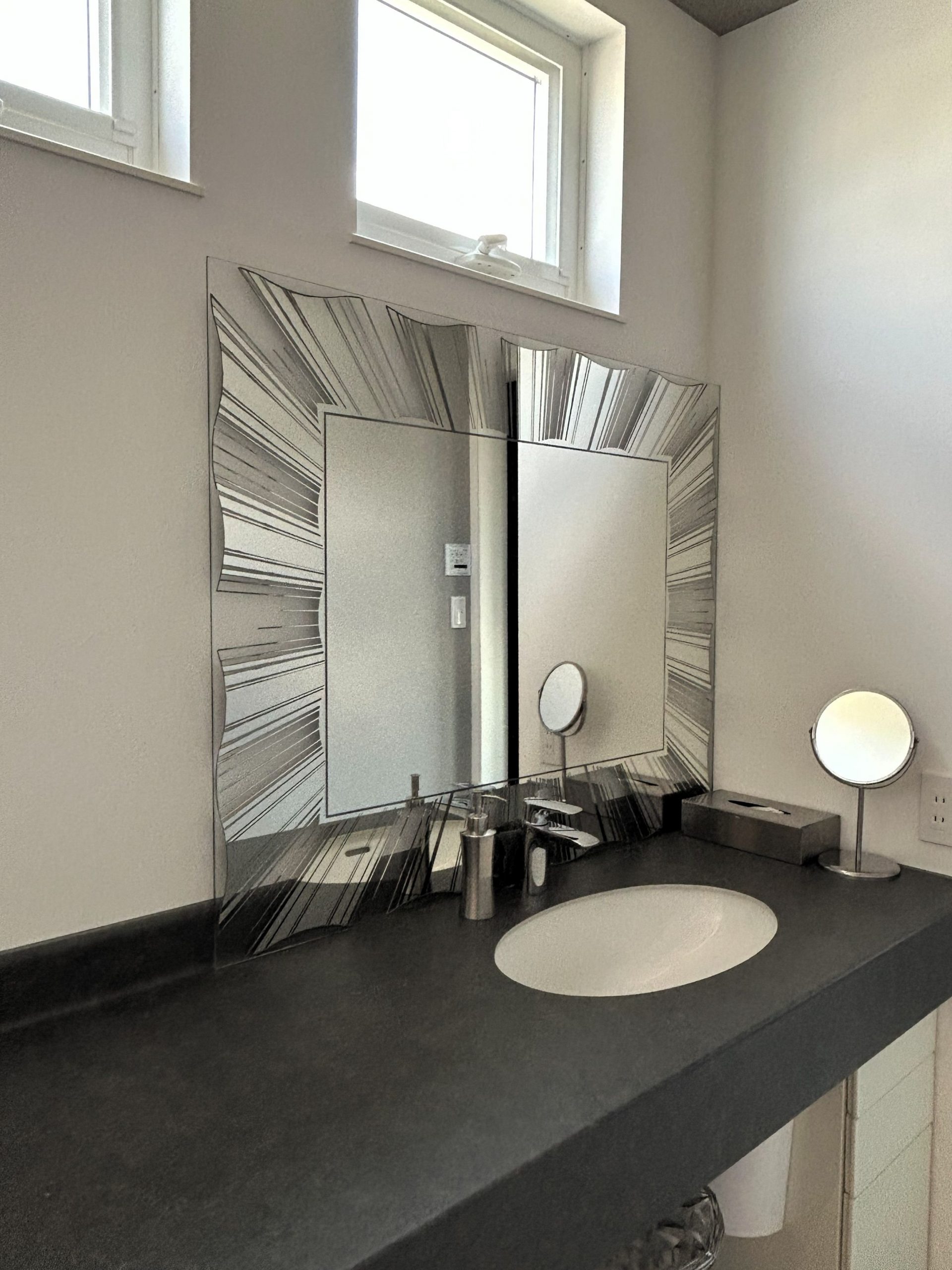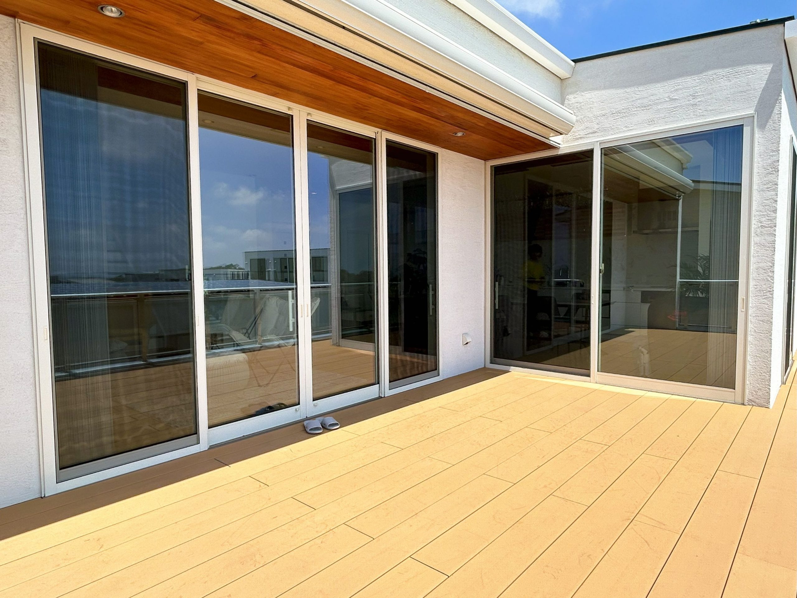 外観撮影はもちろん、広めの駐車スペースではガレージドアからの出入りや、縦列に停めた車両の撮影にも対応可能です。両開きの玄関ドアが醸し出す重厚感と、ゆとりあるエントランスホールは、豪邸らしさを演出するシーンに最適。LDKは2階に設けられ、相模湾を望む抜群の眺望が広がります。大きな窓からたっぷりと自然光が入り採光は十分で、バルコニーから部屋側に照明が打てます。白を基調としたオープンキッチン、木製のウォールキャビネット、白い大理石模様のダイニングテーブル。いずれもリゾートホテルのような上質感があり、程よい生活感と上質な空間を演出できます。家具は必要最低限にとどめられているため、アングルの自由度が高く、セットの持ち込みや美術演出にも柔軟に対応します。ワイドなバルコニーからは相模湾を一望。視界を遮るものが一切なく、気持ちの良い抜けとなります。洗面所はキッチン同様に横幅があり、演者を左右から捉えることが出来ます。浴室はドアを開けると正面に浴槽があり、頭上の窓からは自然光も入る希少な構造です。1階には広めの寝室と洋室があり、撮影セットとしての使用はもちろん、控室やメイク部屋としても機能します。