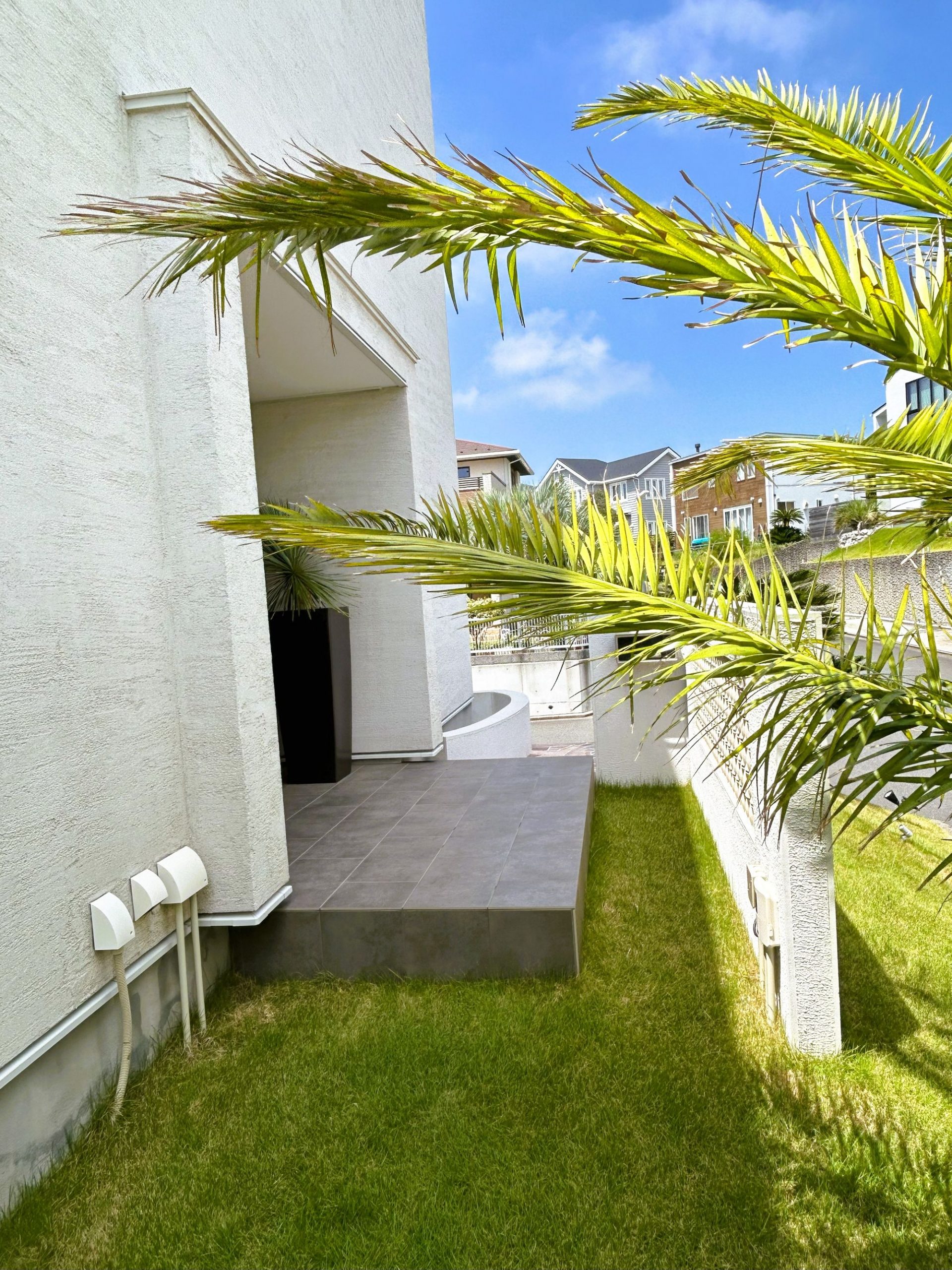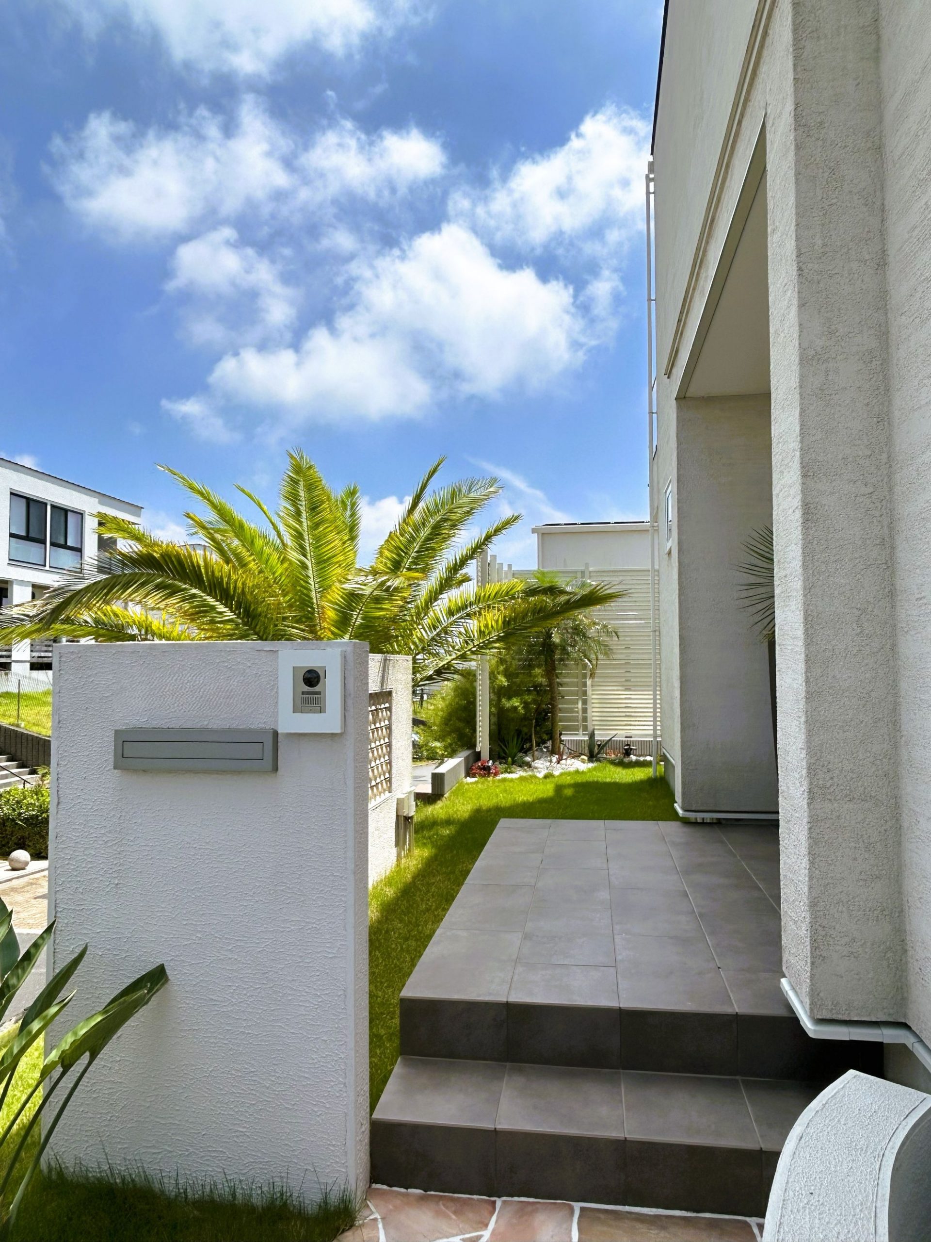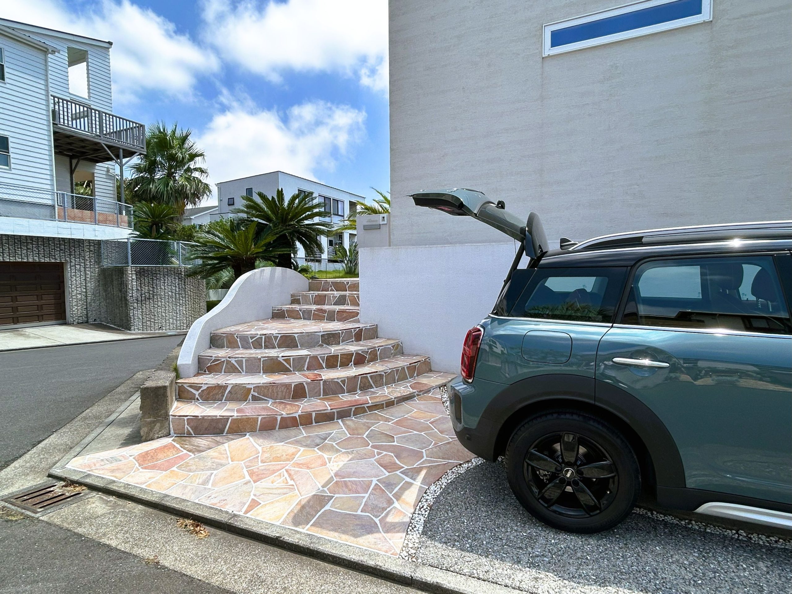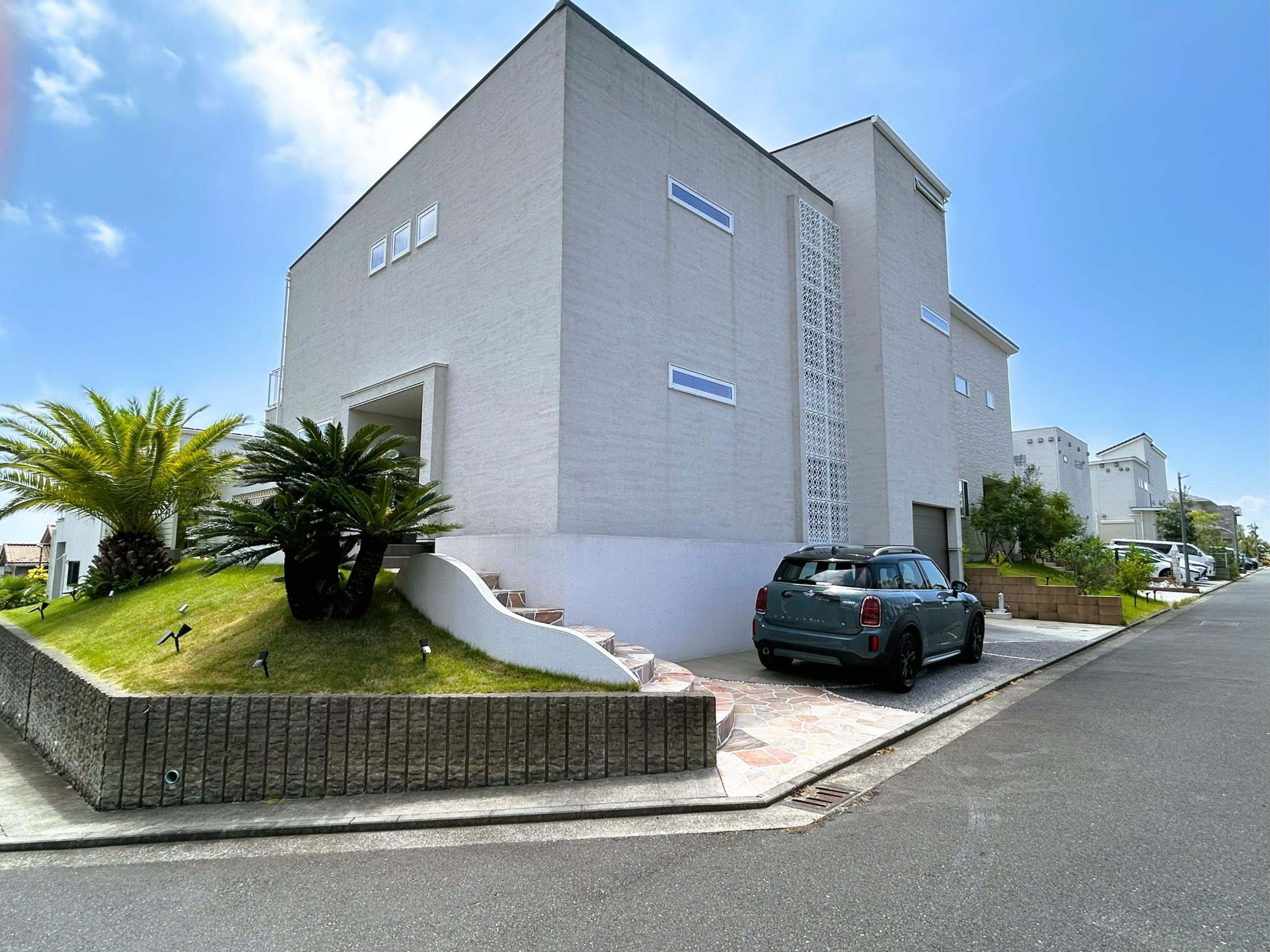 リゾート地を彷彿とさせる天然石のアプローチが、空間全体に開放感をもたらします。佐島というエリアを象徴するような白い外壁のこの一軒家は自宅と別荘、どちらにも見せることが出来ます。