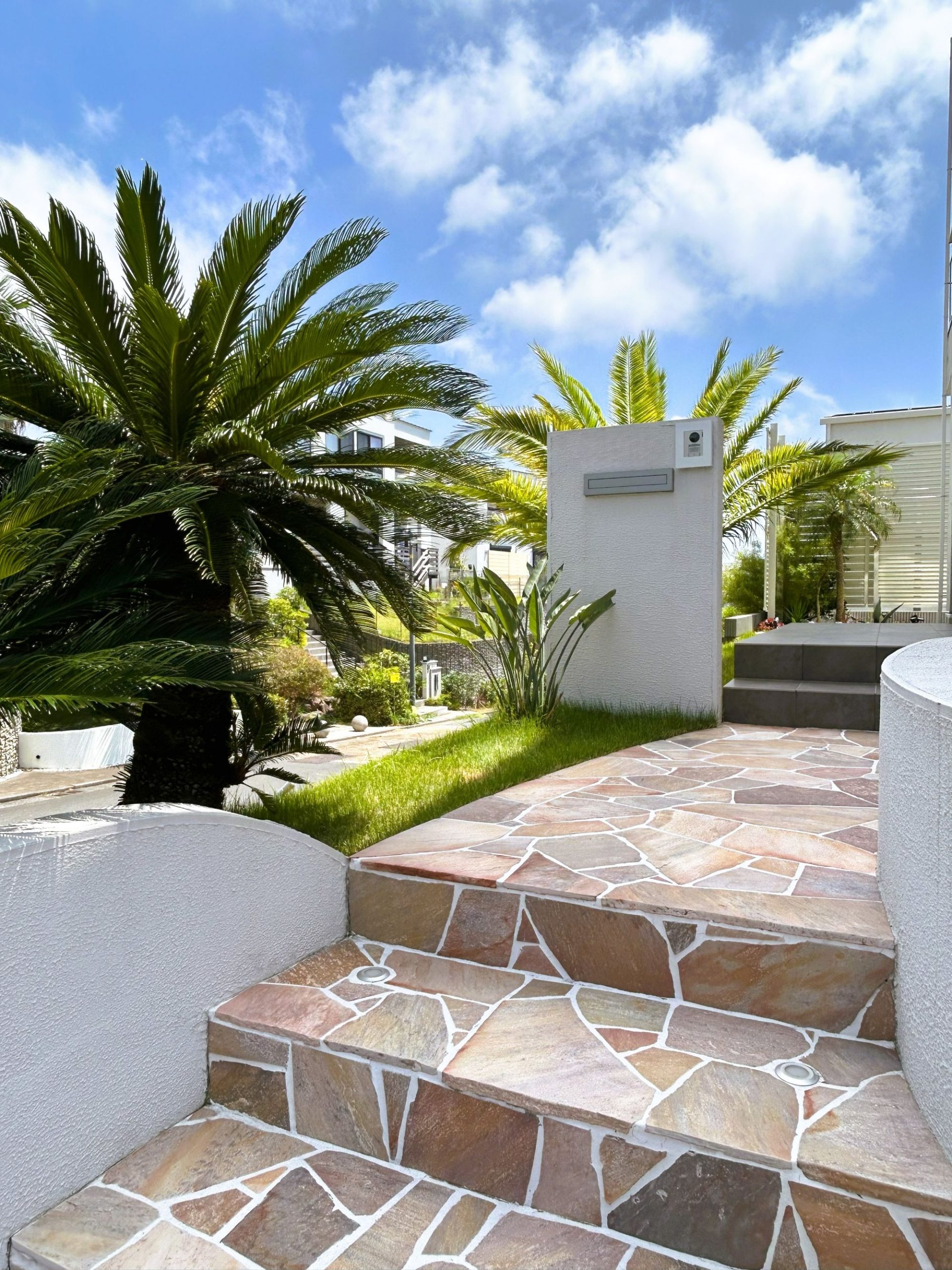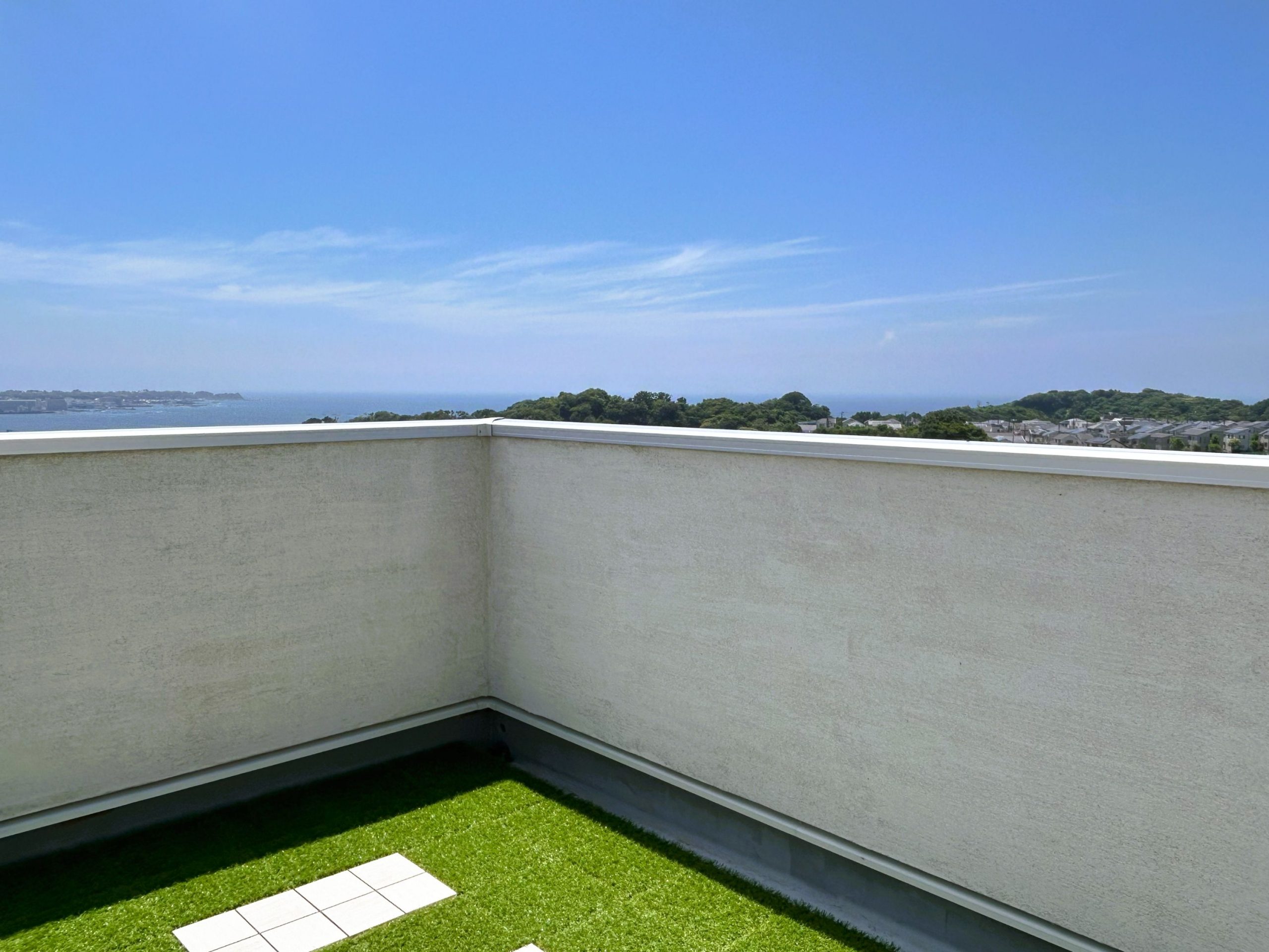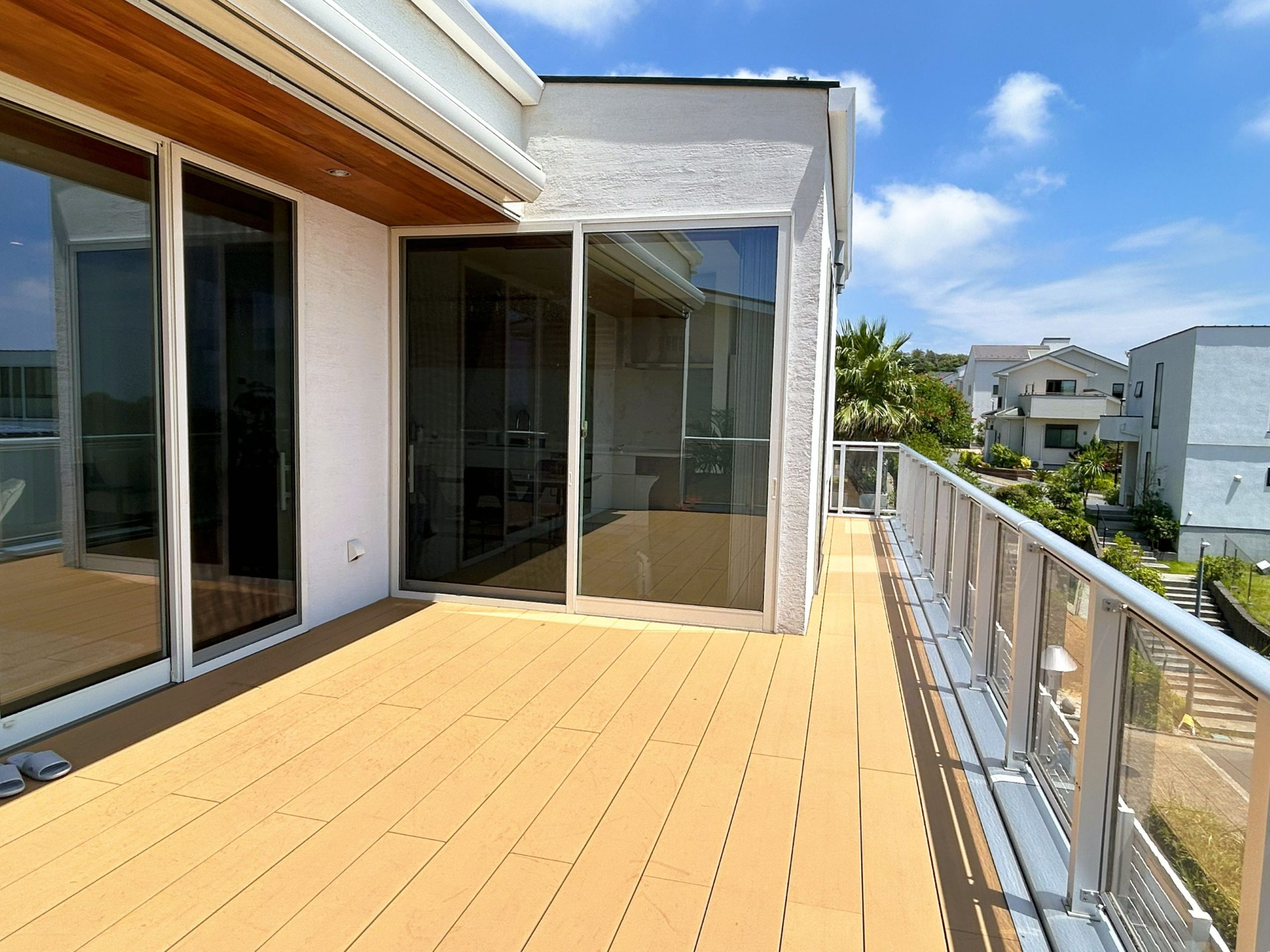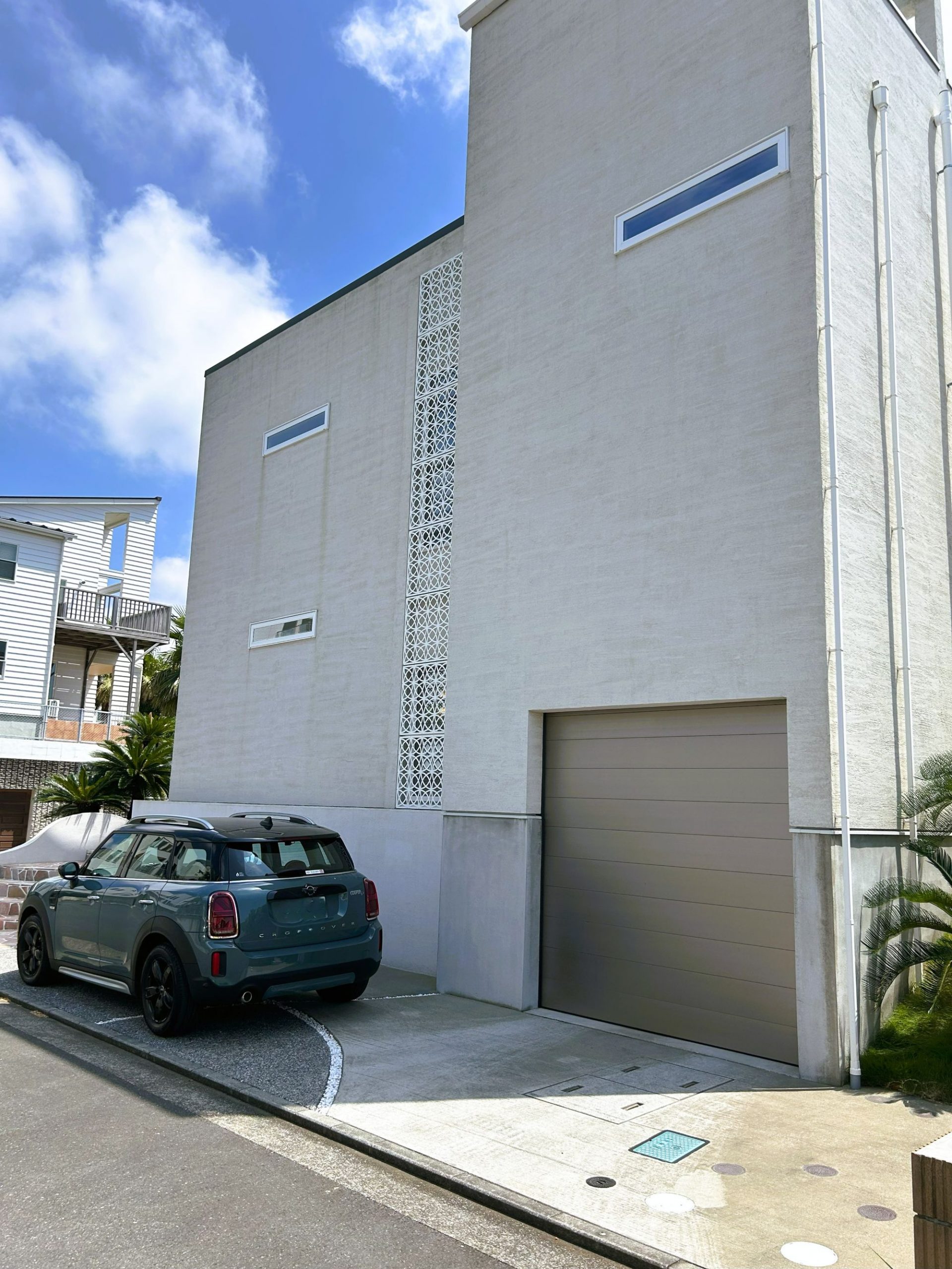 リゾート地を彷彿とさせる天然石のアプローチが、空間全体に開放感をもたらします。佐島というエリアを象徴するような白い外壁のこの一軒家は自宅と別荘、どちらにも見せることが出来ます。