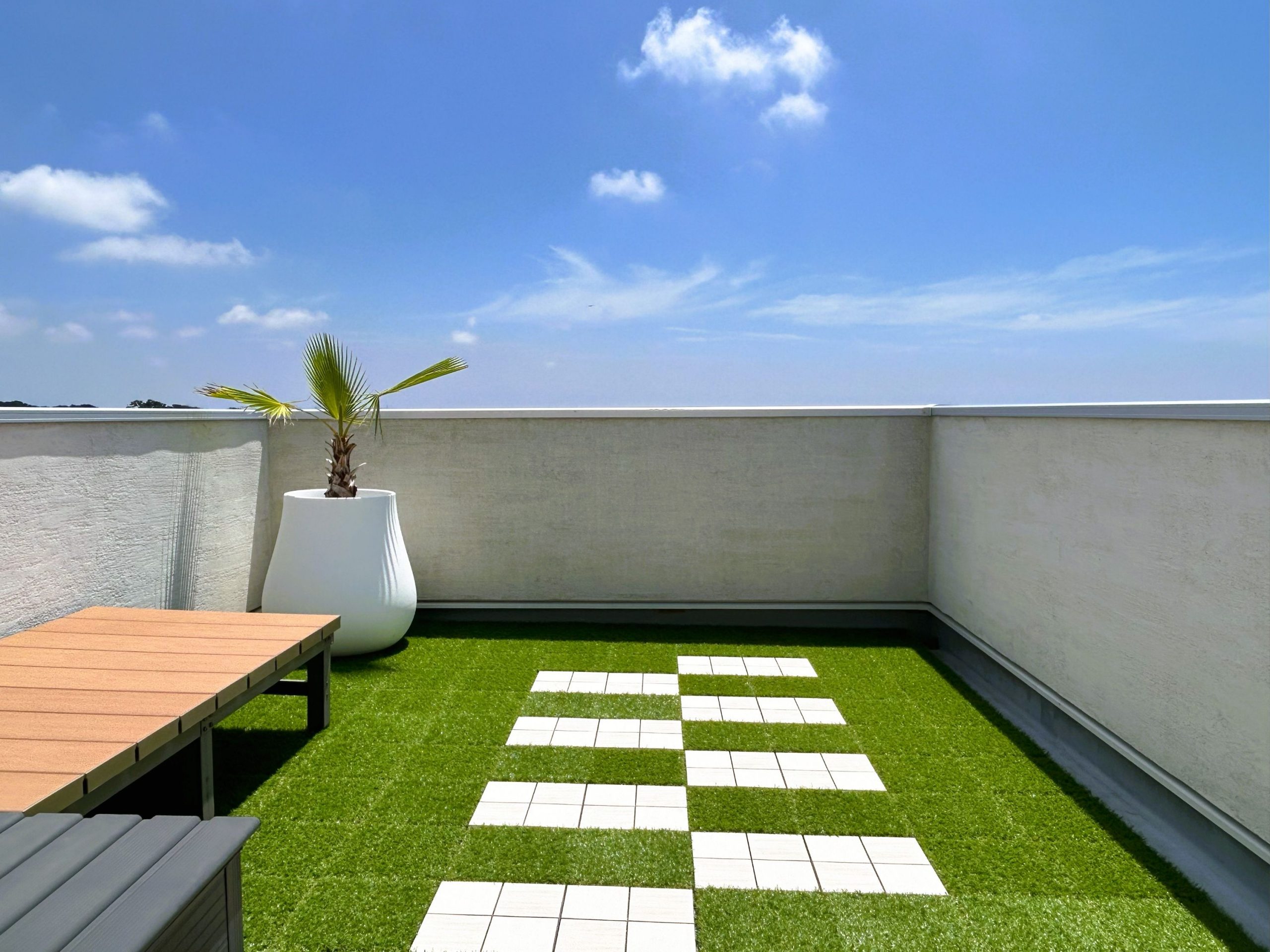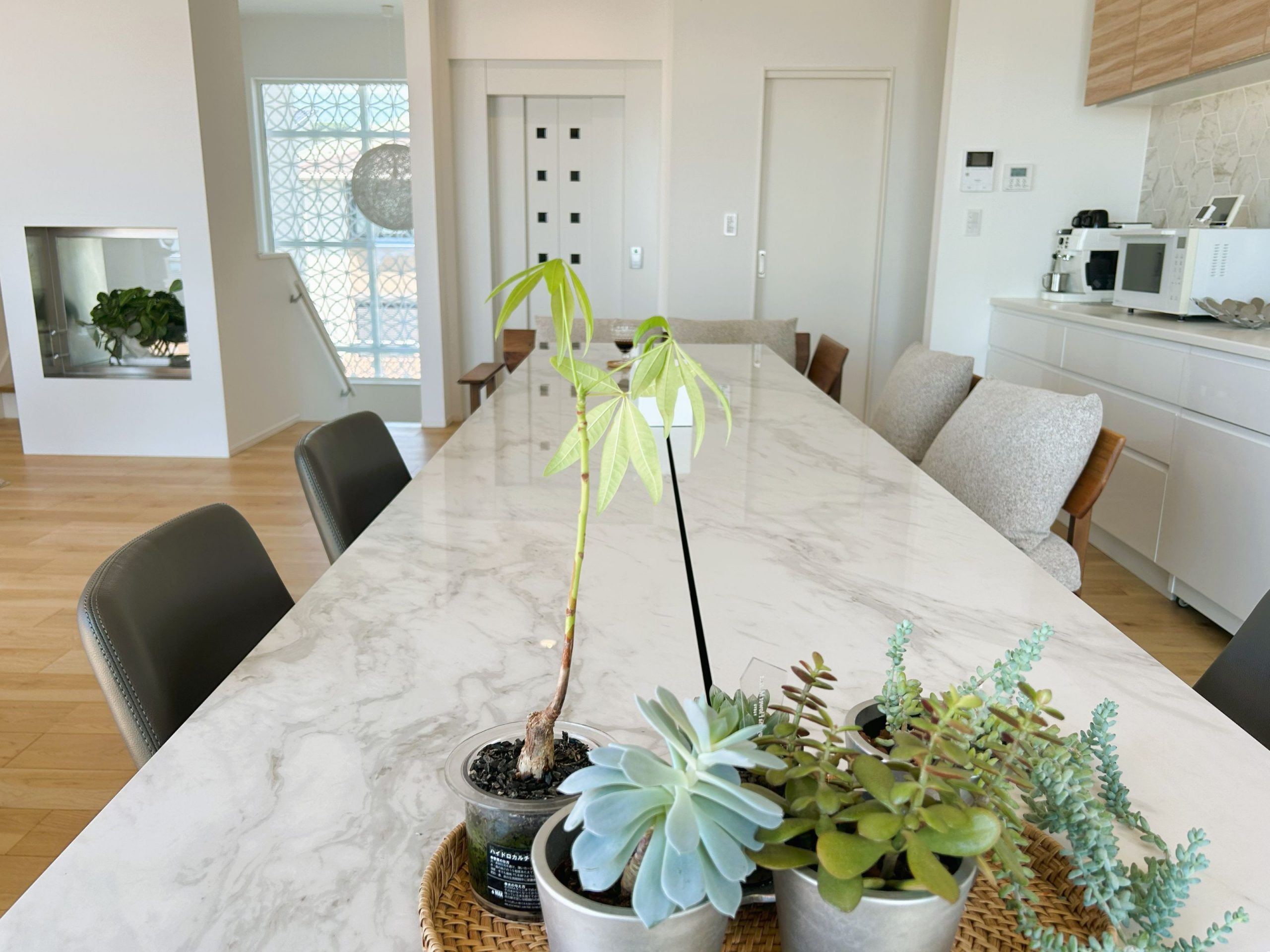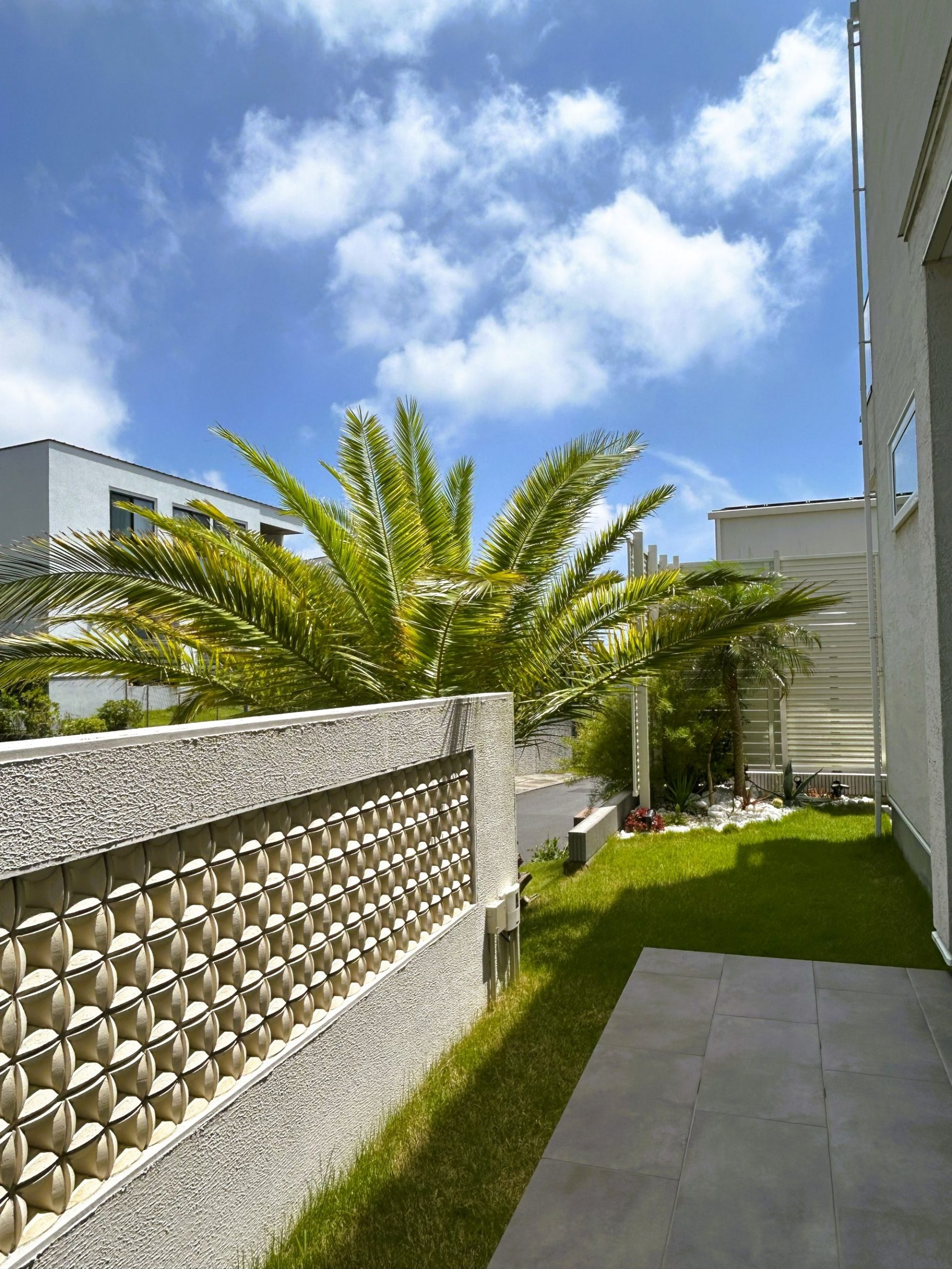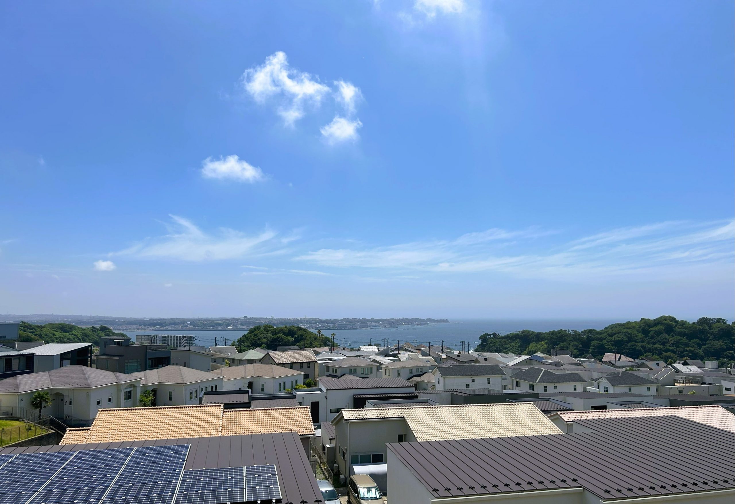 リゾート地を彷彿とさせる天然石のアプローチが、空間全体に開放感をもたらします。佐島というエリアを象徴するような白い外壁のこの一軒家は自宅と別荘、どちらにも見せることが出来ます。