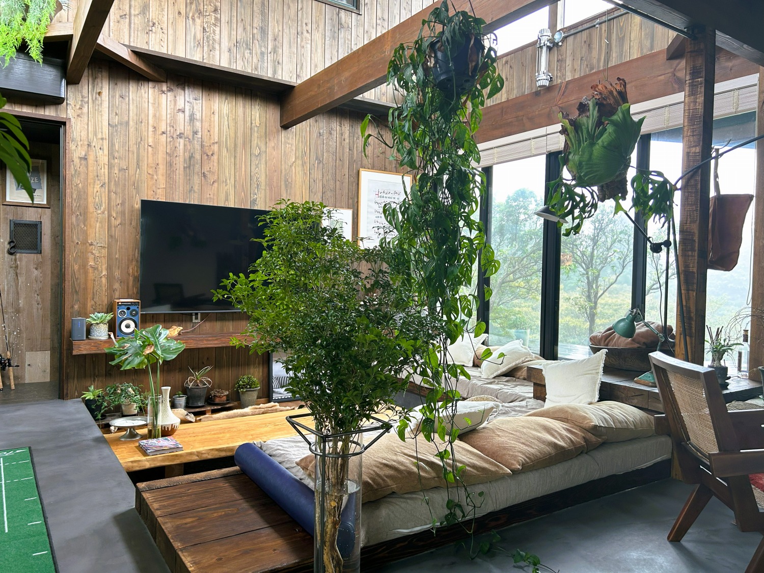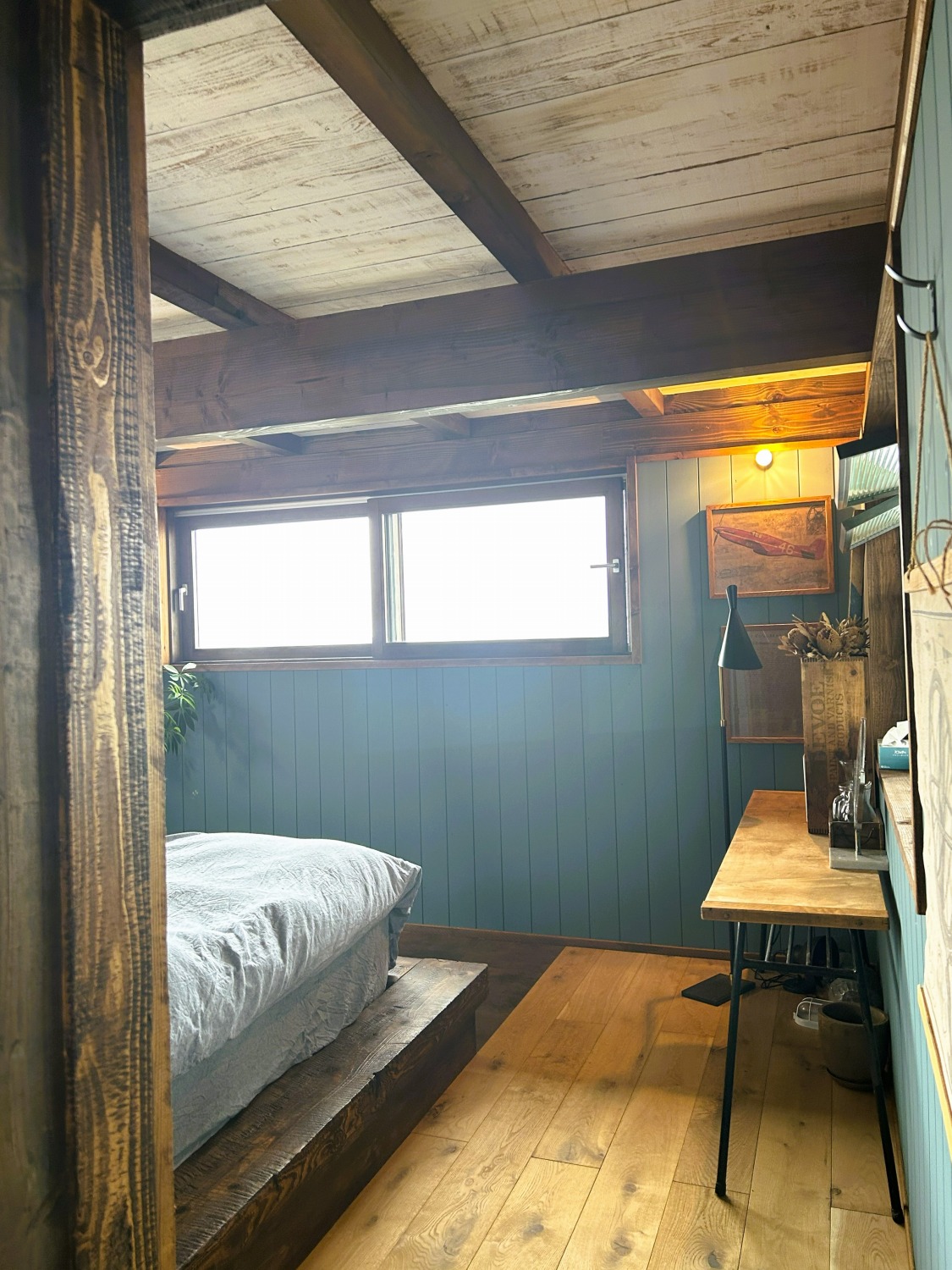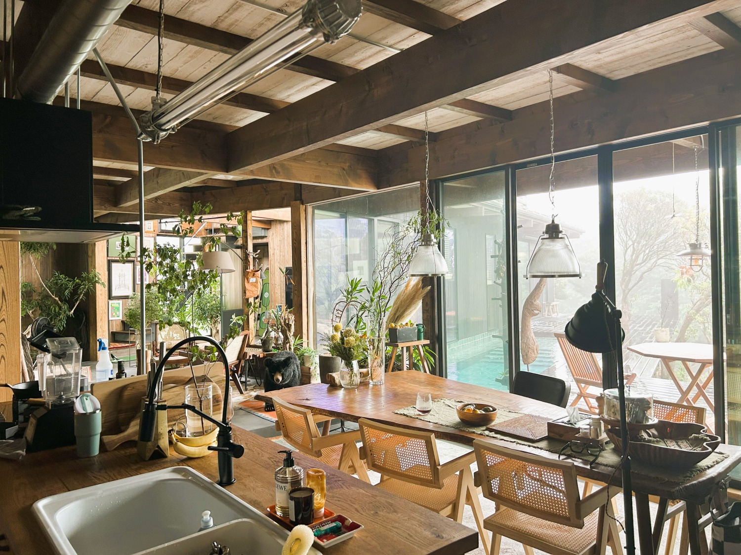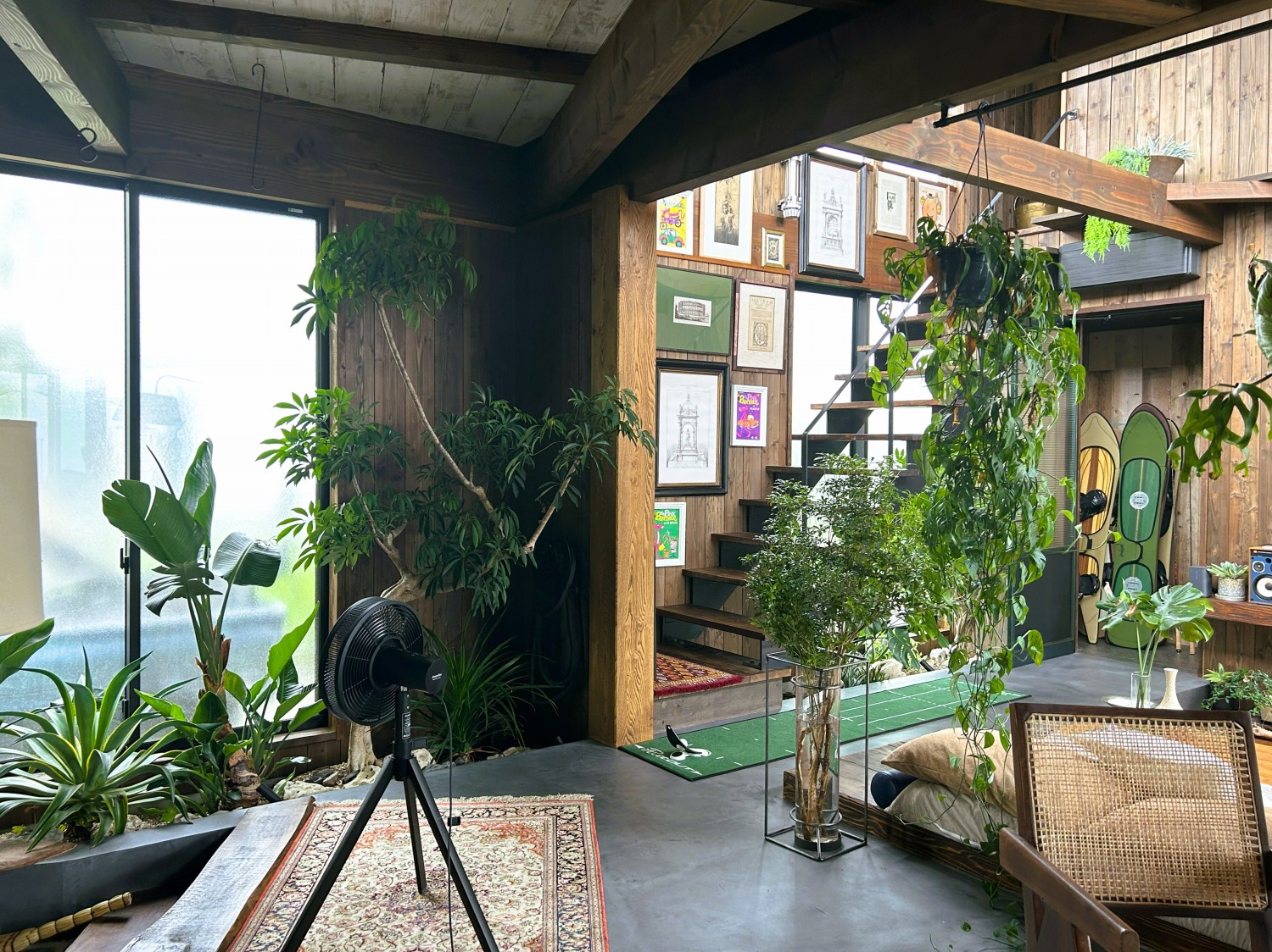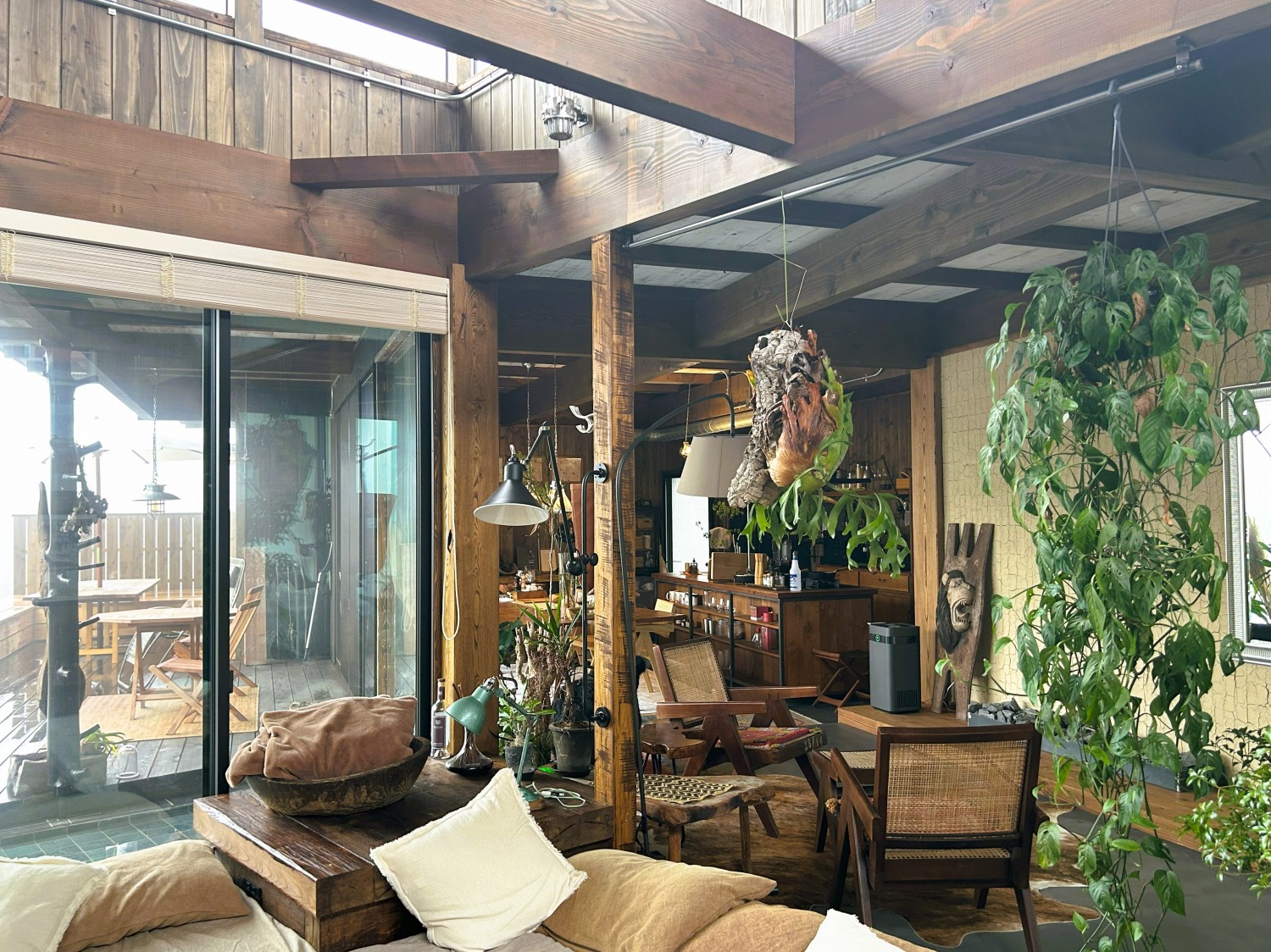 室内は無垢材の梁や柱、モルタル床、タイル壁、アイアン階段など、多様な素材を組み合わせています。内装に使われる木材はエイジング加工などのヴィンテージな感じで、木張りにはシャビーシックな塗装が施され、それらに合う家具、ラグマット、照明が配置されています。個性的な要素が多いにもかかわらず、全体としては心地よいリゾート感に包まれており、調和のとれた空間になっています。