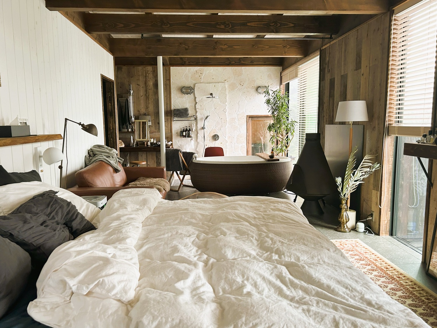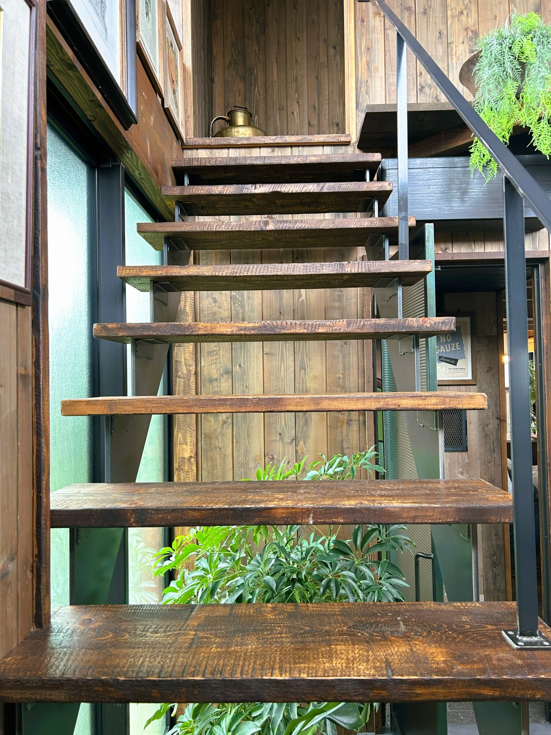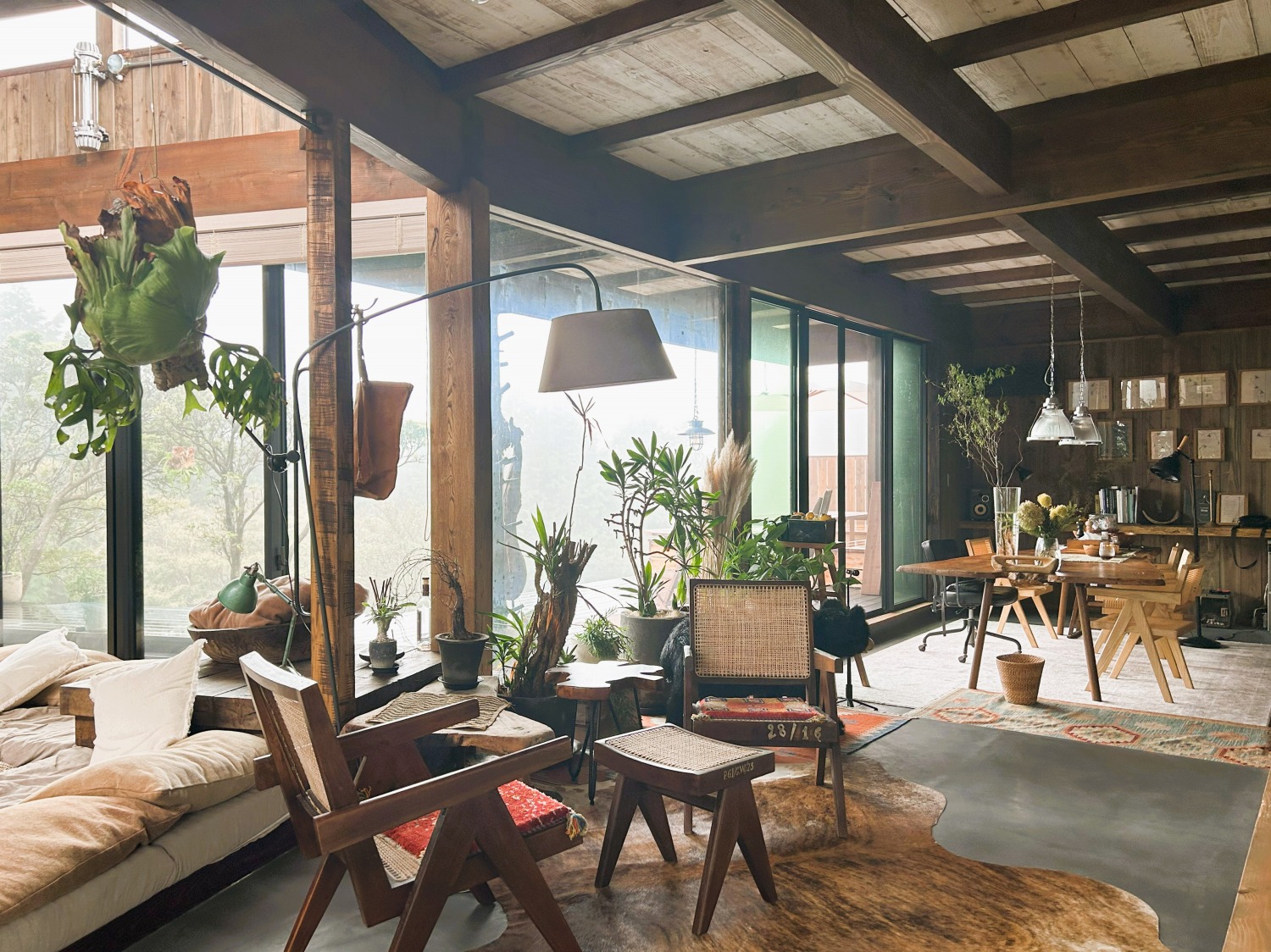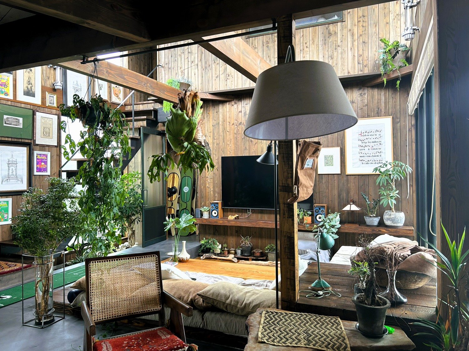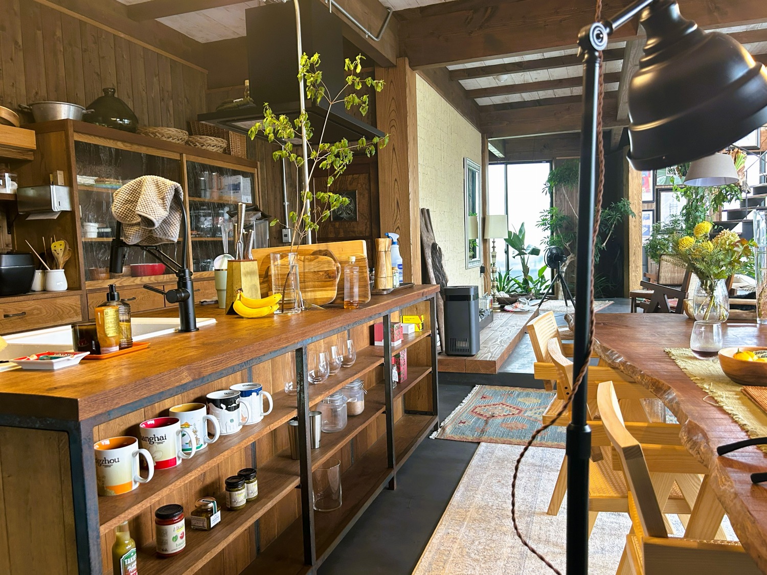 室内は無垢材の梁や柱、モルタル床、タイル壁、アイアン階段など、多様な素材を組み合わせています。内装に使われる木材はエイジング加工などのヴィンテージな感じで、木張りにはシャビーシックな塗装が施され、それらに合う家具、ラグマット、照明が配置されています。個性的な要素が多いにもかかわらず、全体としては心地よいリゾート感に包まれており、調和のとれた空間になっています。