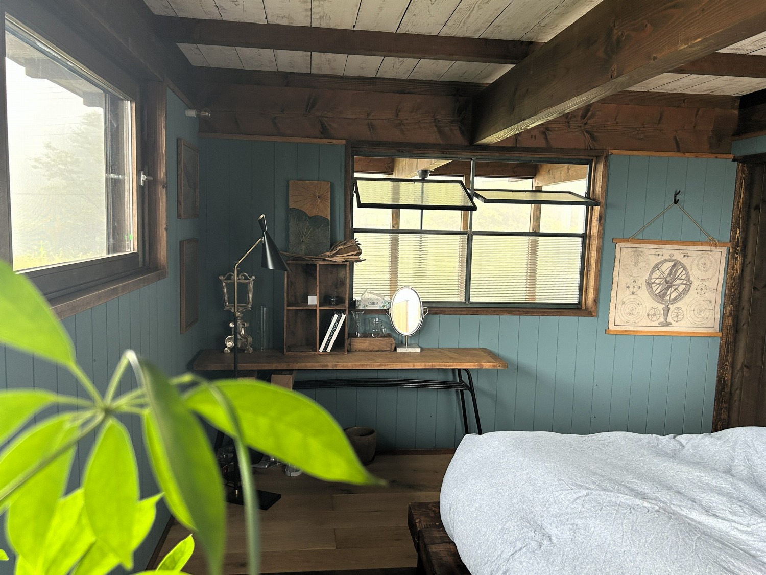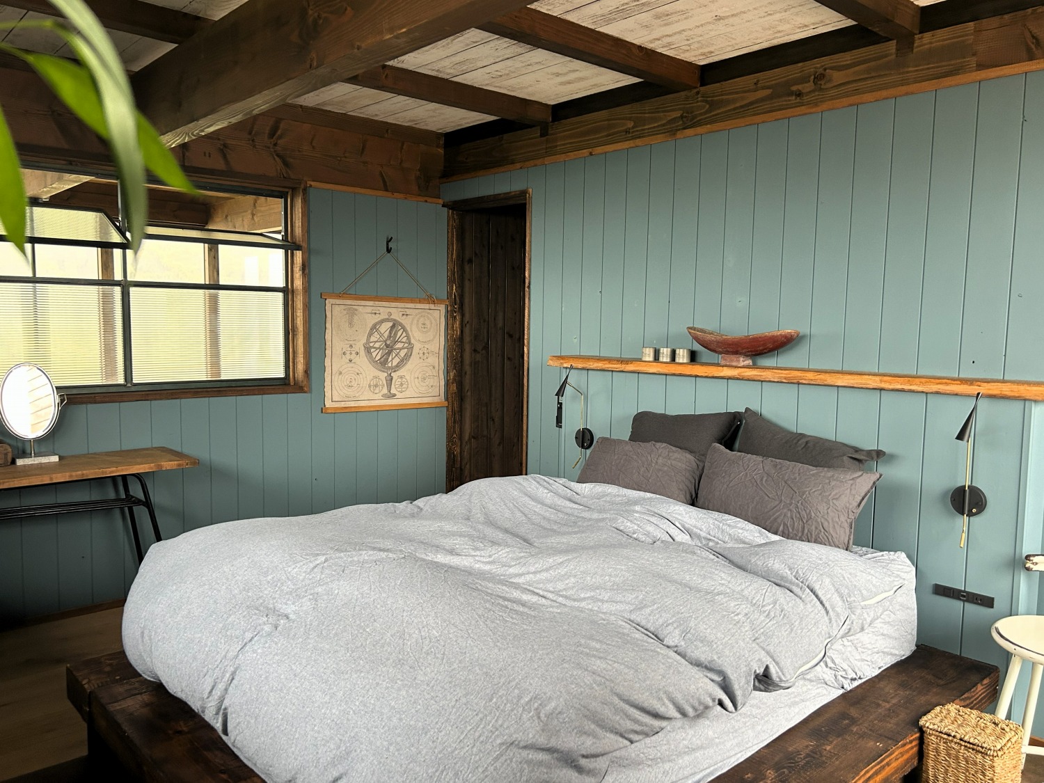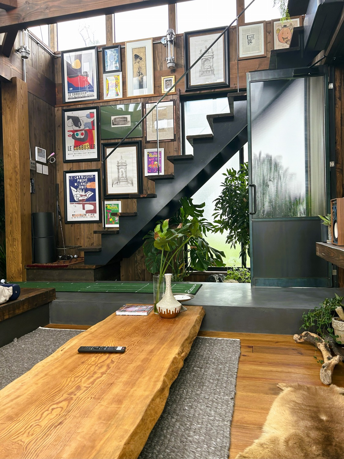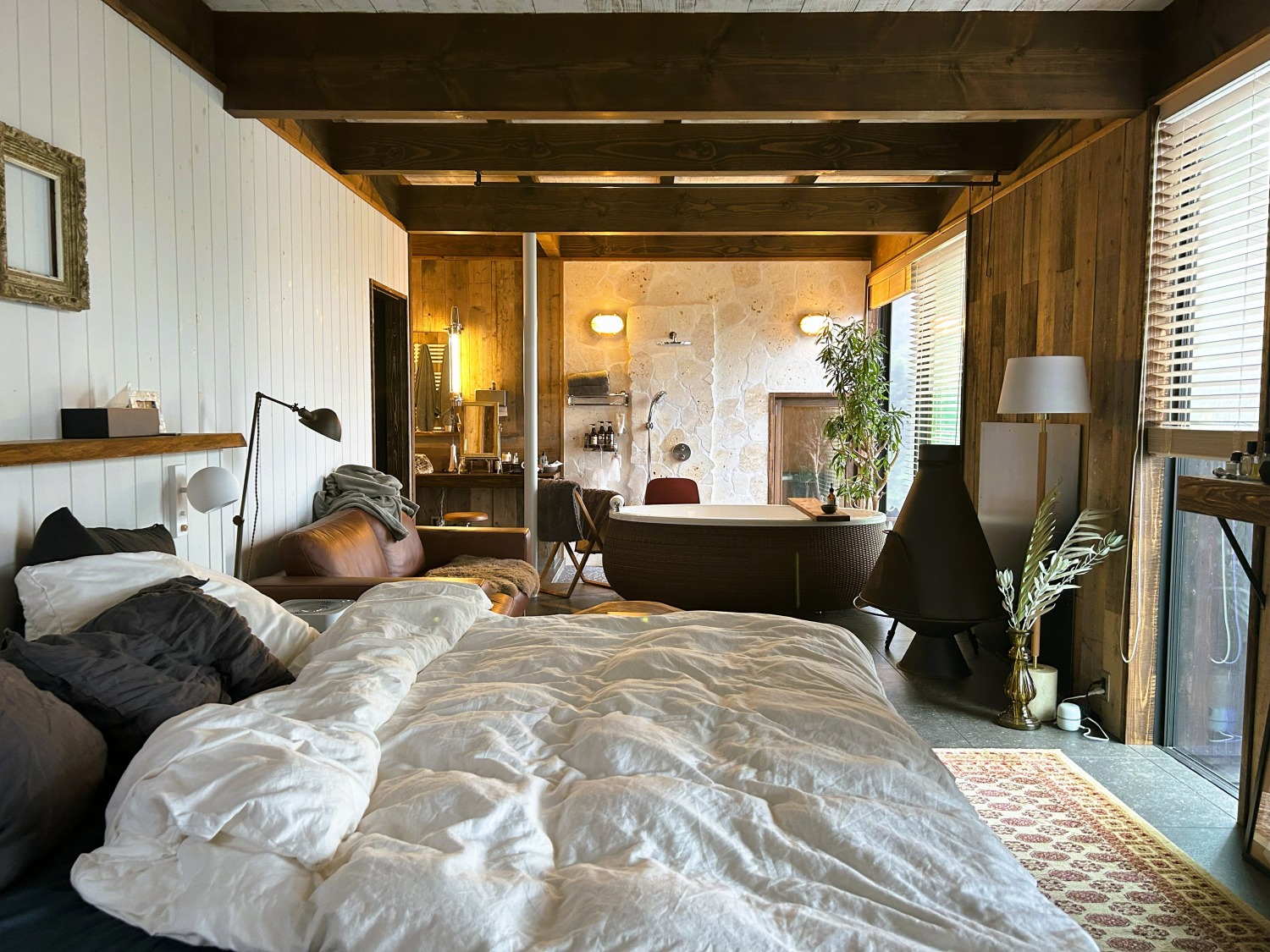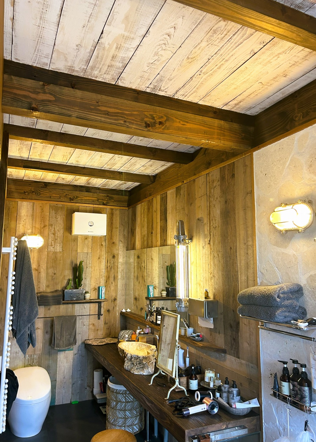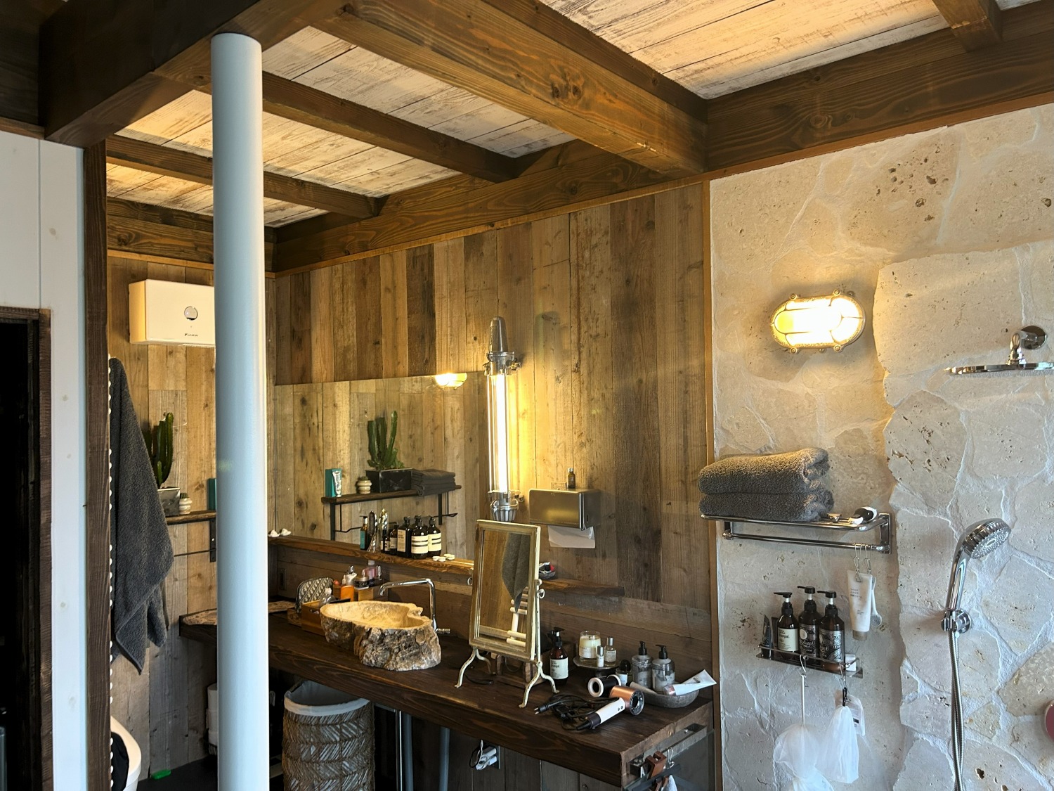 室内は無垢材の梁や柱、モルタル床、タイル壁、アイアン階段など、多様な素材を組み合わせています。内装に使われる木材はエイジング加工などのヴィンテージな感じで、木張りにはシャビーシックな塗装が施され、それらに合う家具、ラグマット、照明が配置されています。個性的な要素が多いにもかかわらず、全体としては心地よいリゾート感に包まれており、調和のとれた空間になっています。