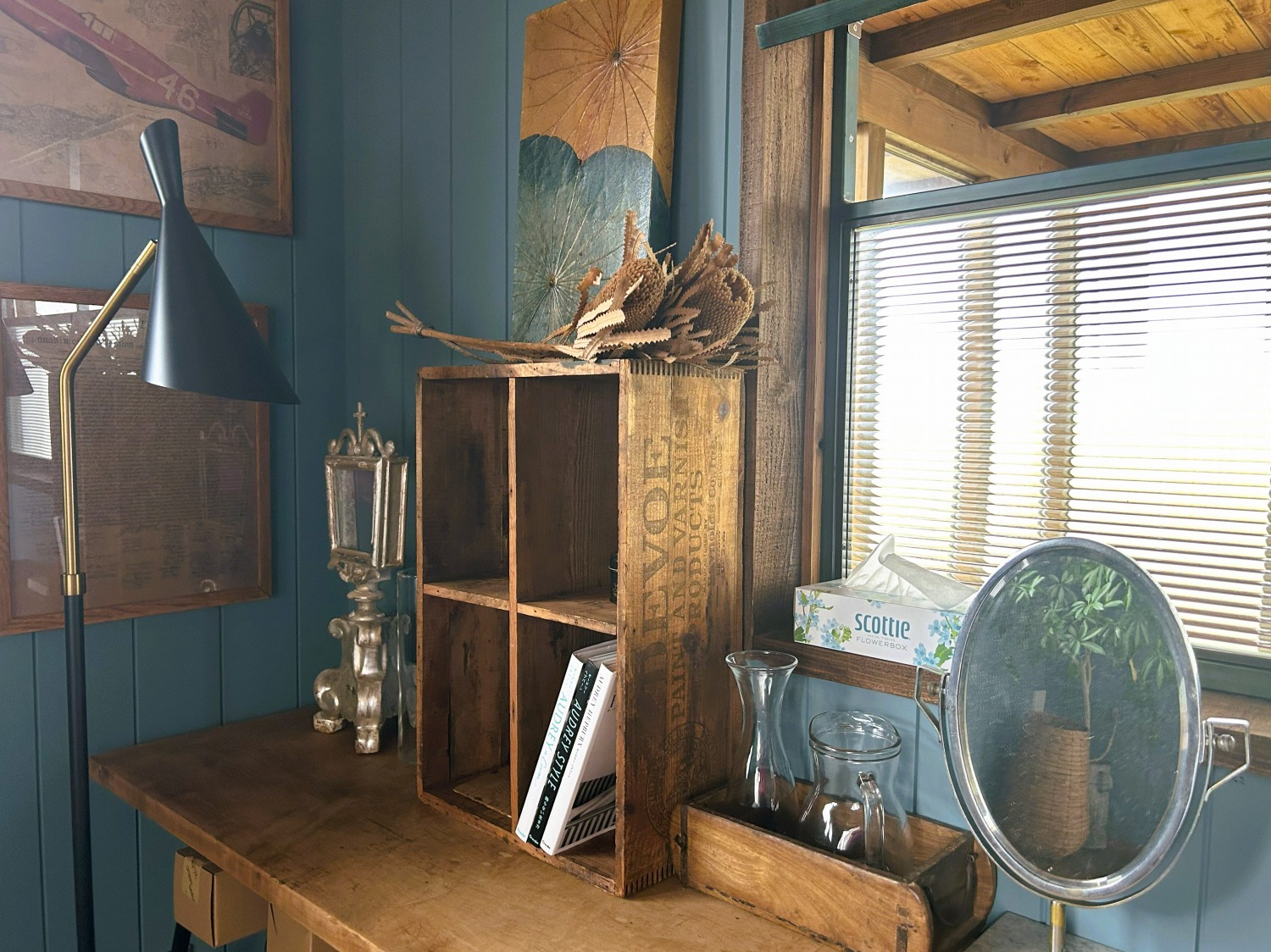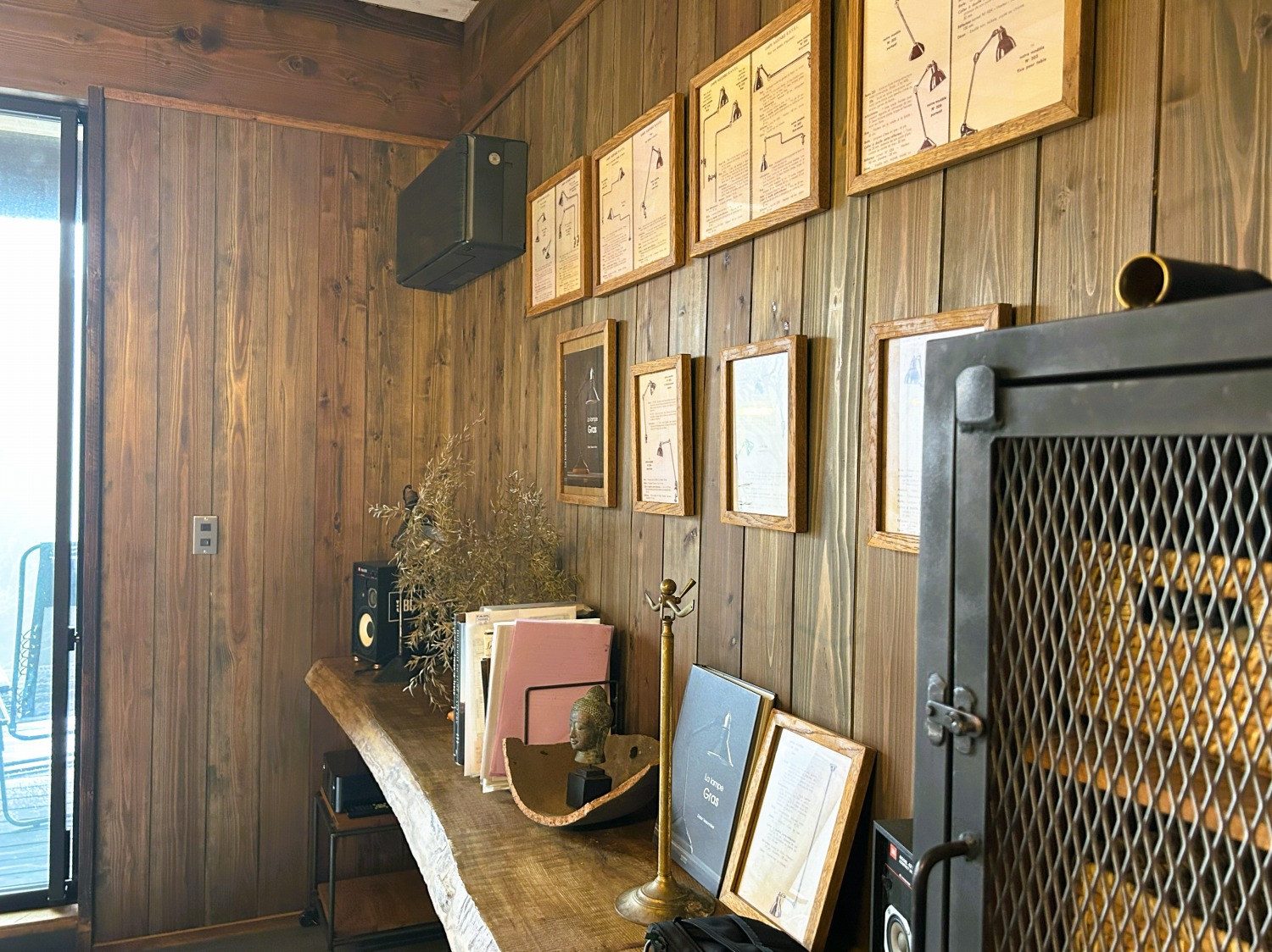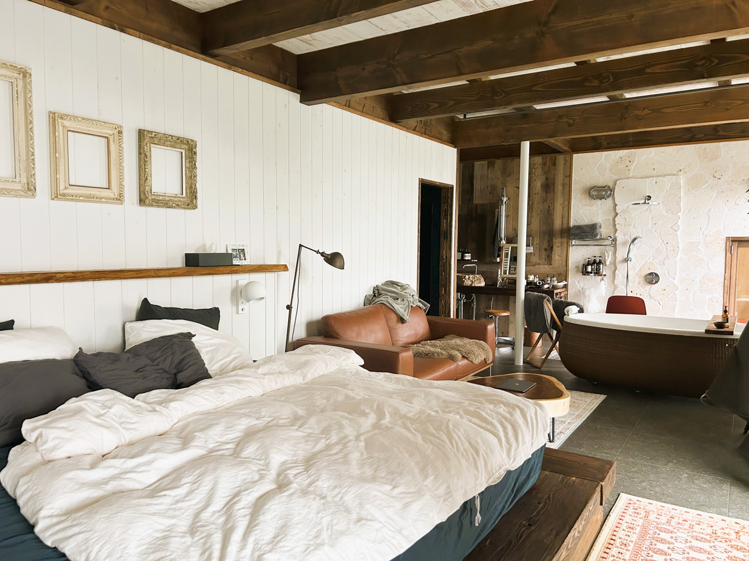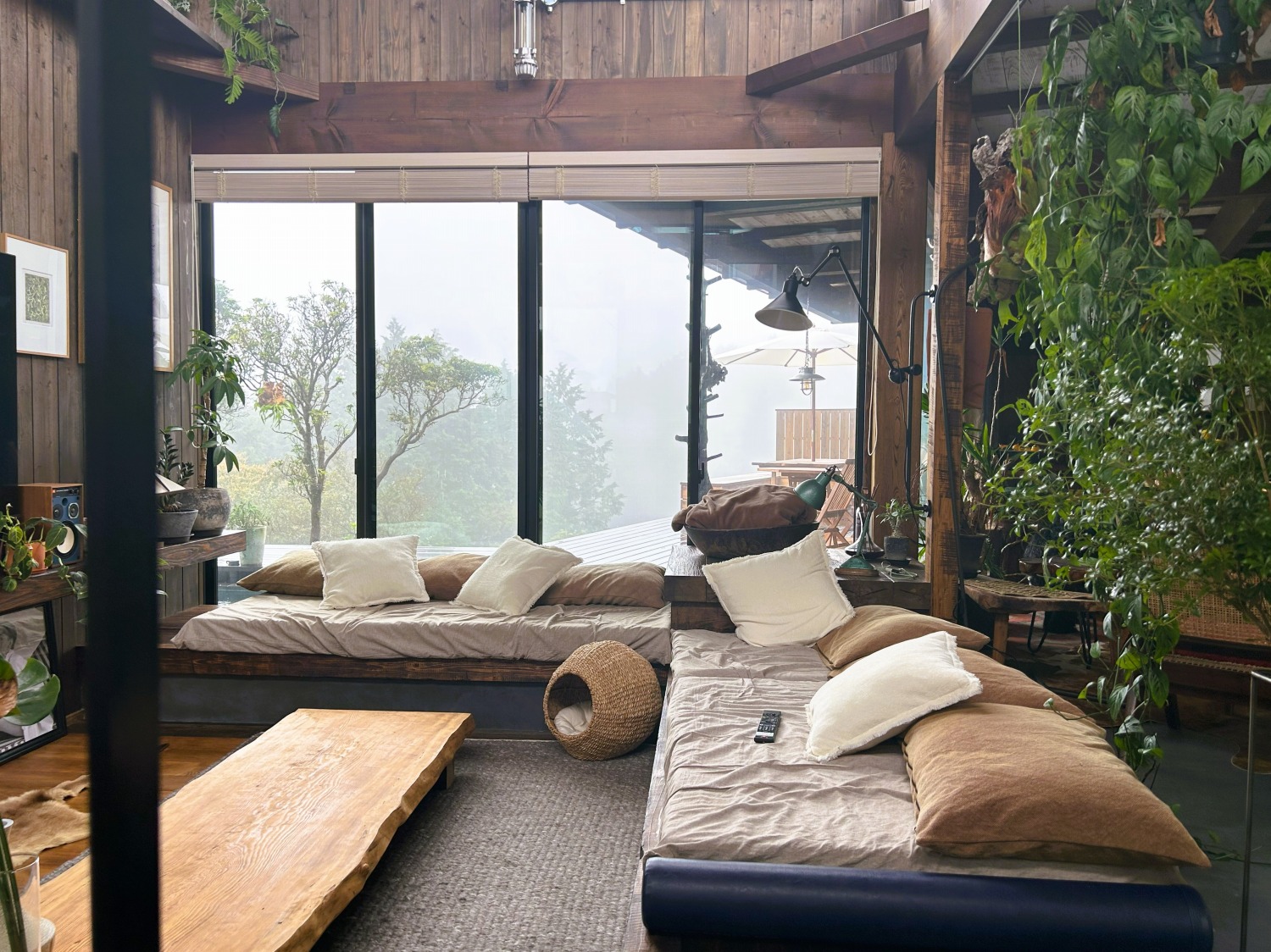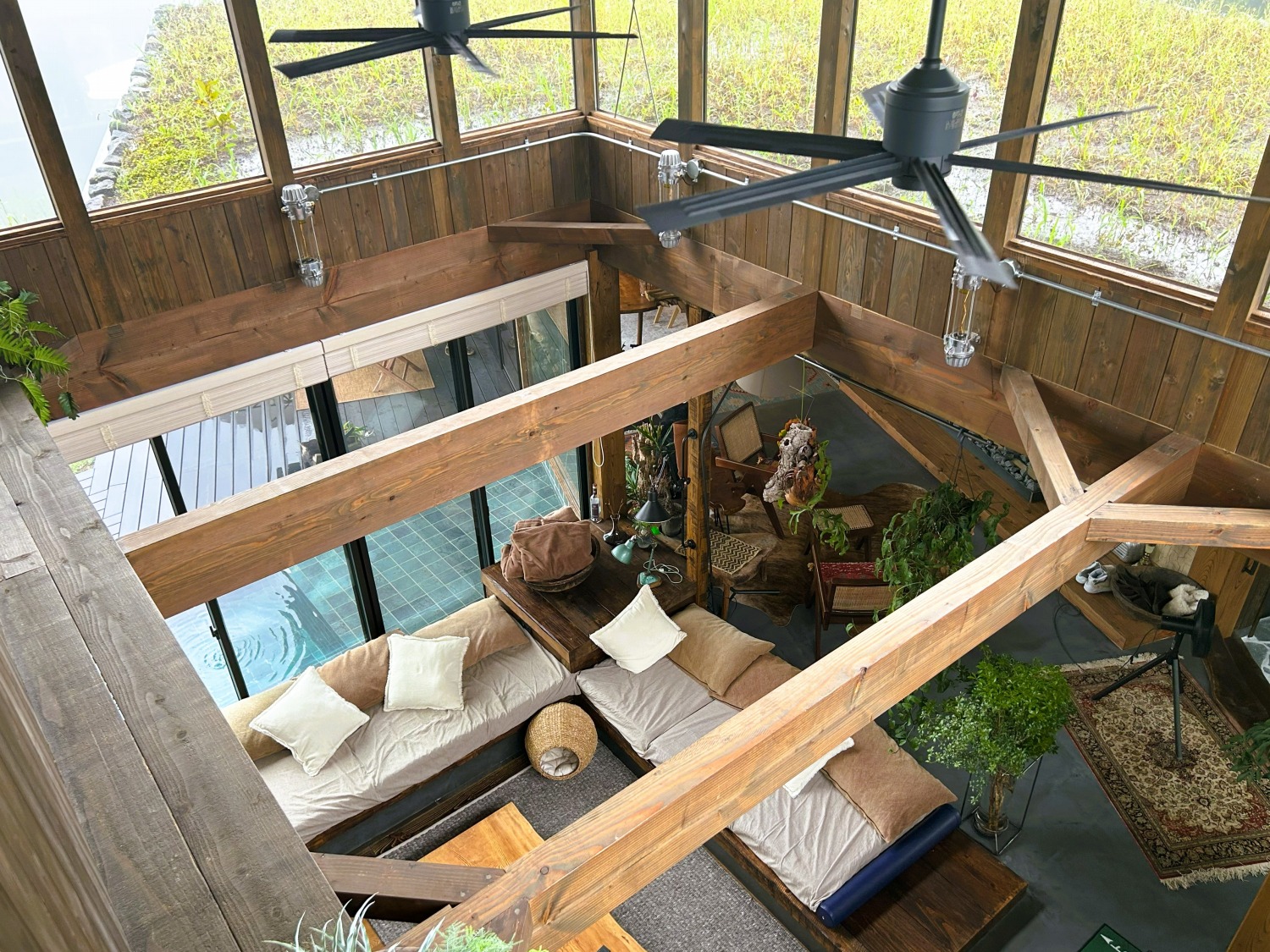 室内は無垢材の梁や柱、モルタル床、タイル壁、アイアン階段など、多様な素材を組み合わせています。内装に使われる木材はエイジング加工などのヴィンテージな感じで、木張りにはシャビーシックな塗装が施され、それらに合う家具、ラグマット、照明が配置されています。個性的な要素が多いにもかかわらず、全体としては心地よいリゾート感に包まれており、調和のとれた空間になっています。