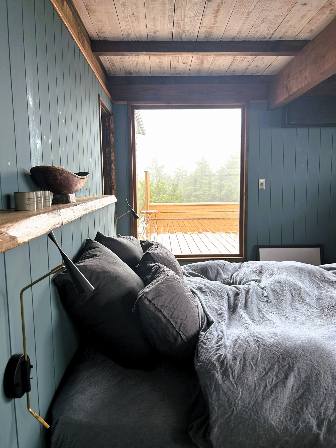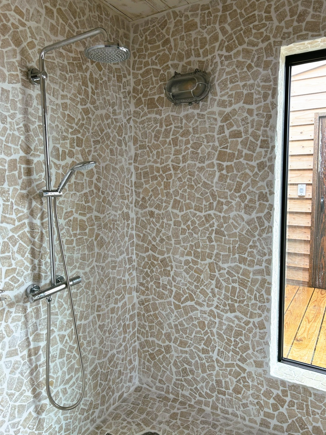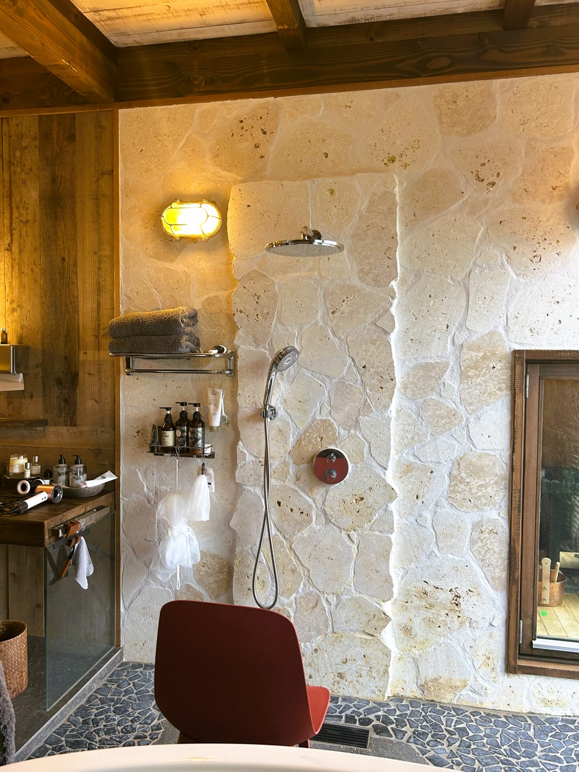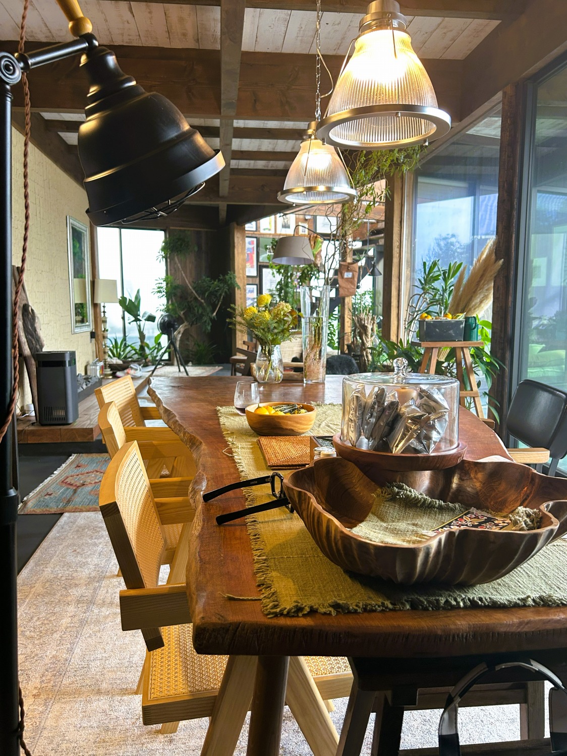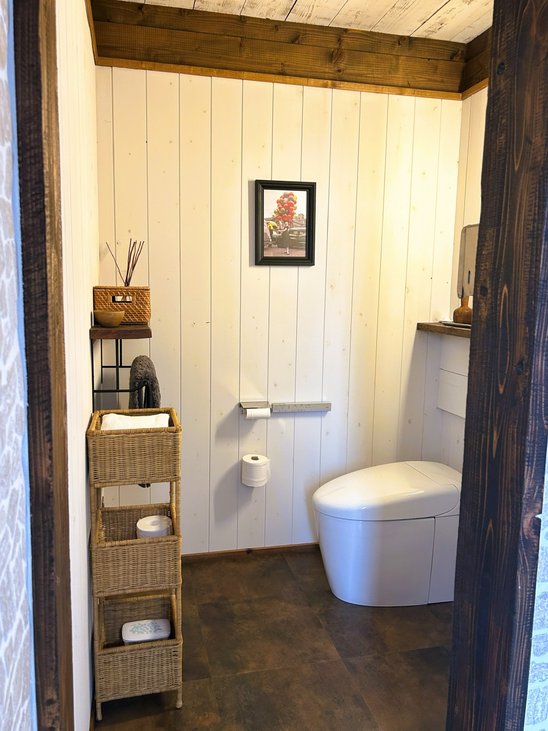 室内は無垢材の梁や柱、モルタル床、タイル壁、アイアン階段など、多様な素材を組み合わせています。内装に使われる木材はエイジング加工などのヴィンテージな感じで、木張りにはシャビーシックな塗装が施され、それらに合う家具、ラグマット、照明が配置されています。個性的な要素が多いにもかかわらず、全体としては心地よいリゾート感に包まれており、調和のとれた空間になっています。