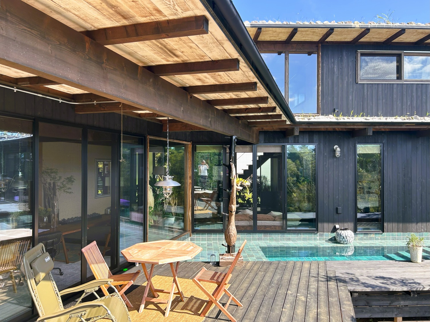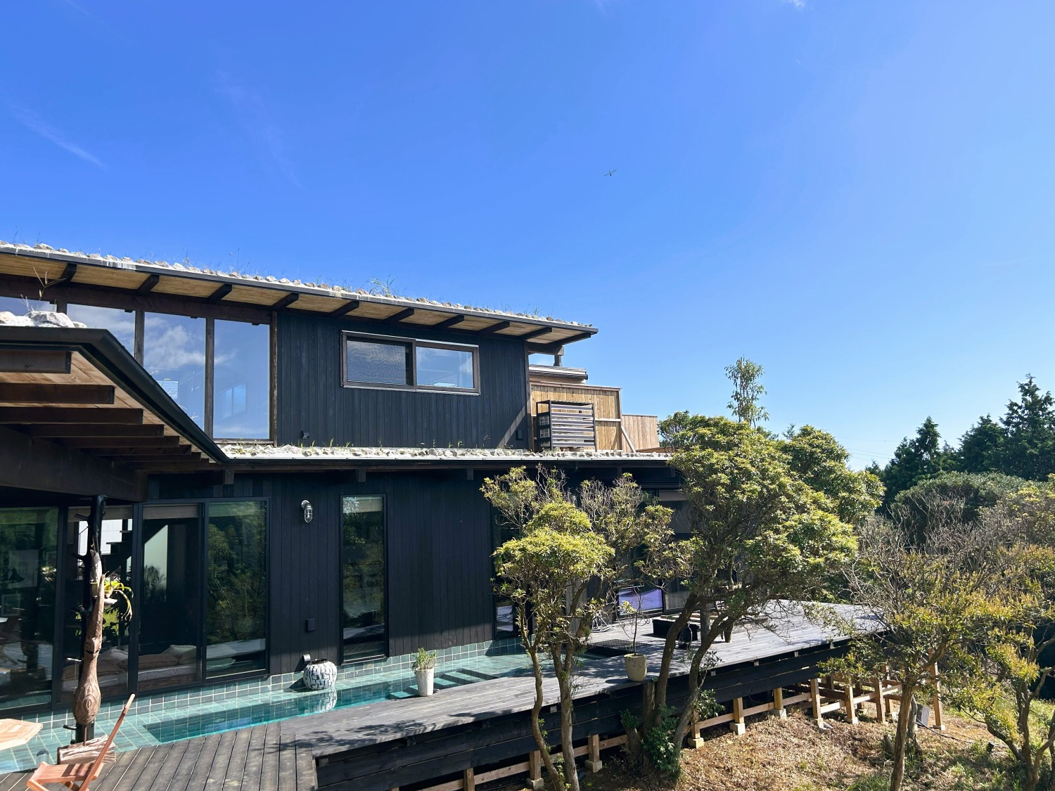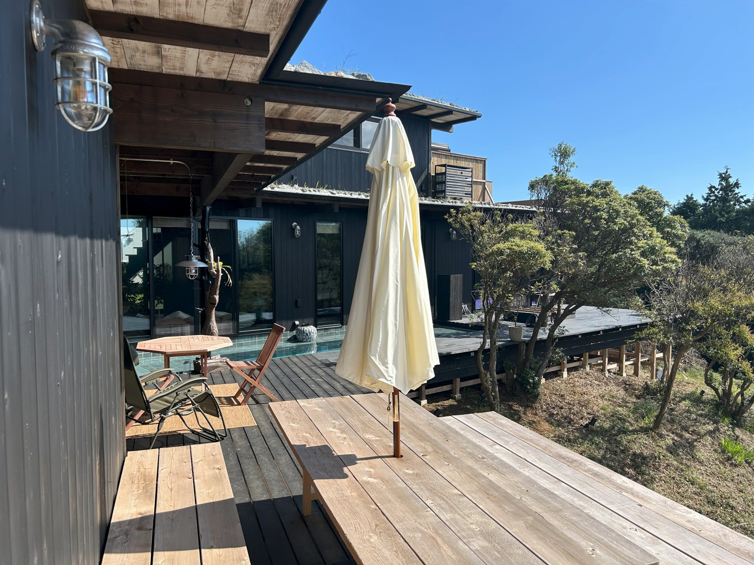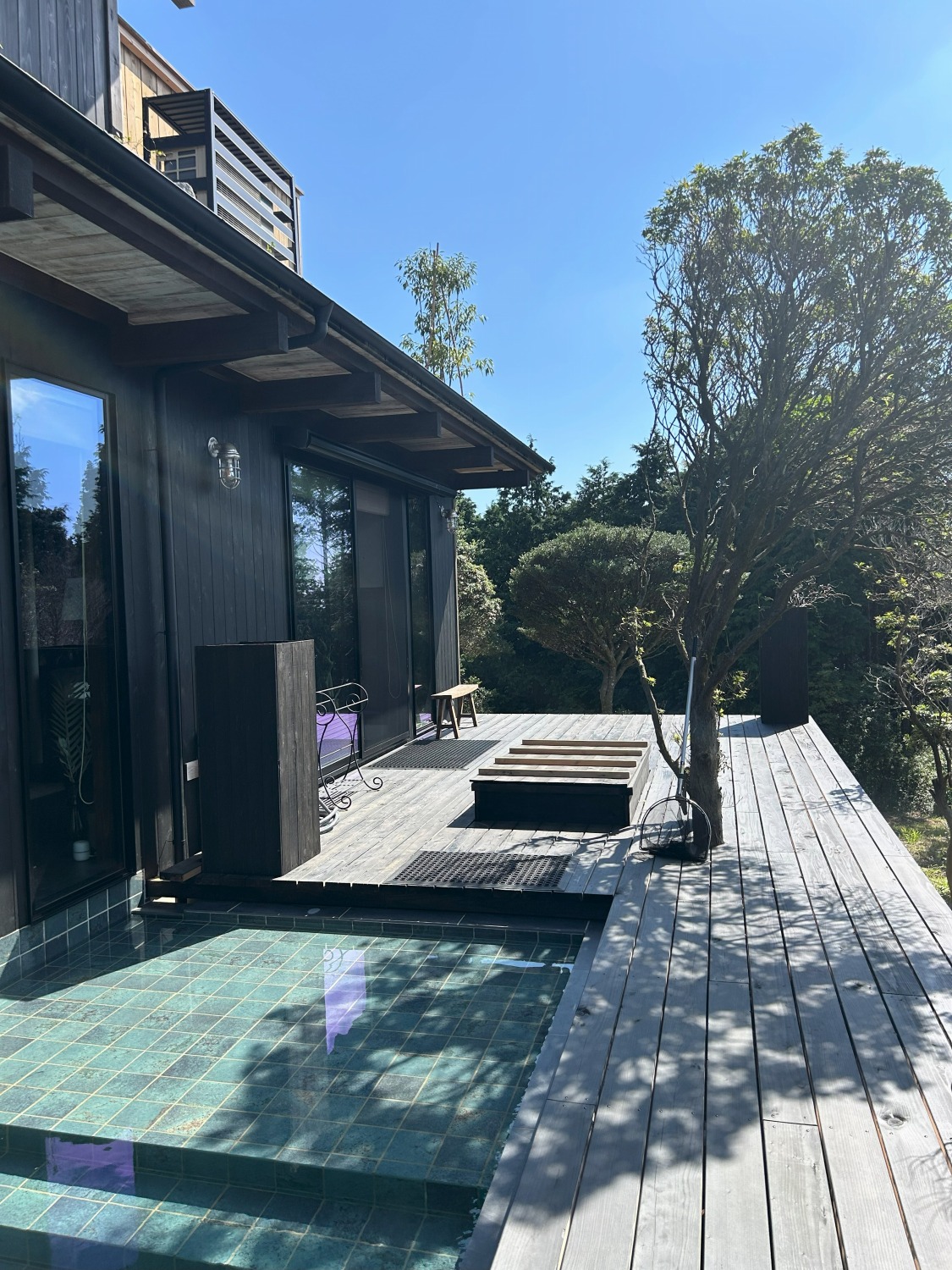 箱根エリアに位置する一軒家スタジオ。都内から車で約90分のアクセスで、芦ノ湖近くの高台に建つセカンドハウスです。外観は黒い板張りでシンプルな印象。敷地内には広い駐車スペースがあり、車両や人物の出入りシーンに対応可能です。建物は庭側の傾斜に沿ってL字型に配置され、どの部屋からもウッドデッキへ出られる設計。大きな窓の先には自然が広がり、西側には富士山を望むこともできます。ウッドデッキには水深の浅いプール、パーティーブース、パラソル、木製テーブル&チェアなどが揃い、すぐに撮影の背景として活用できます。柵を設けないことで最高の抜けを保ちながら、周囲からの視線は遮られているためプライバシーも確保されています。