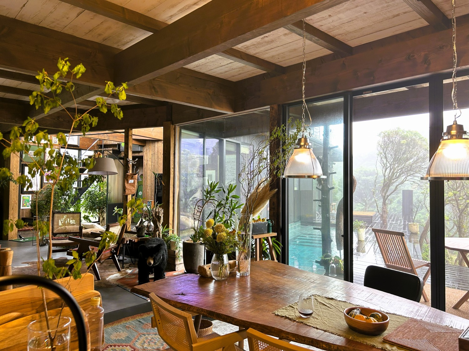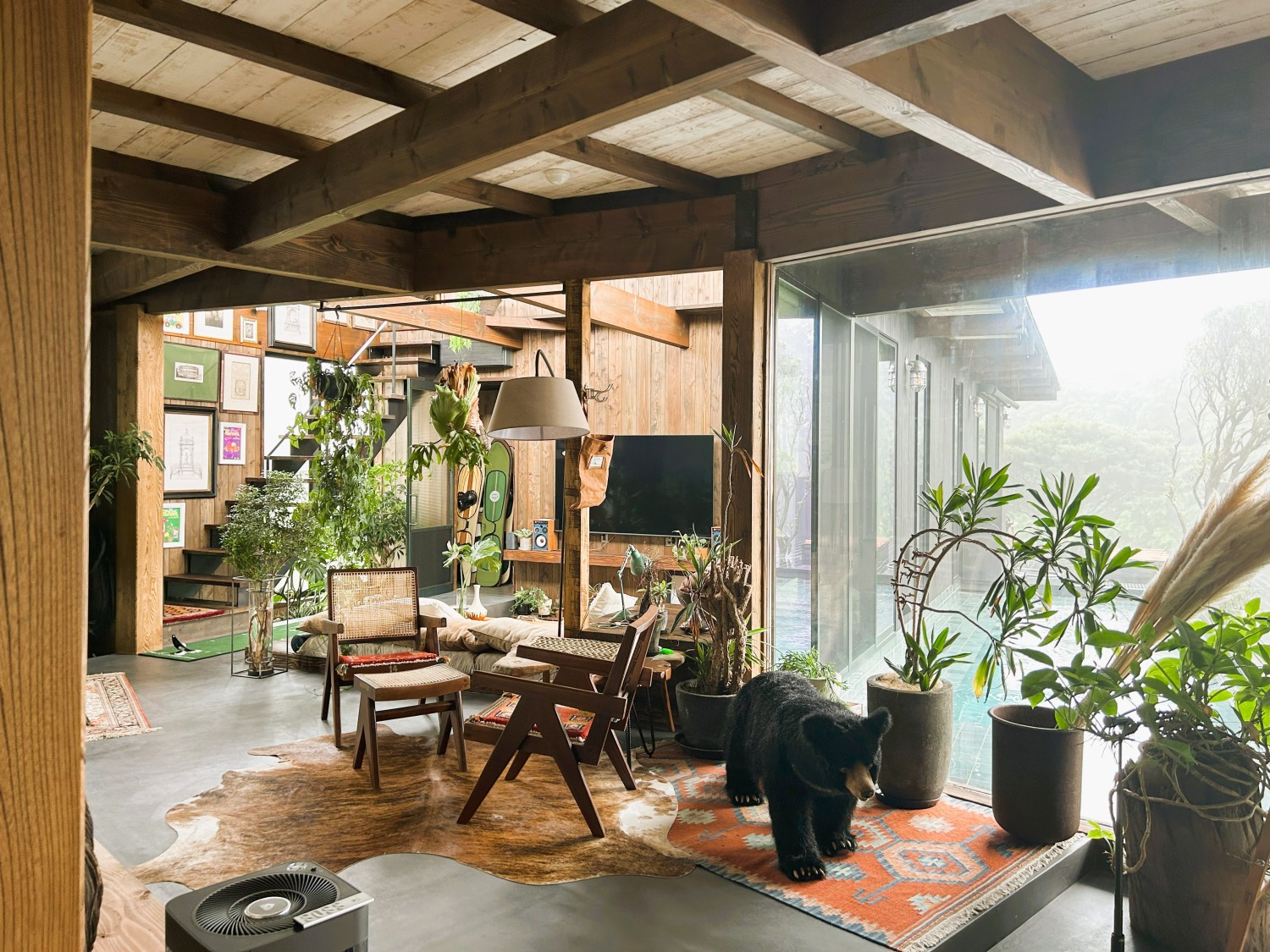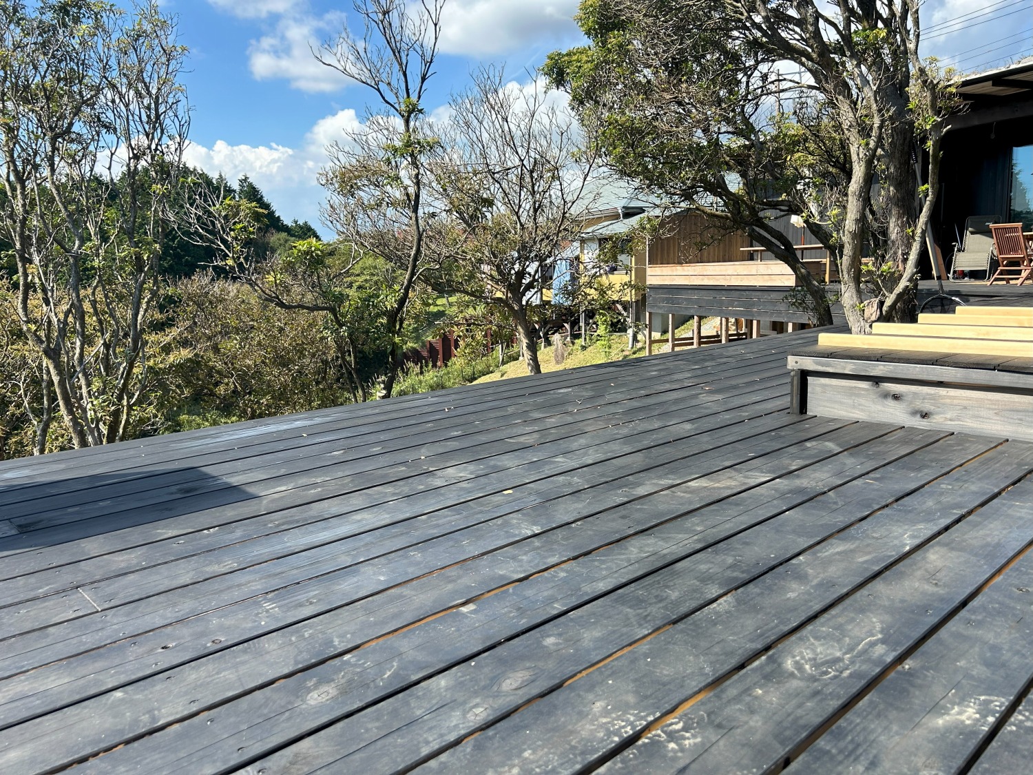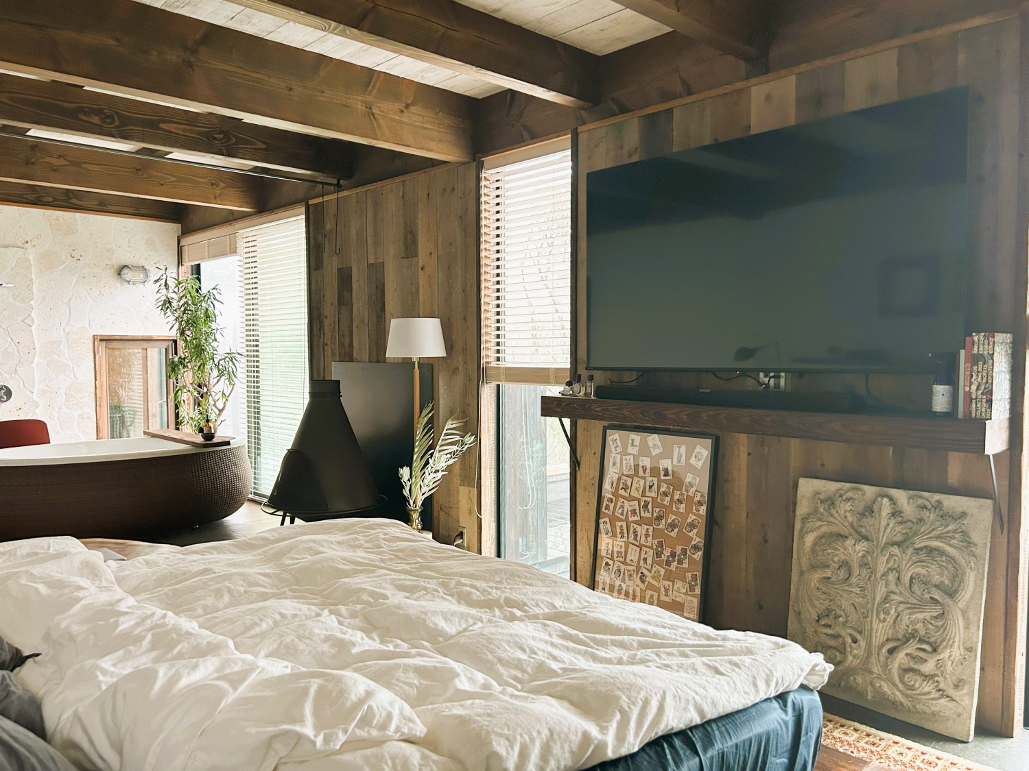 箱根エリアに位置する一軒家スタジオ。都内から車で約90分のアクセスで、芦ノ湖近くの高台に建つセカンドハウスです。外観は黒い板張りでシンプルな印象。敷地内には広い駐車スペースがあり、車両や人物の出入りシーンに対応可能です。建物は庭側の傾斜に沿ってL字型に配置され、どの部屋からもウッドデッキへ出られる設計。大きな窓の先には自然が広がり、西側には富士山を望むこともできます。ウッドデッキには水深の浅いプール、パーティーブース、パラソル、木製テーブル&チェアなどが揃い、すぐに撮影の背景として活用できます。柵を設けないことで最高の抜けを保ちながら、周囲からの視線は遮られているためプライバシーも確保されています。