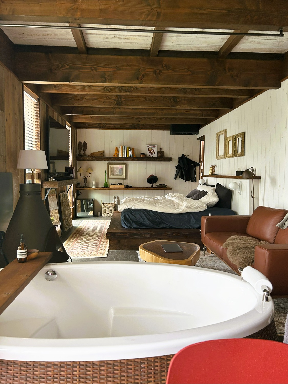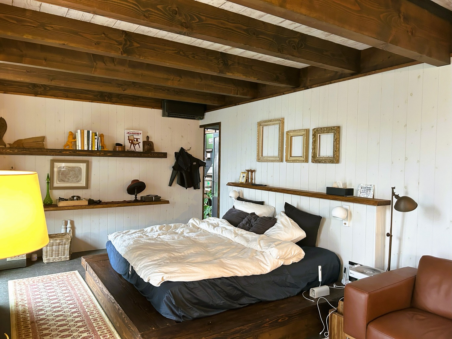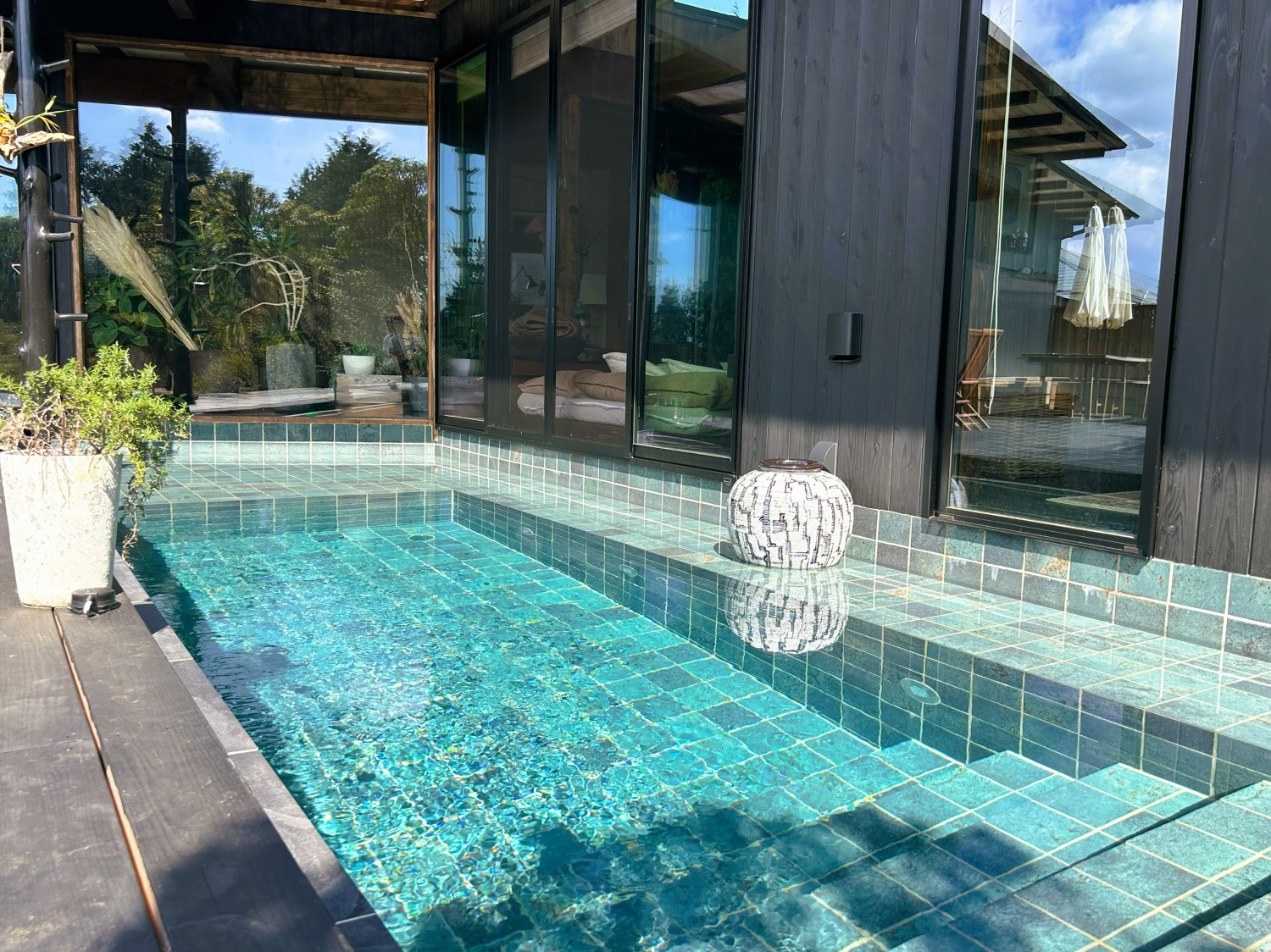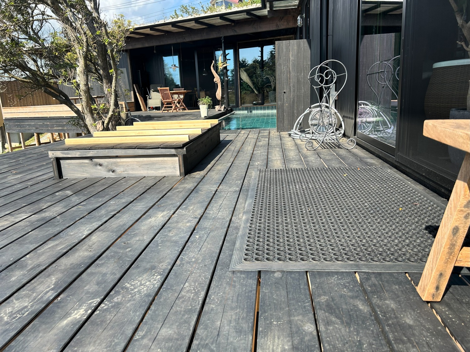 箱根エリアに位置する一軒家スタジオ。都内から車で約90分のアクセスで、芦ノ湖近くの高台に建つセカンドハウスです。外観は黒い板張りでシンプルな印象。敷地内には広い駐車スペースがあり、車両や人物の出入りシーンに対応可能です。建物は庭側の傾斜に沿ってL字型に配置され、どの部屋からもウッドデッキへ出られる設計。大きな窓の先には自然が広がり、西側には富士山を望むこともできます。ウッドデッキには水深の浅いプール、パーティーブース、パラソル、木製テーブル&チェアなどが揃い、すぐに撮影の背景として活用できます。柵を設けないことで最高の抜けを保ちながら、周囲からの視線は遮られているためプライバシーも確保されています。