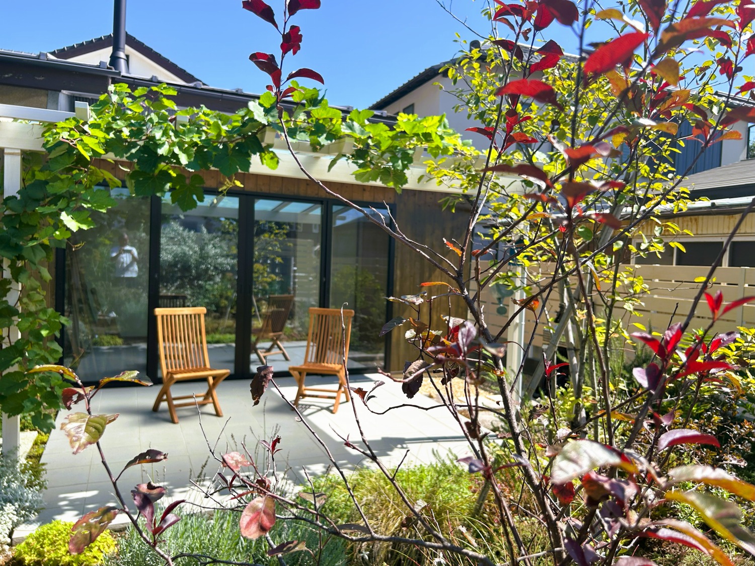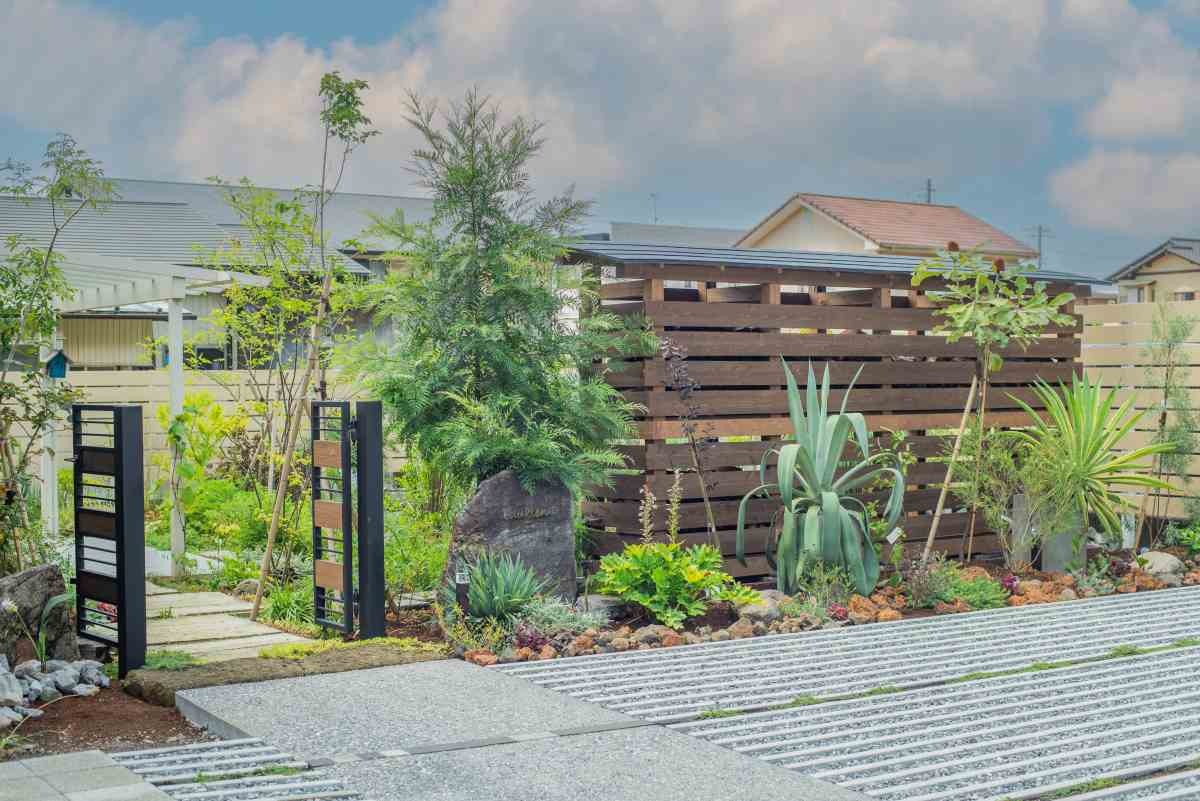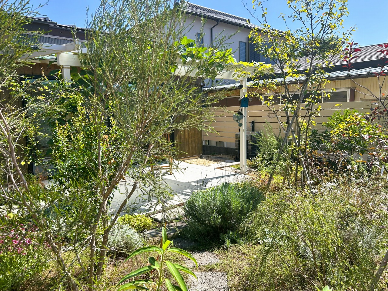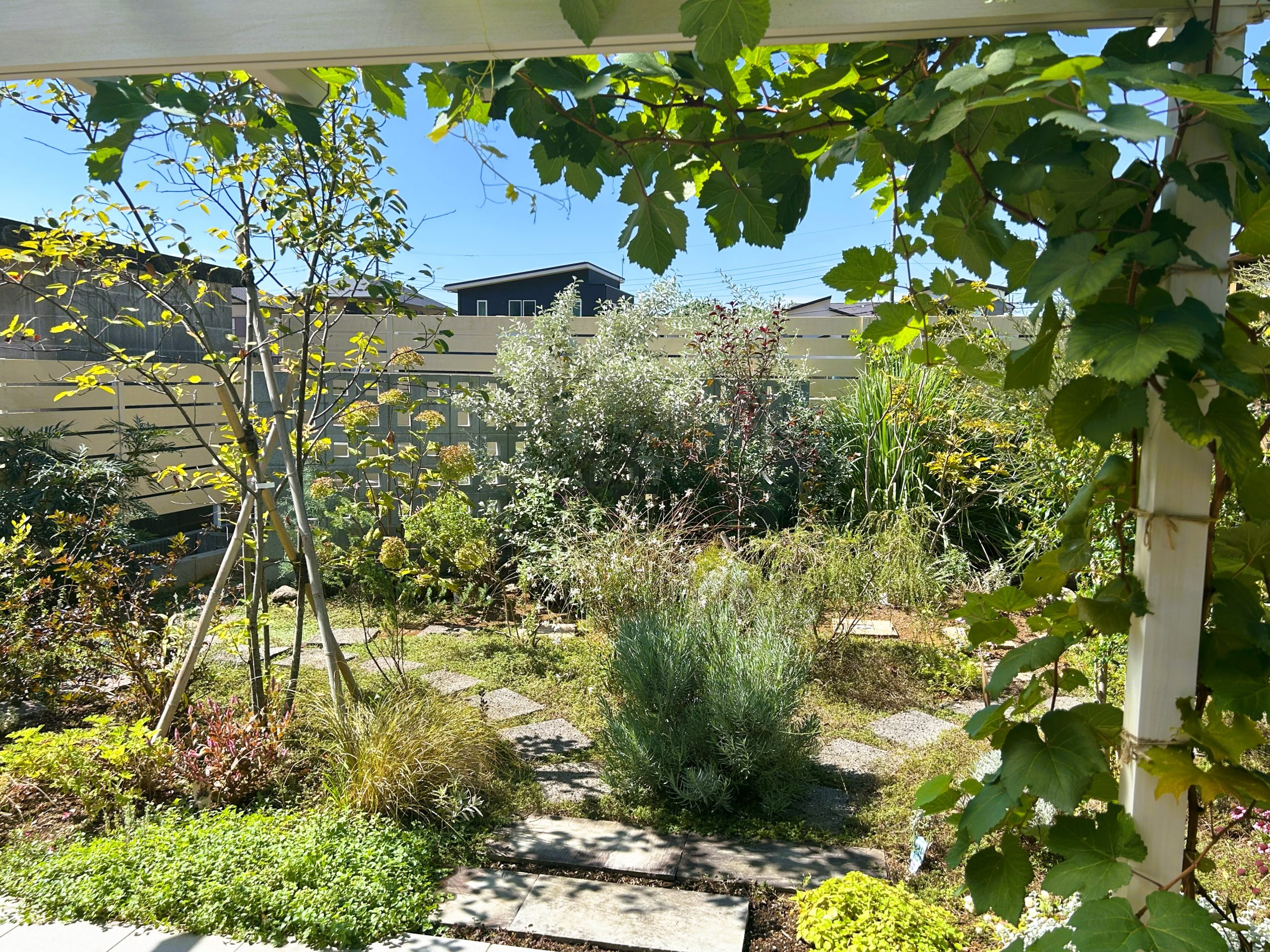 リビングの先に広がる庭は、四季折々の植栽が彩る美しい景観。