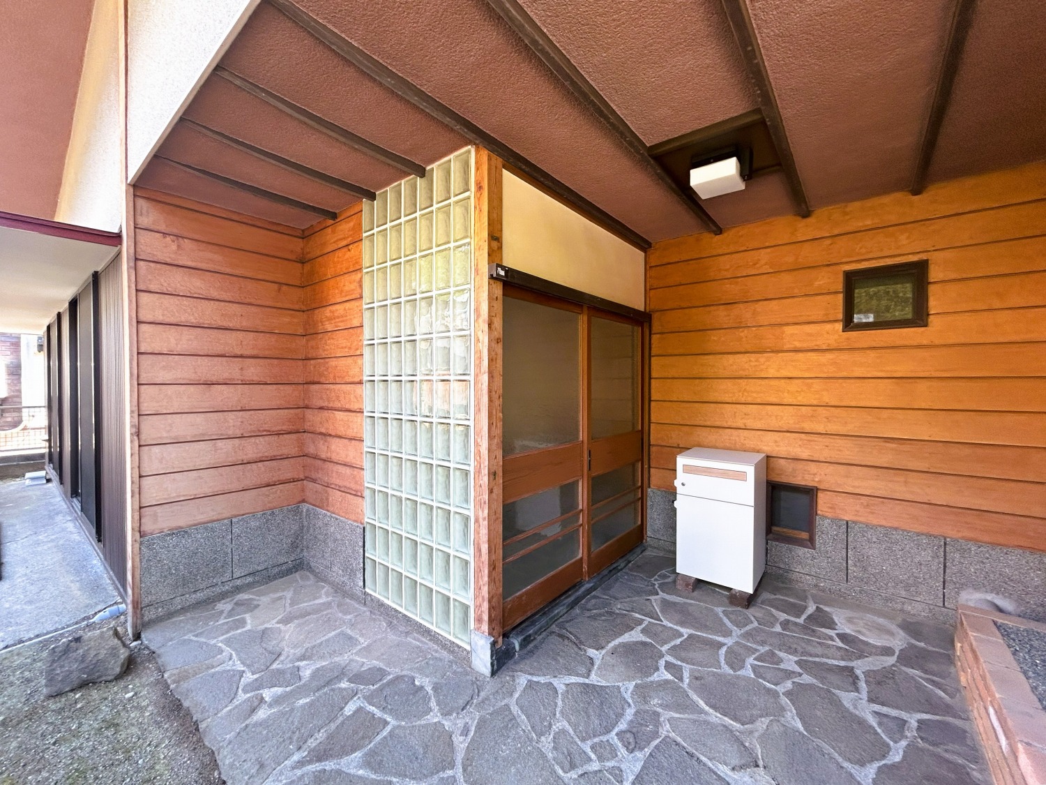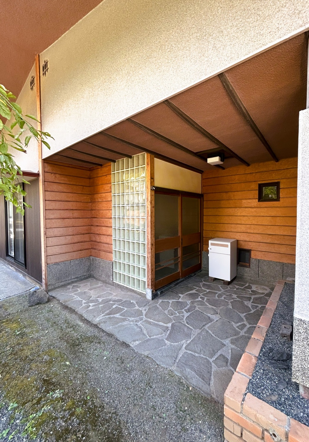 玄関は石張りのアプローチとガラスブロックの明かり壁が印象的。