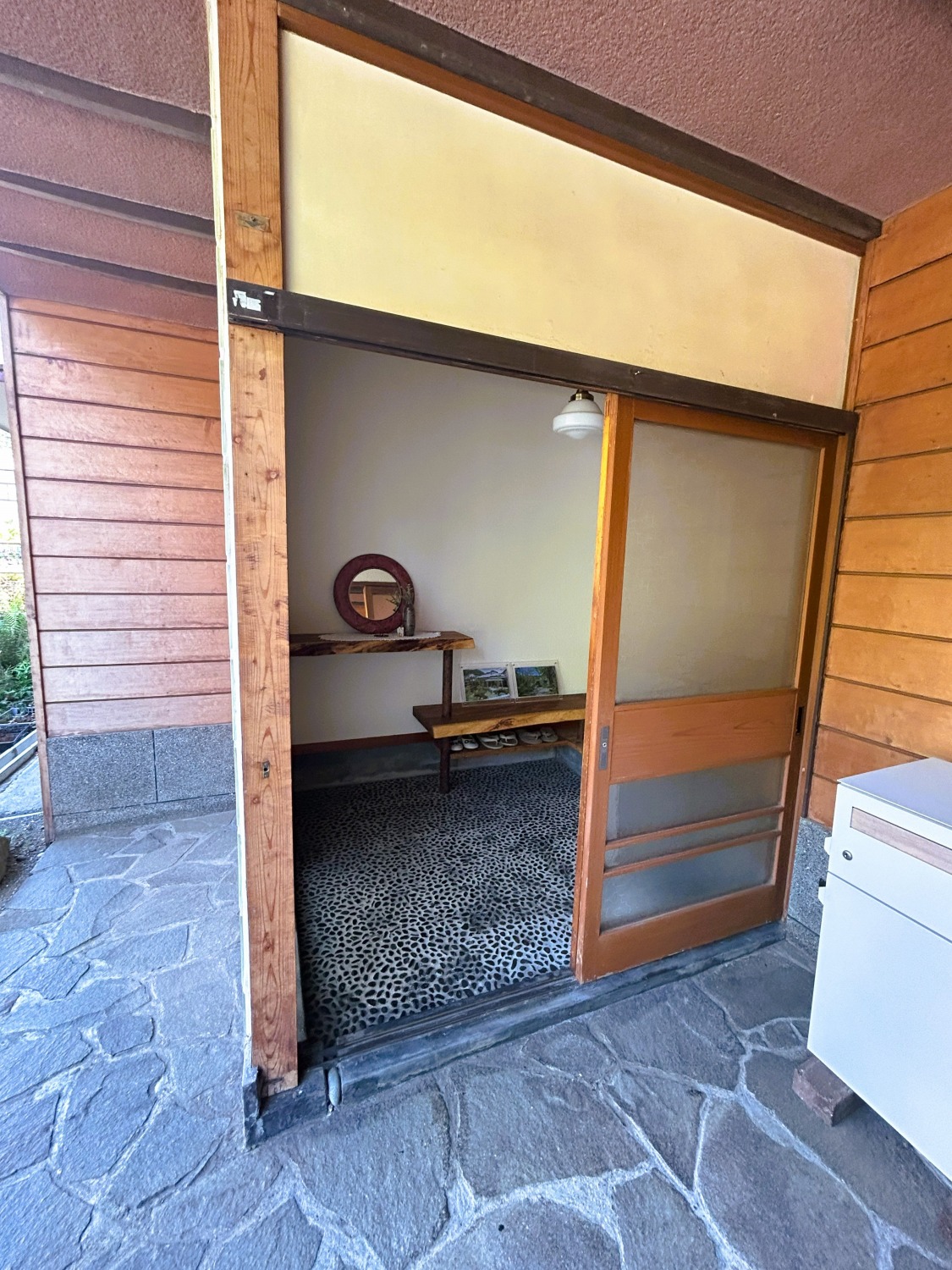 昔ながらの型ガラスの木製ドアから出入りするシーンには、どこか懐かしい情緒があります。