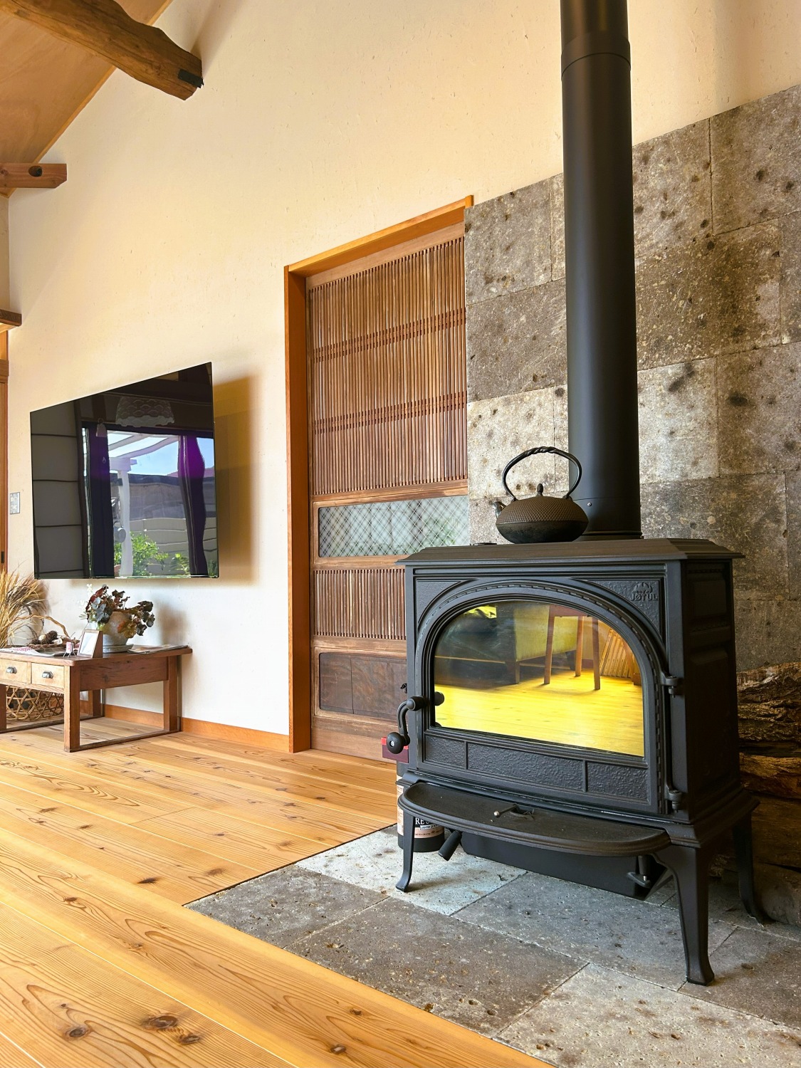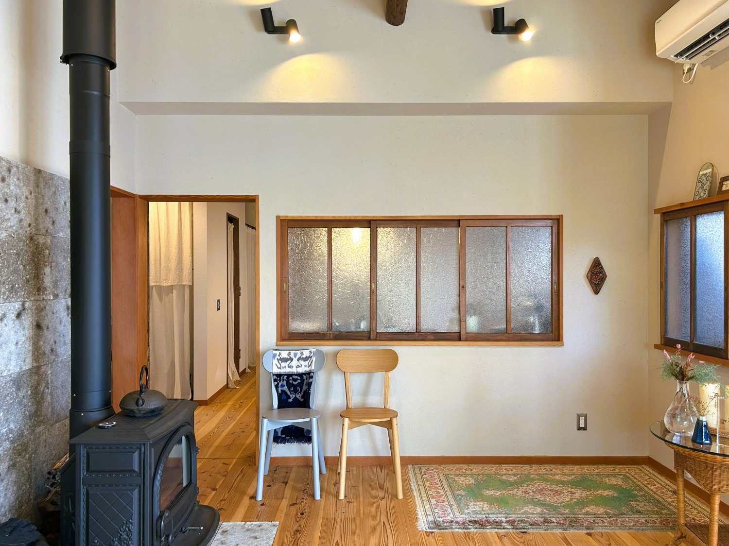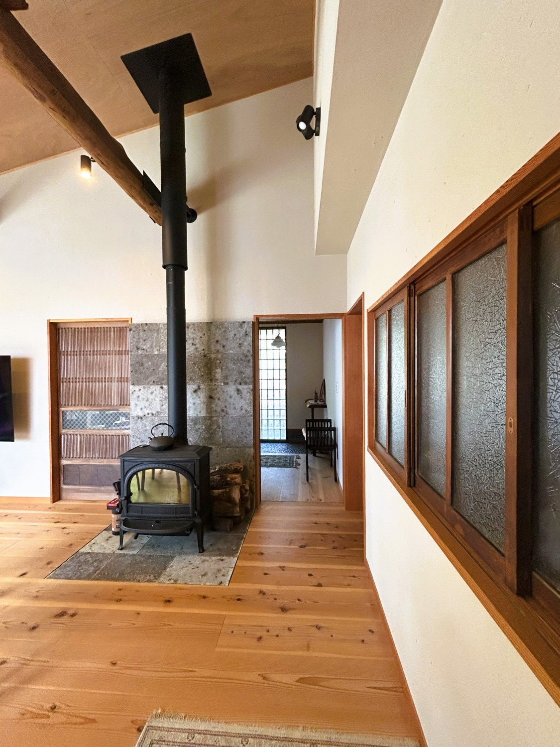 そこに薪ストーブやソファが美しく調和し、全体としてバランスの取れたコーディネートになっています。障子越しの光が床を照らし、ソファでくつろぐシーンや家族が語らうシーンなど、ヒト・モノいずれの撮影にも向いています。そして、天井を横断する濃茶の梁がこの優しい空間をほどよく引き締め、構図に深みを与えています。
