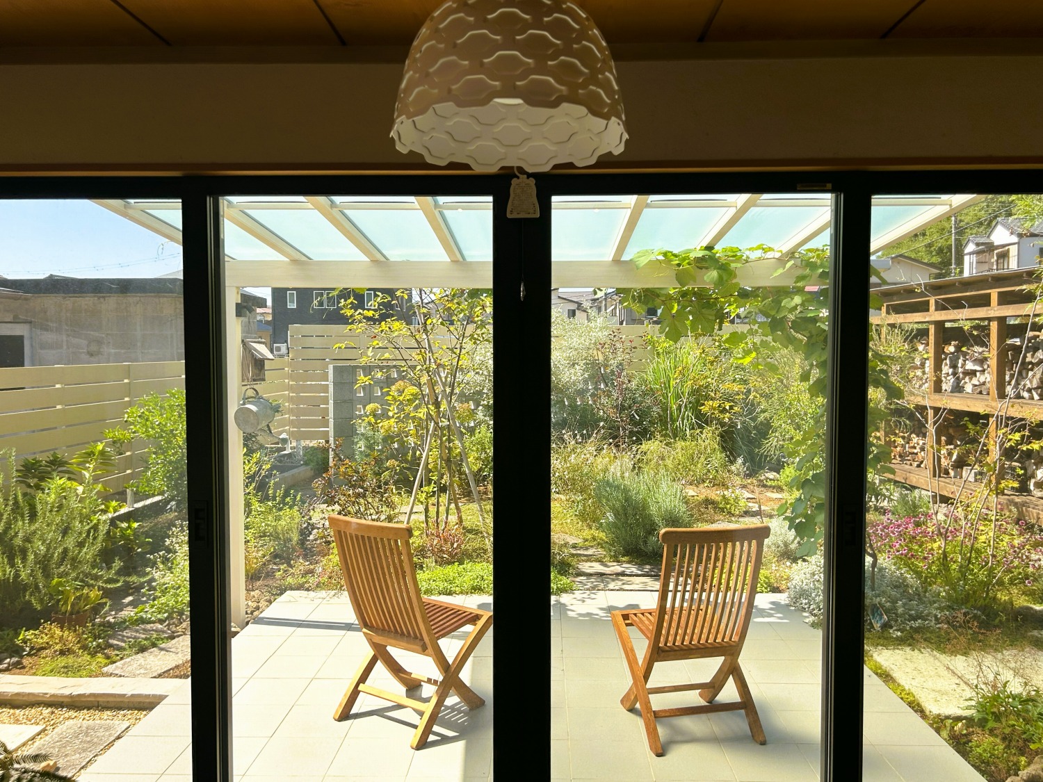 テラスに置かれたチェアやグリーンが光を受けてきらめき、庭を眺める姿や、植物を手入れする何気ない動作までもが印象的に映ります。