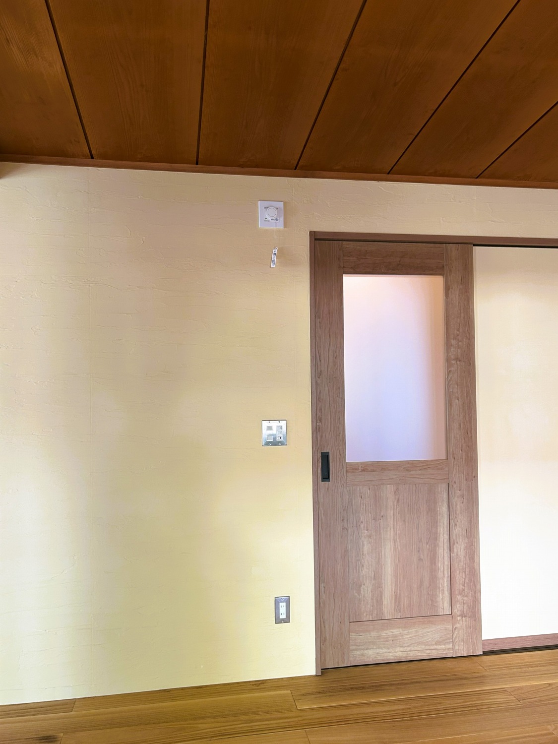 入口には風合いの良い木製建具、壁は丁寧な左官仕上げ、床は木目と節を生かしたフローリング。