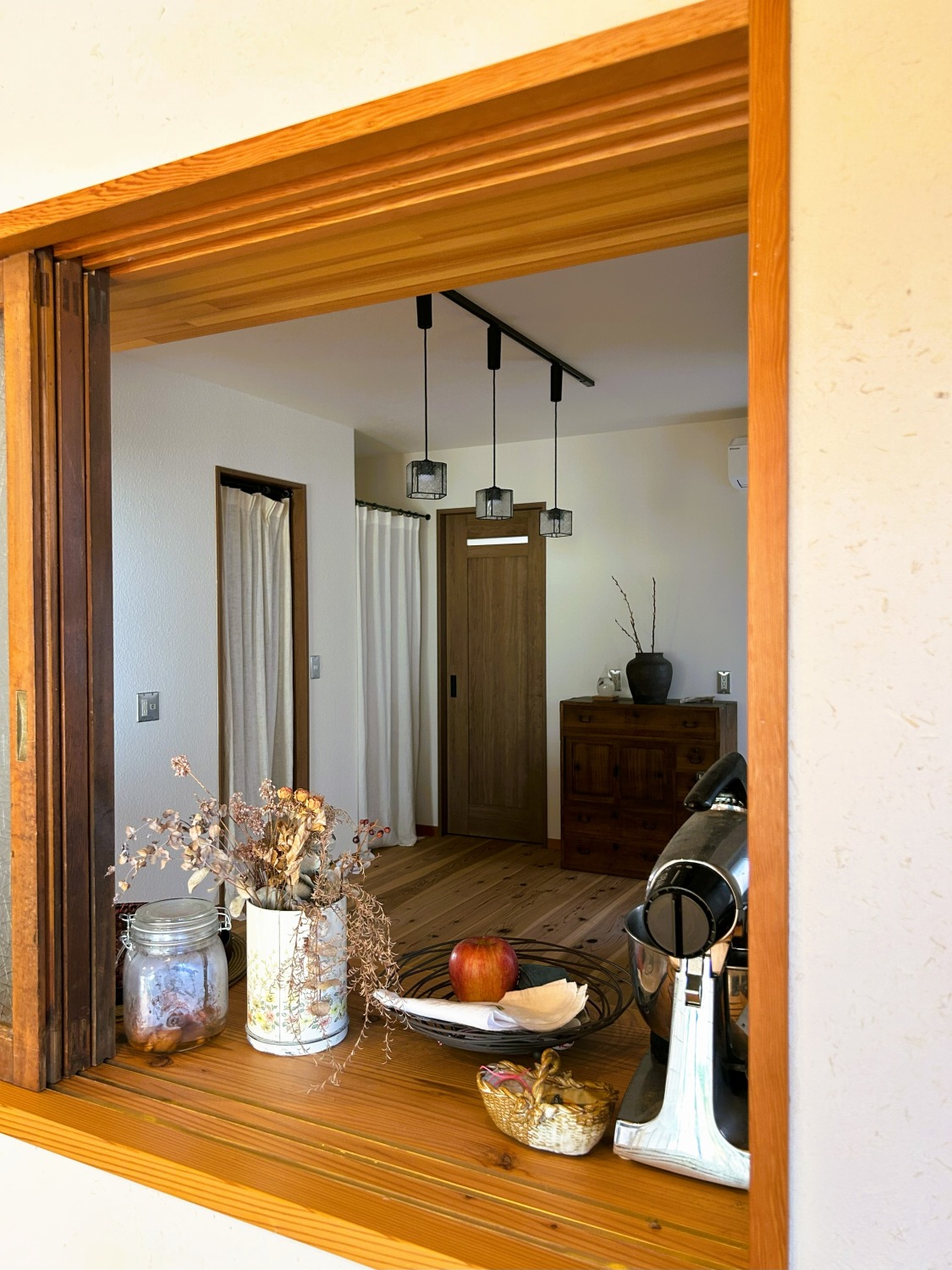 また、リビングとキッチンをつなぐ木製枠の中窓が印象的で、出来上がった料理を中窓からリビングへ手渡すシーンなど、生活感のあるストーリーを自然に演出できます。