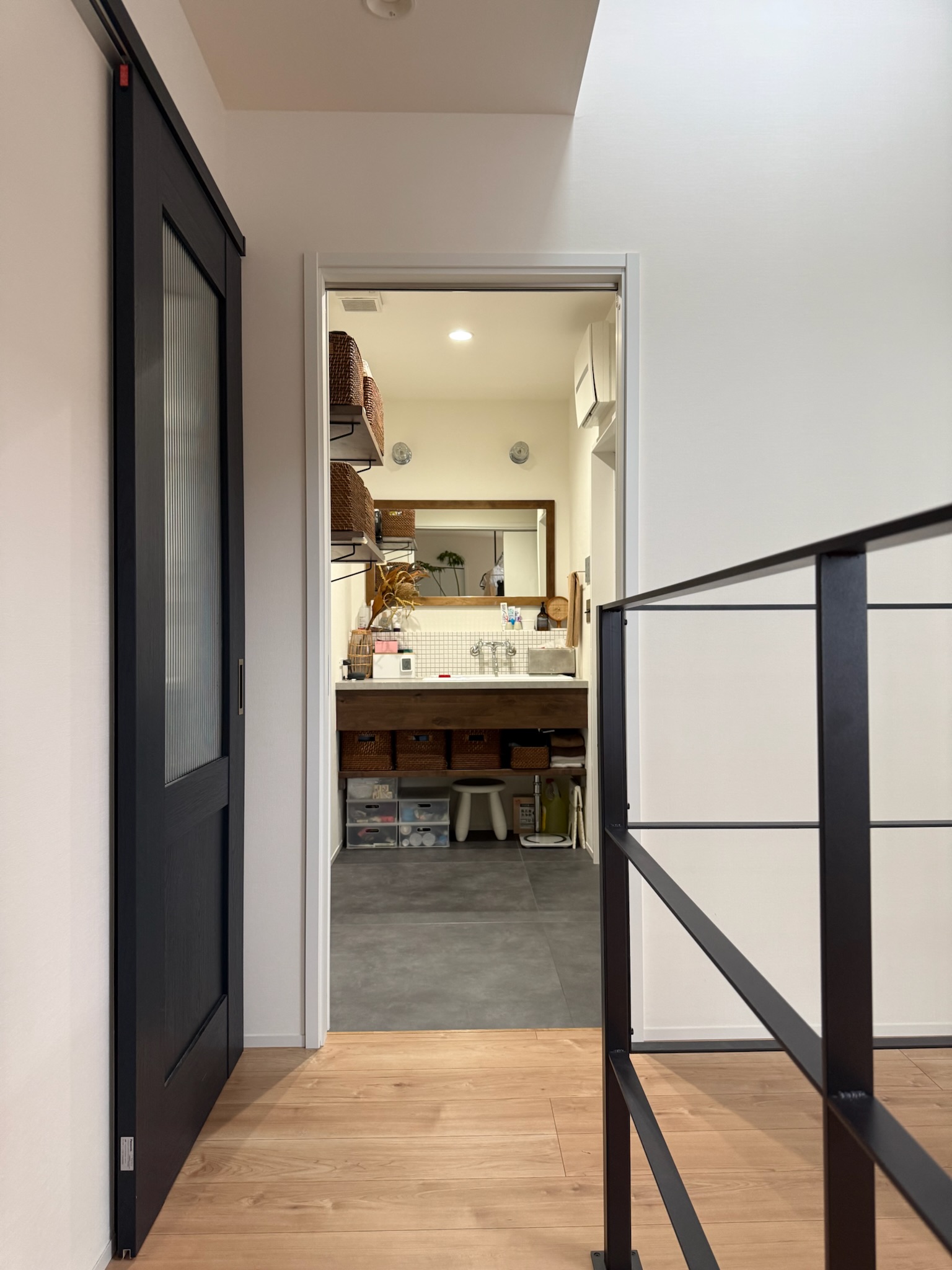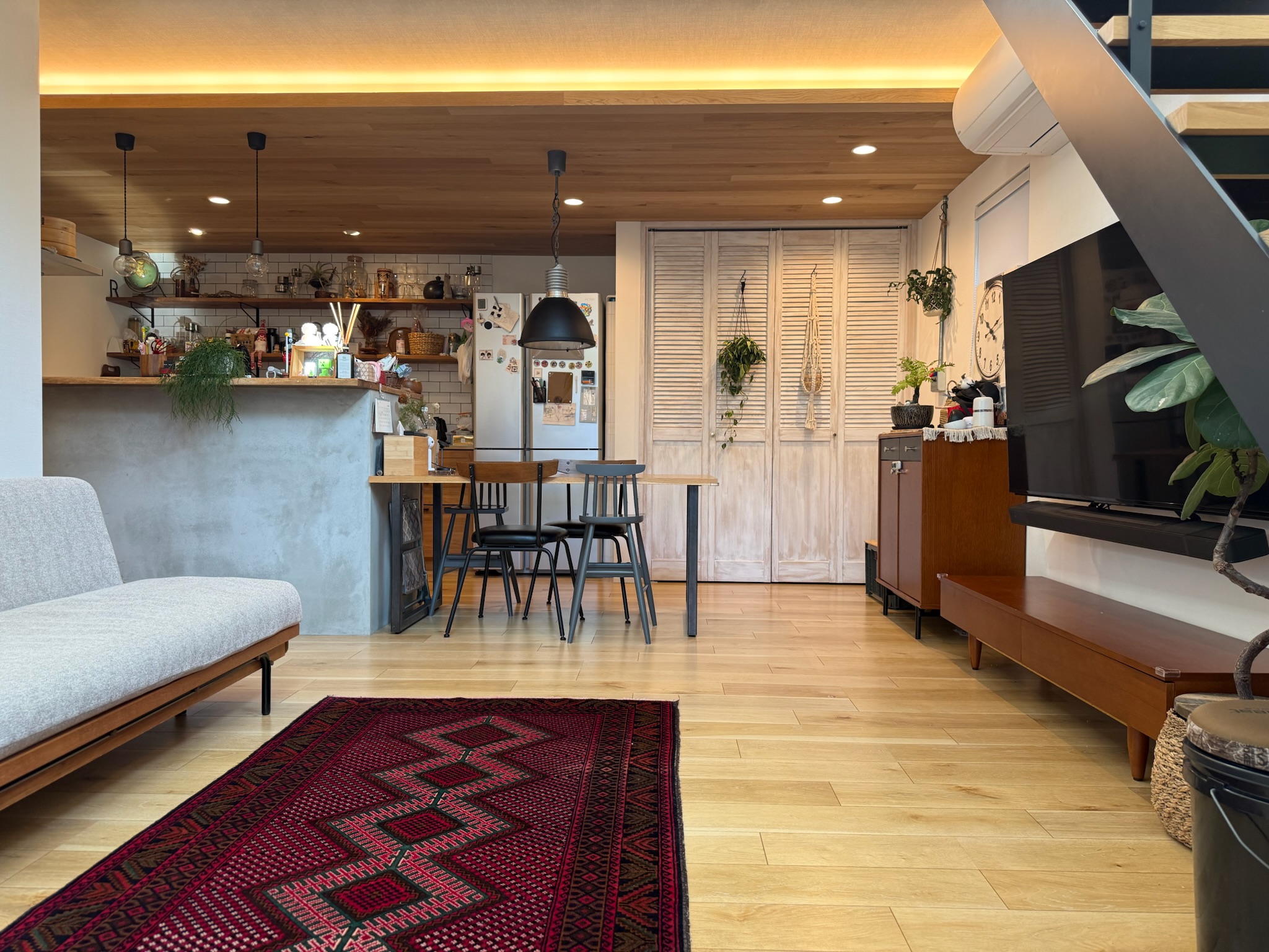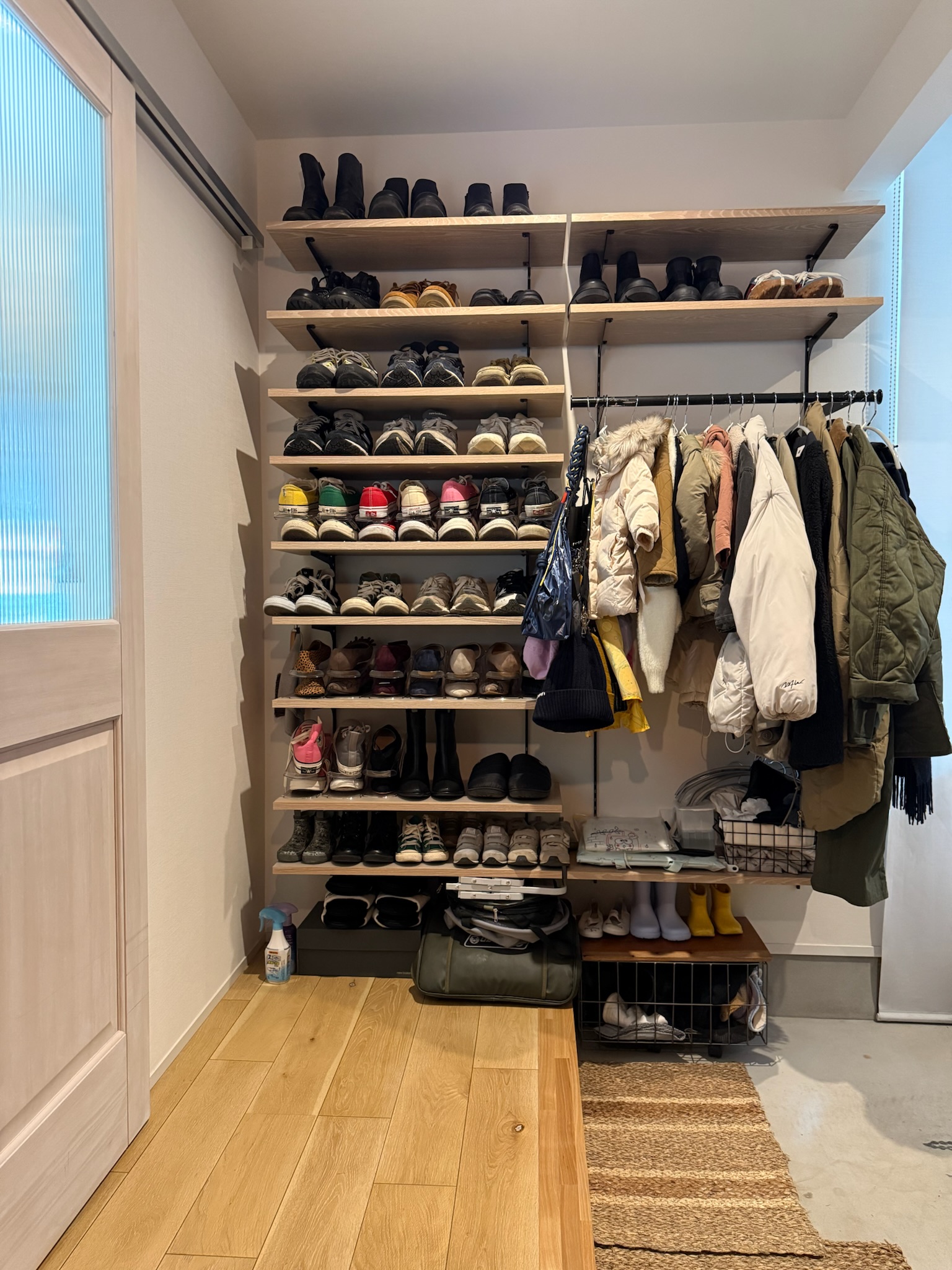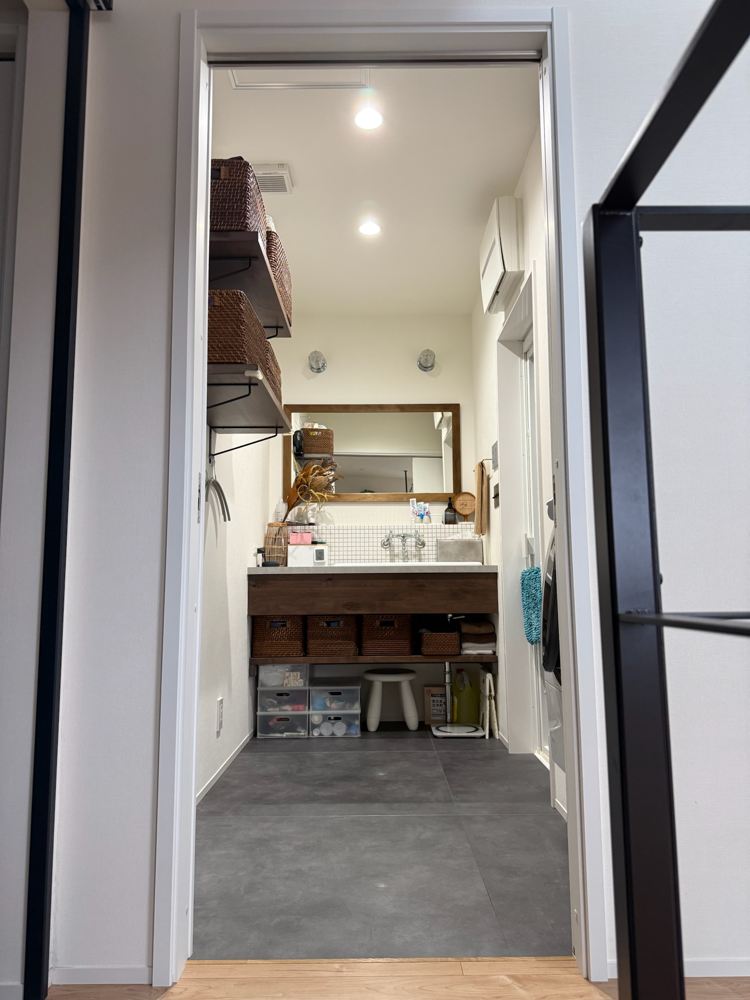 玄関を入ると、キッチン側とリビング側の両方向へと繋がる土間スペースが設けられており、靴やアウターを見せる収納として構成されています。生活導線の一部でありながら、画づくりにも使いやすい空間です。