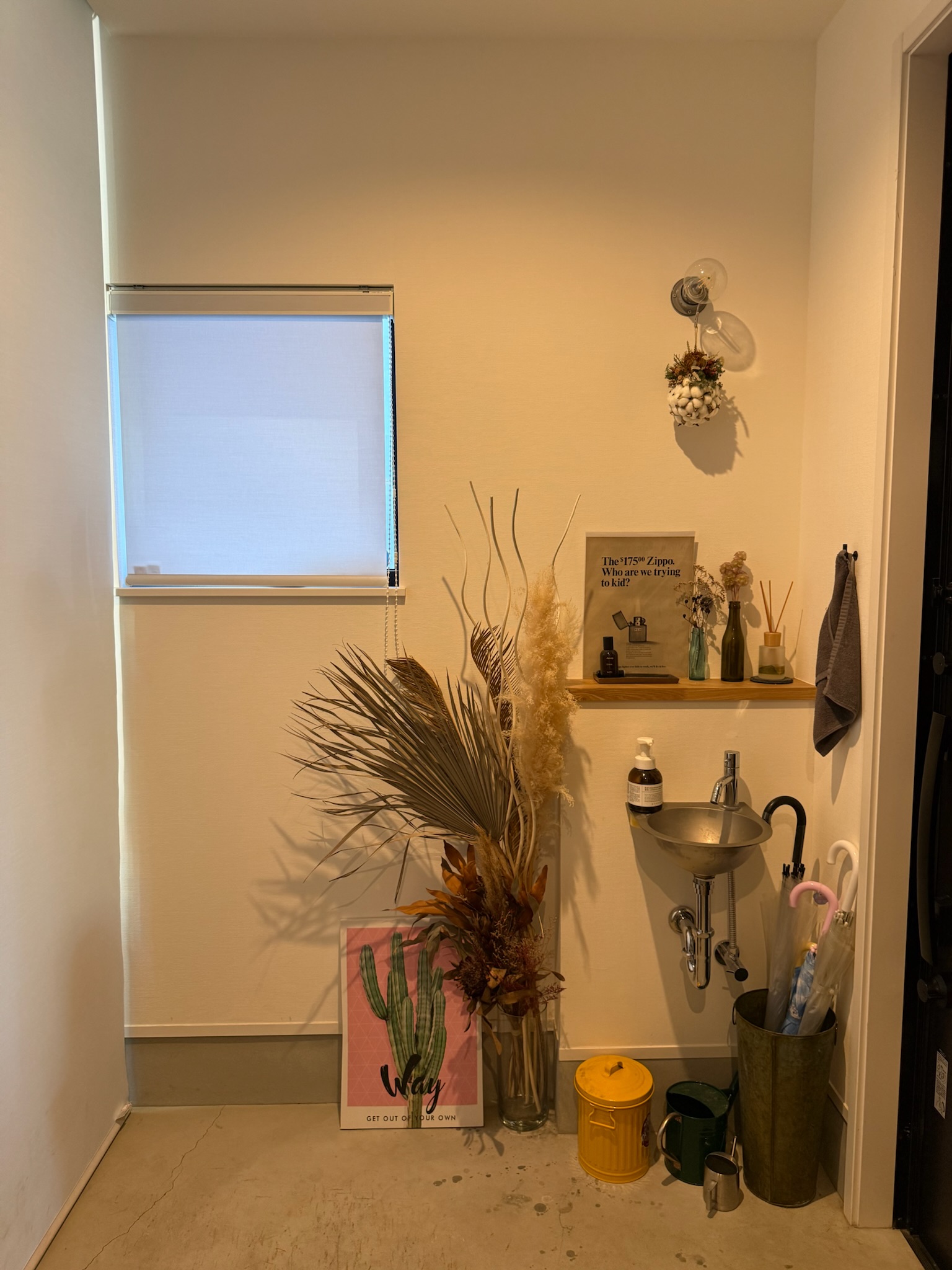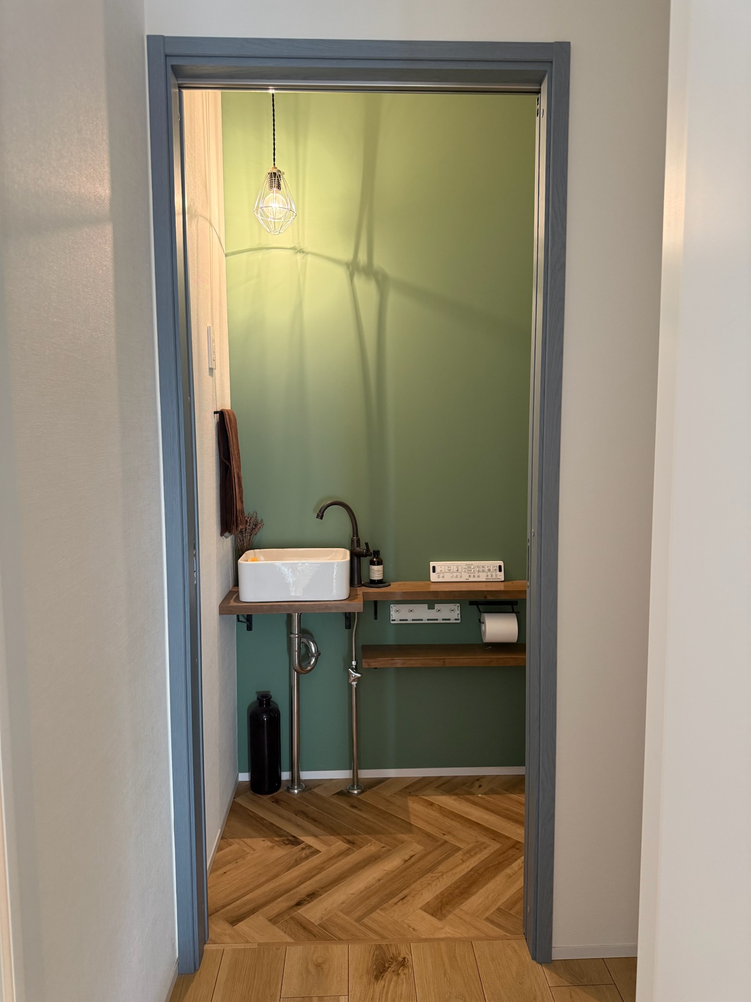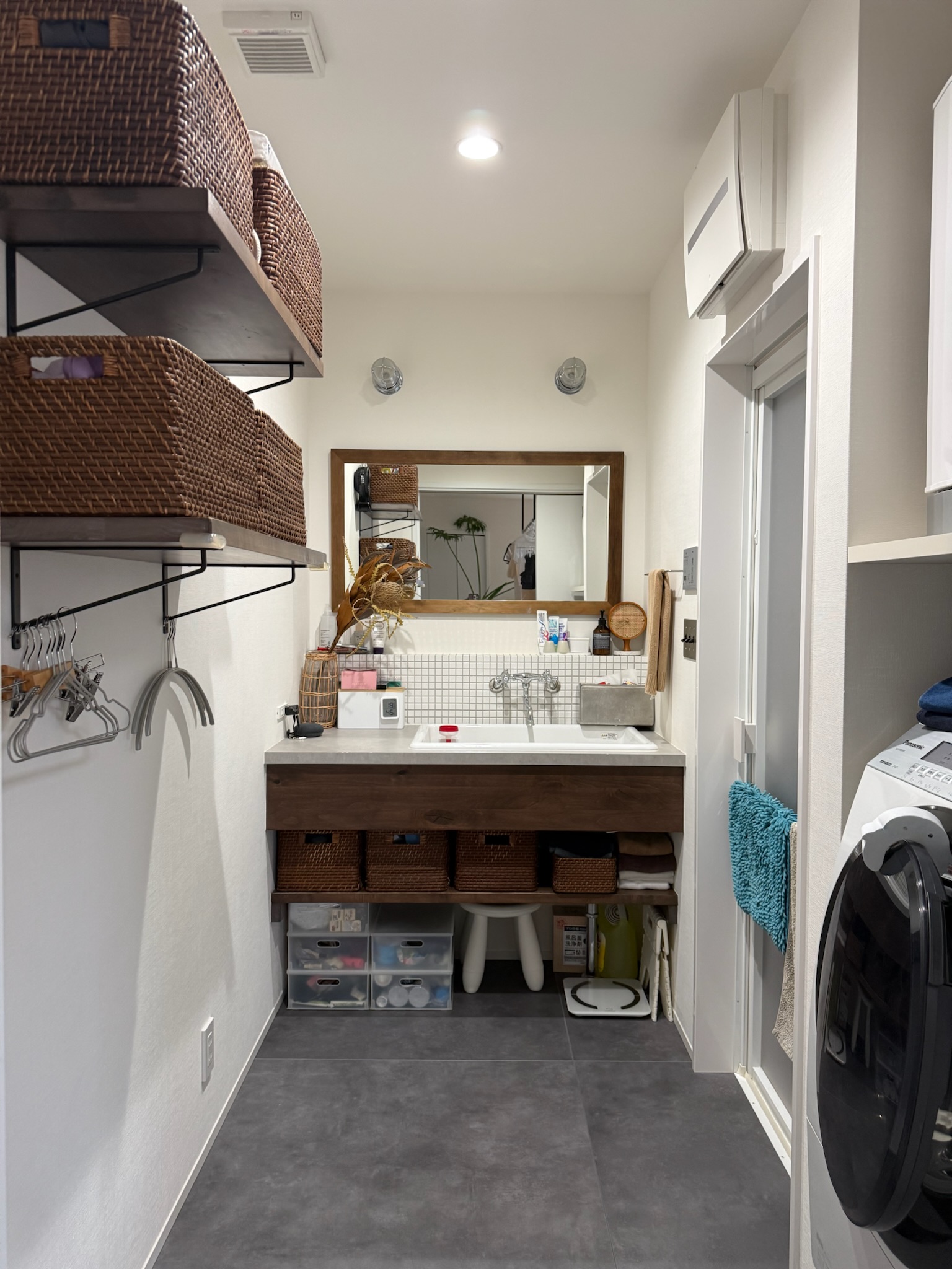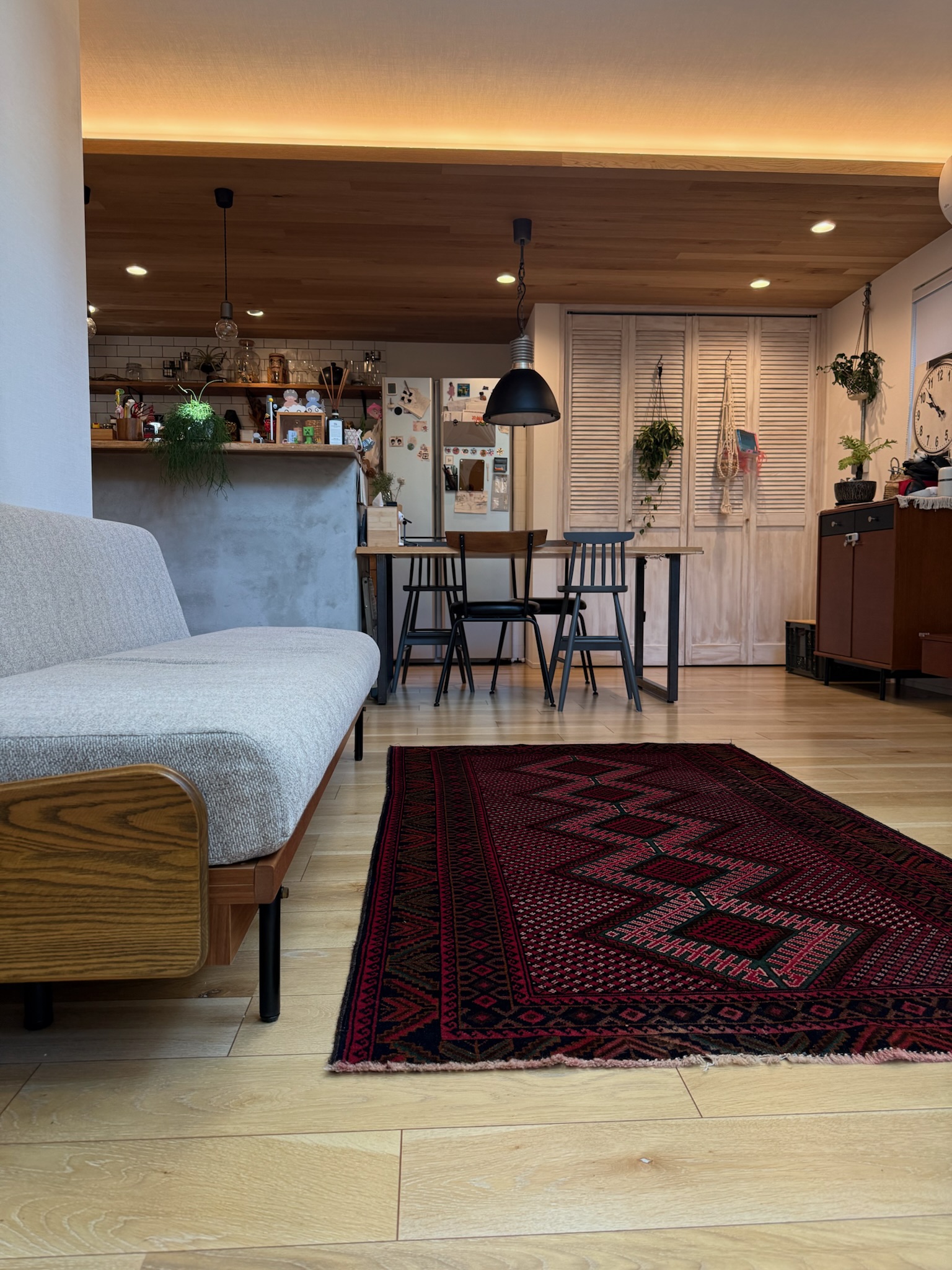 玄関を入ると、キッチン側とリビング側の両方向へと繋がる土間スペースが設けられており、靴やアウターを見せる収納として構成されています。生活導線の一部でありながら、画づくりにも使いやすい空間です。