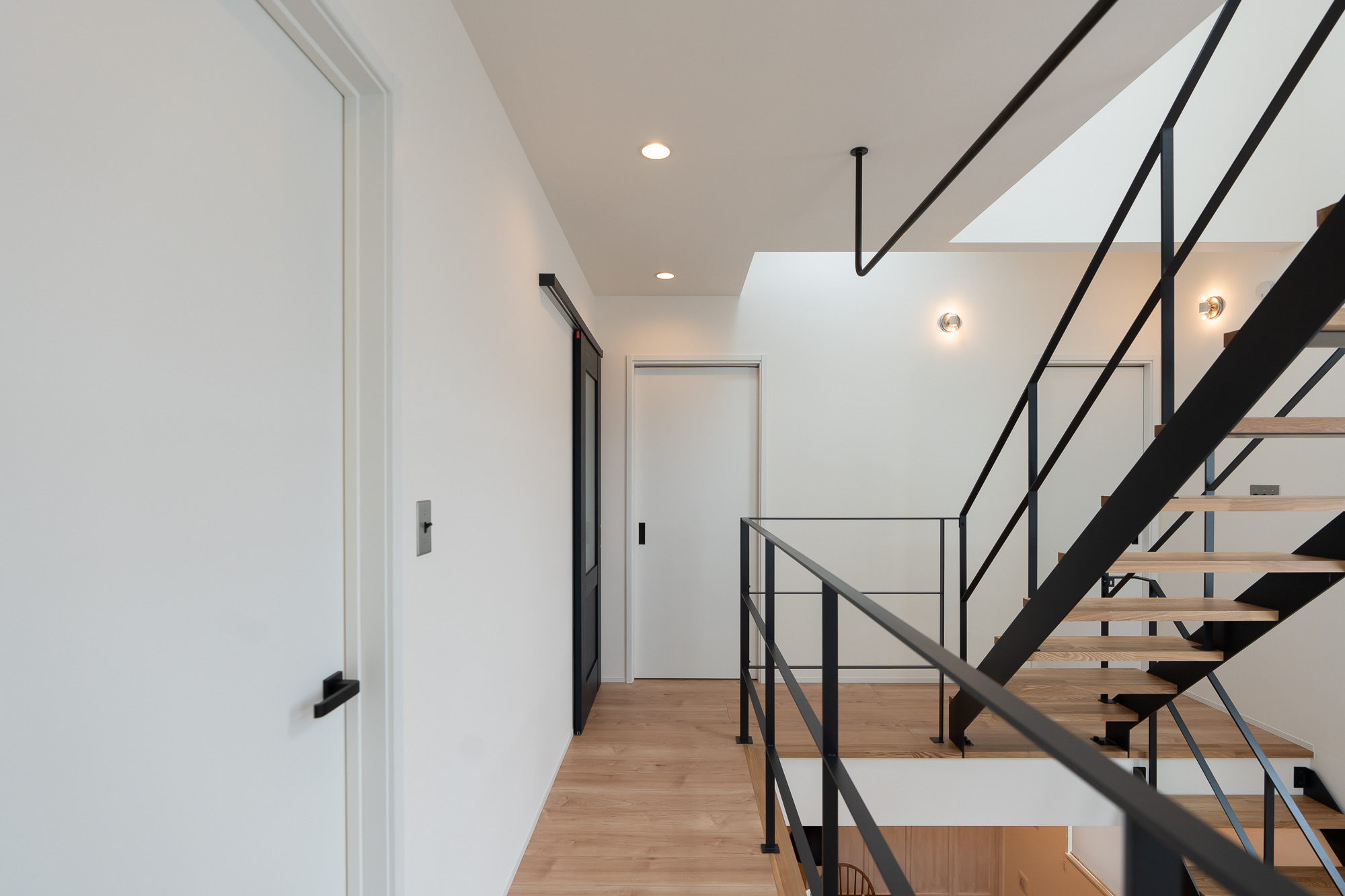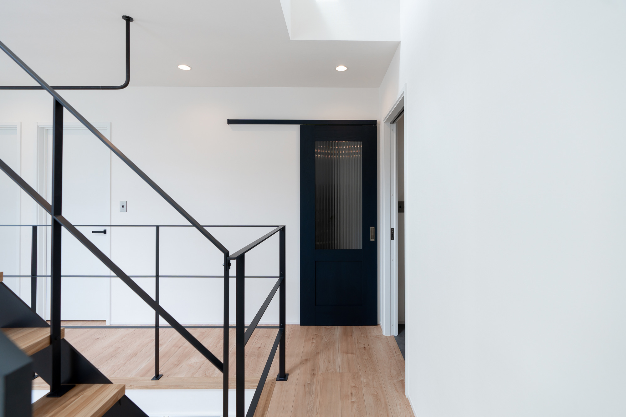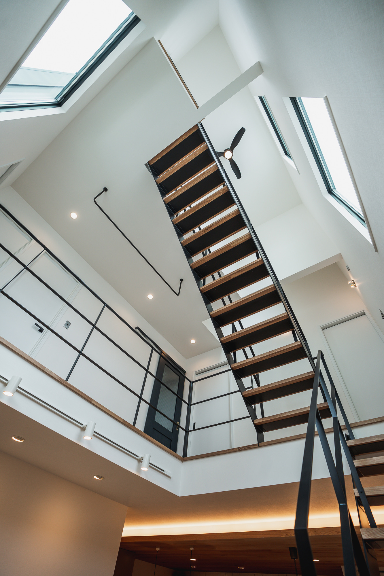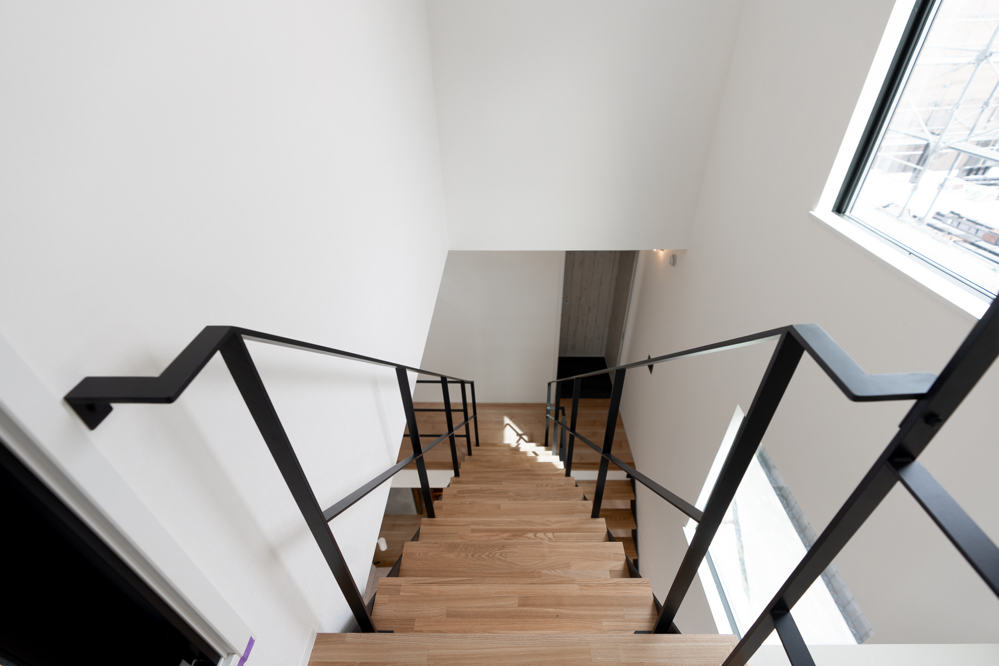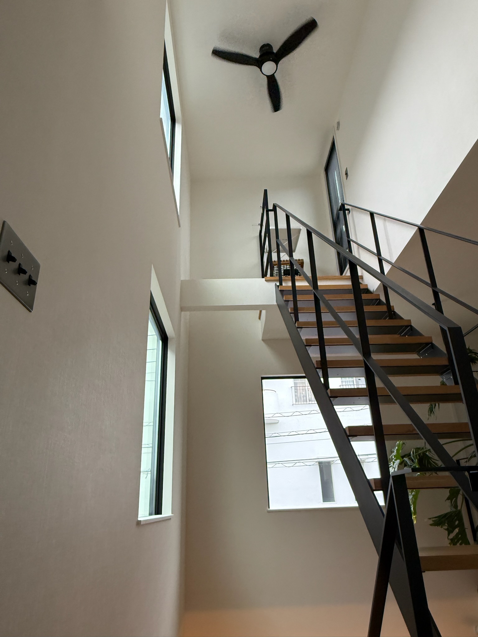 撮影のメインとなるのは1階のLDK。リビングは吹き抜け構成で、天井高は3層分を確保。上下階を含めたワンカットの構図や、上階からの俯瞰撮影にも対応できます。黒いアイアン製の階段が白を基調とした空間を引き締め、インダストリアルなフレームとして画面のアクセントになります。