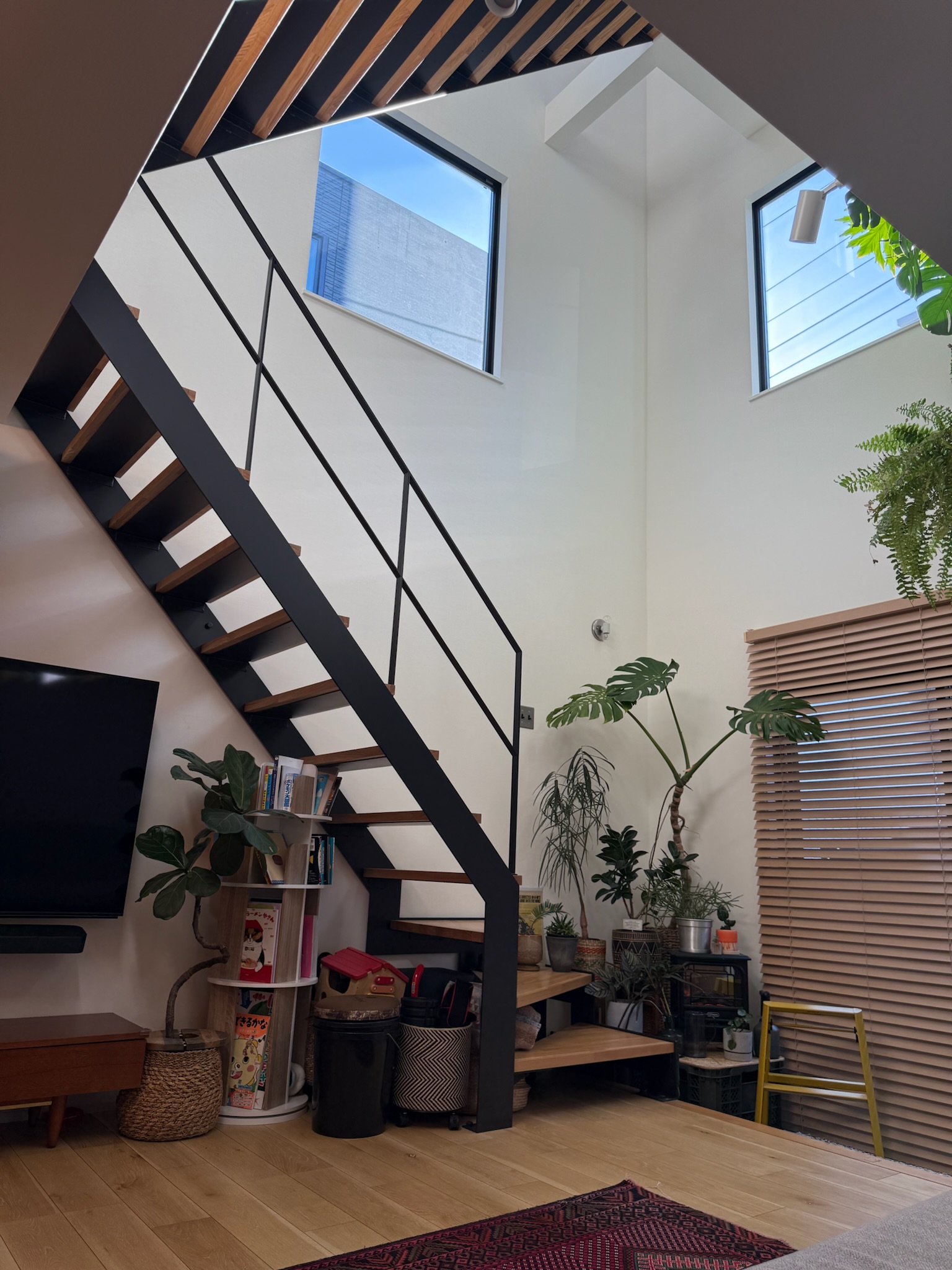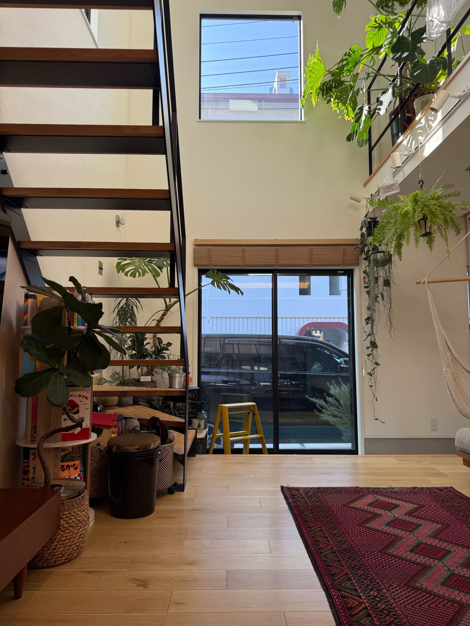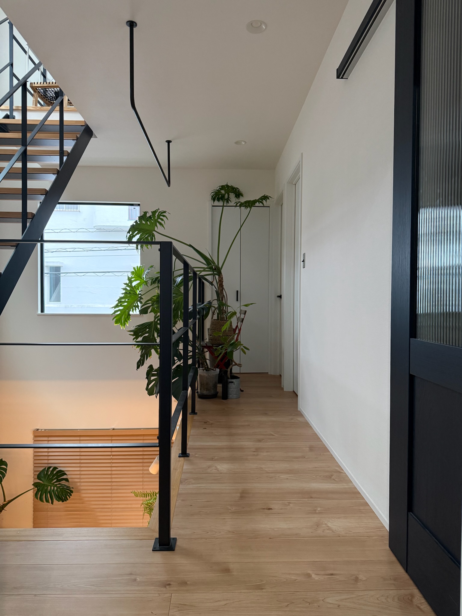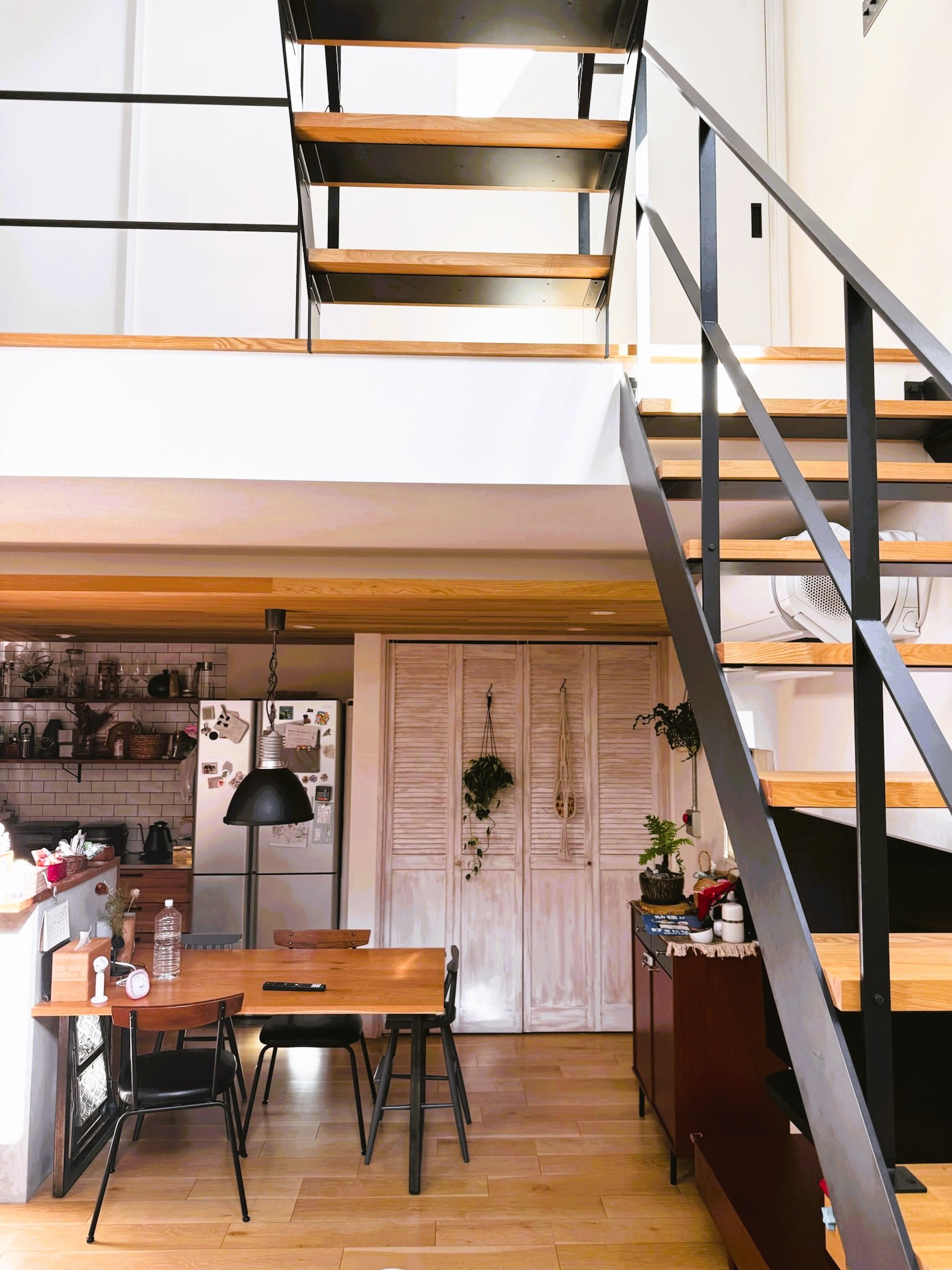 撮影のメインとなるのは1階のLDK。リビングは吹き抜け構成で、天井高は3層分を確保。上下階を含めたワンカットの構図や、上階からの俯瞰撮影にも対応できます。黒いアイアン製の階段が白を基調とした空間を引き締め、インダストリアルなフレームとして画面のアクセントになります。