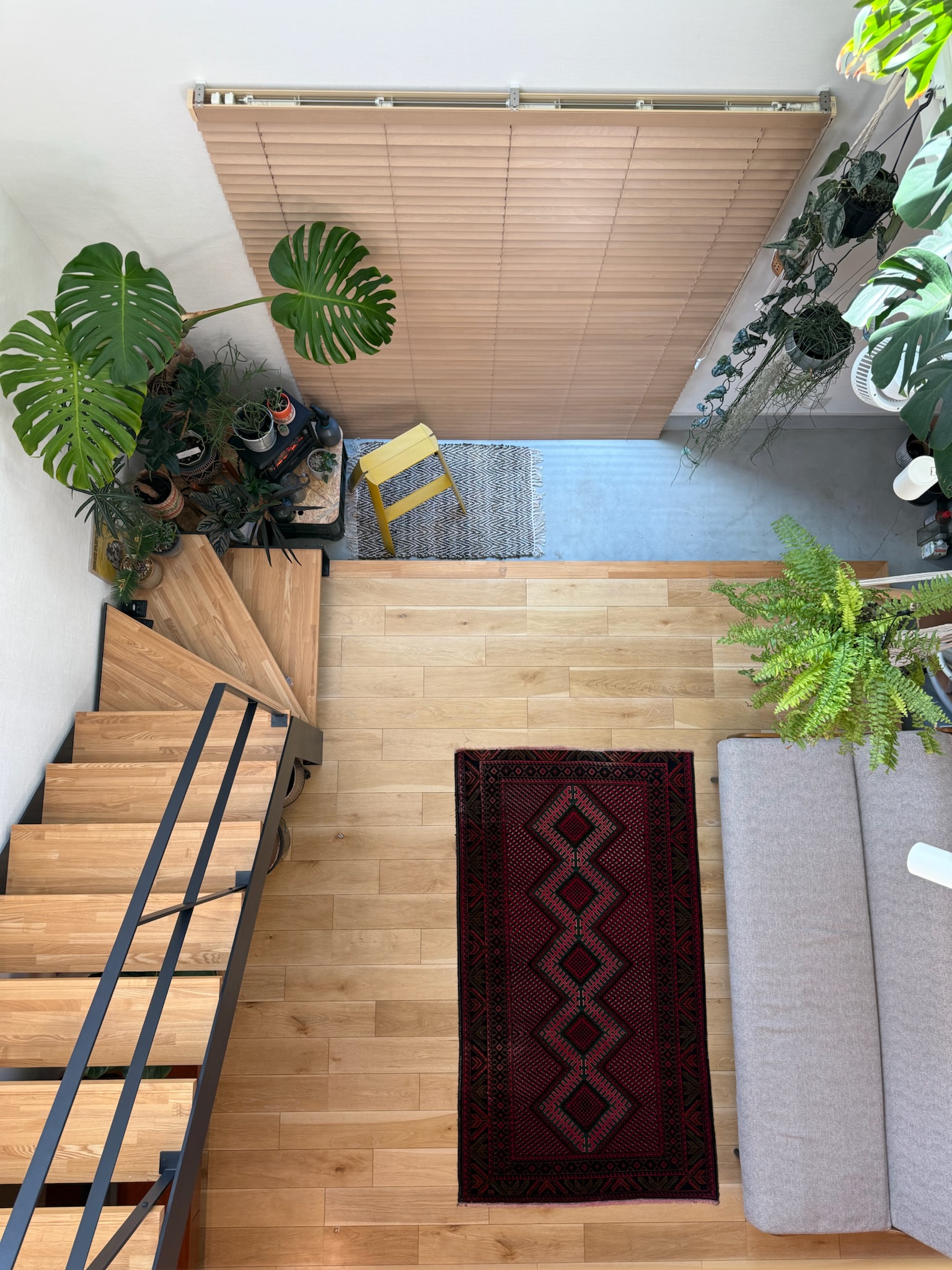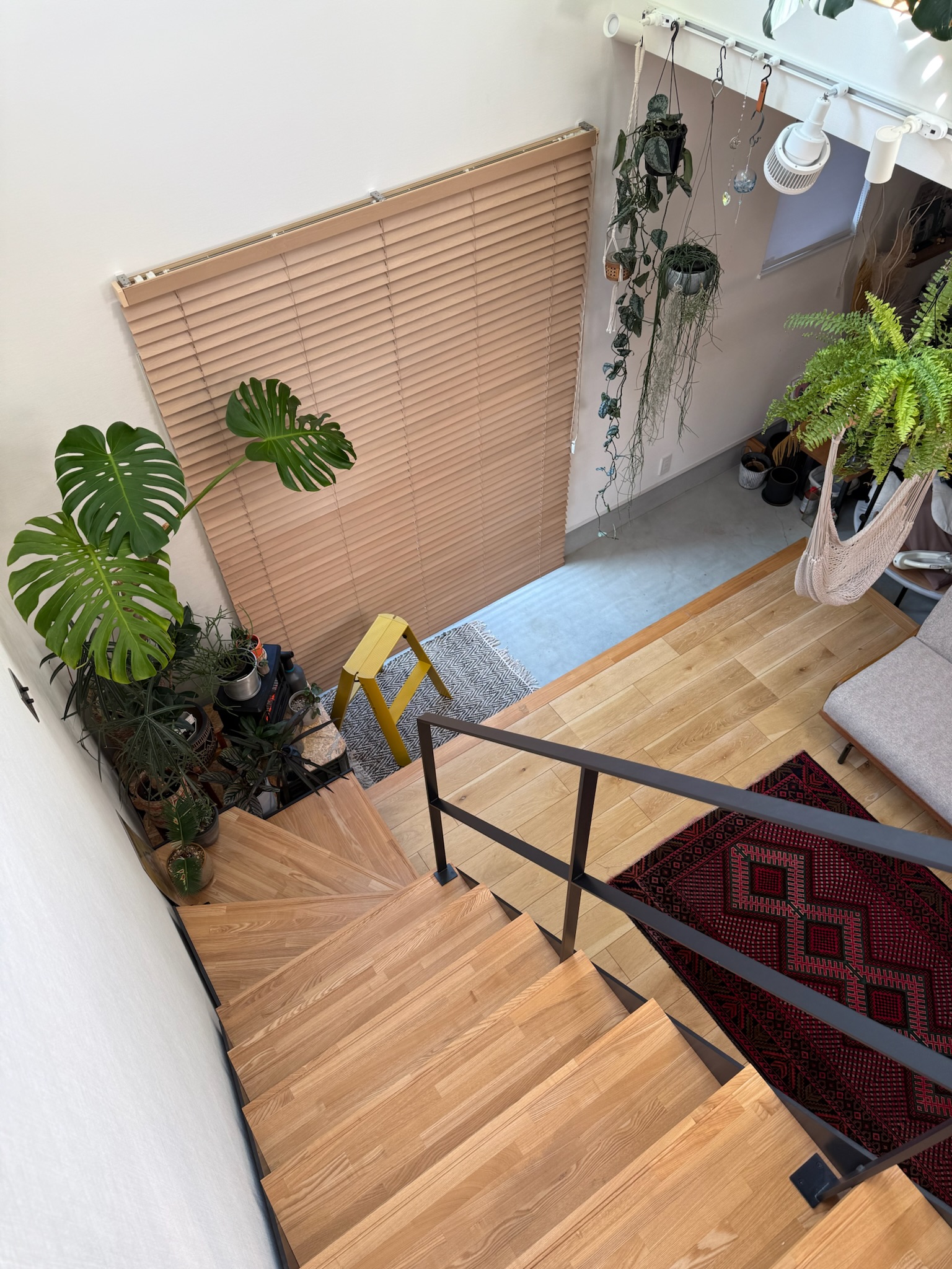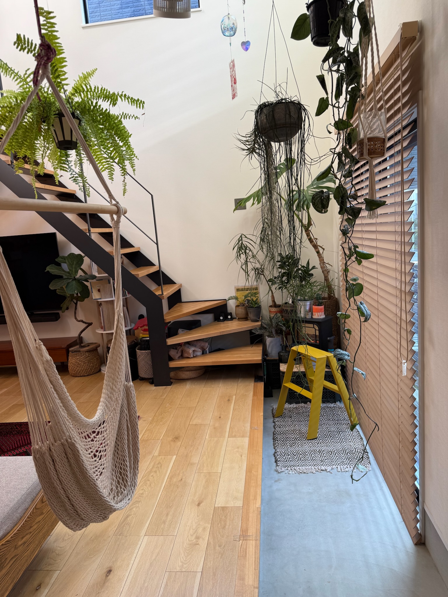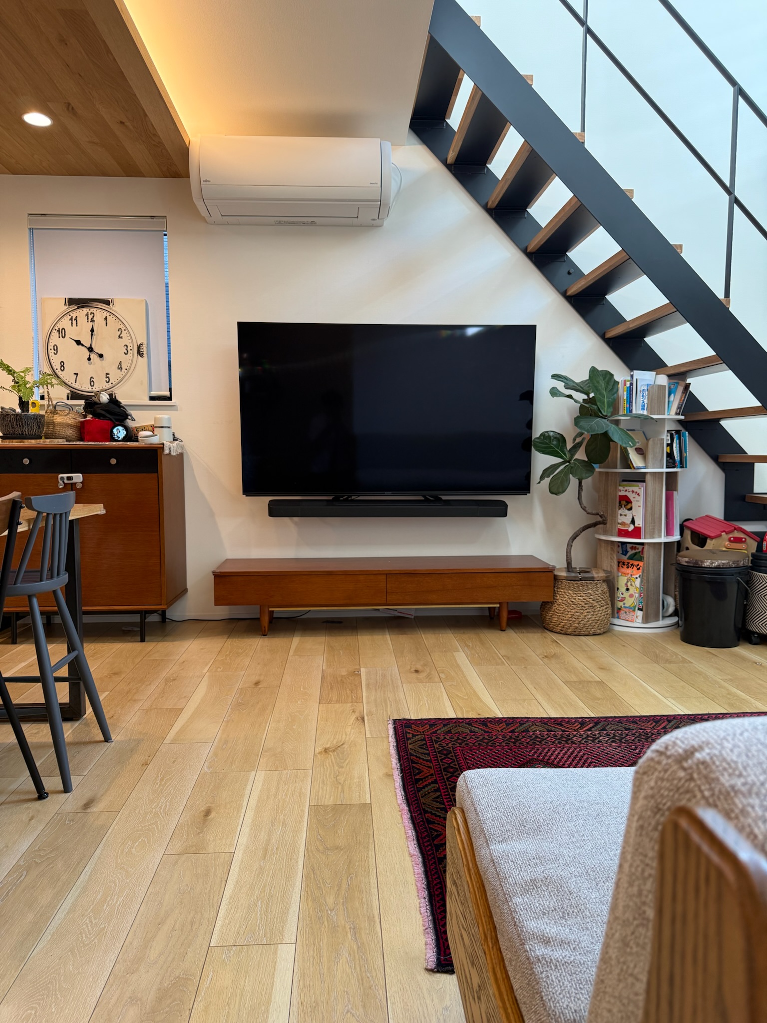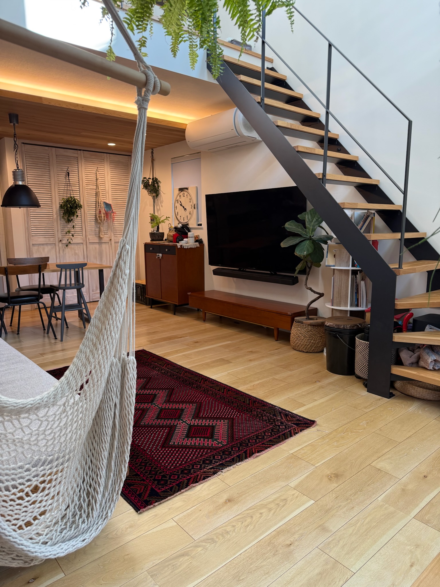 撮影のメインとなるのは1階のLDK。リビングは吹き抜け構成で、天井高は3層分を確保。上下階を含めたワンカットの構図や、上階からの俯瞰撮影にも対応できます。黒いアイアン製の階段が白を基調とした空間を引き締め、インダストリアルなフレームとして画面のアクセントになります。