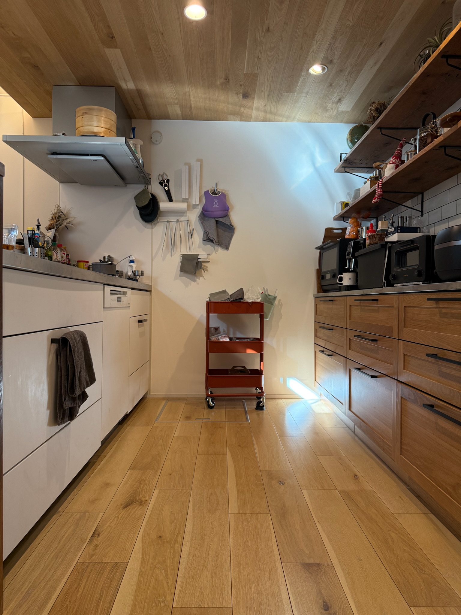キッチンは天井・床ともにフローリング仕上げ。古材のカウンターやエイジング加工を施した建具を取り入れ、ヴィンテージ感のある空間です。前列のキッチンカウンターと後列の棚との間隔が広く、演者が動きながらの調理シーンや、2人作業を横位置から撮影しやすい構成となっています。